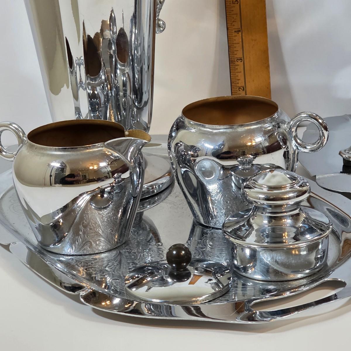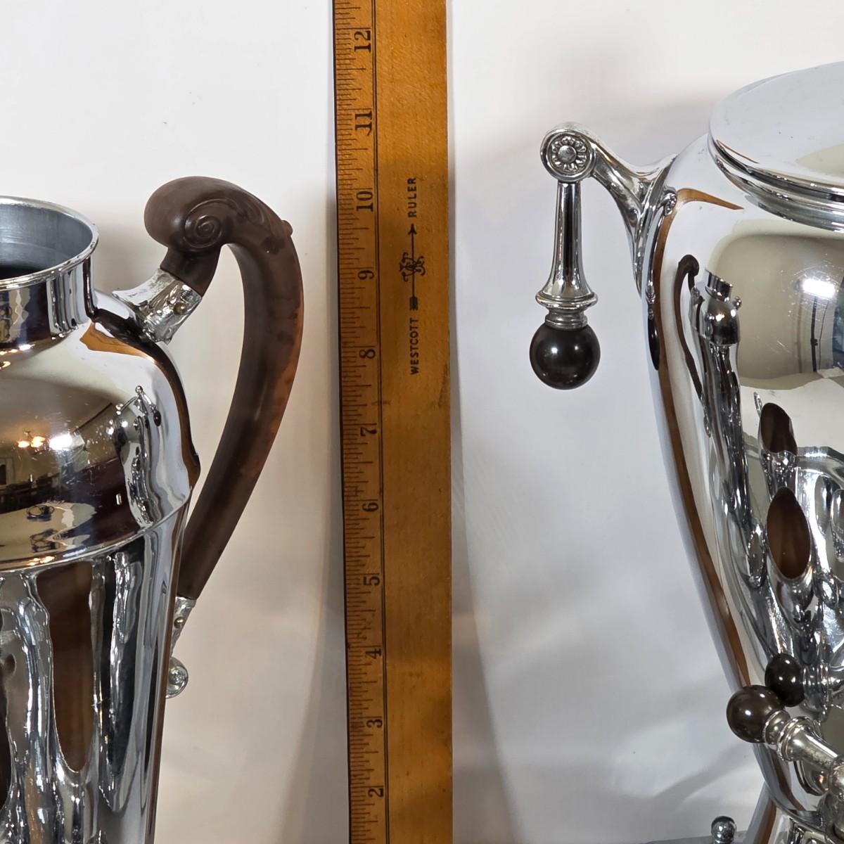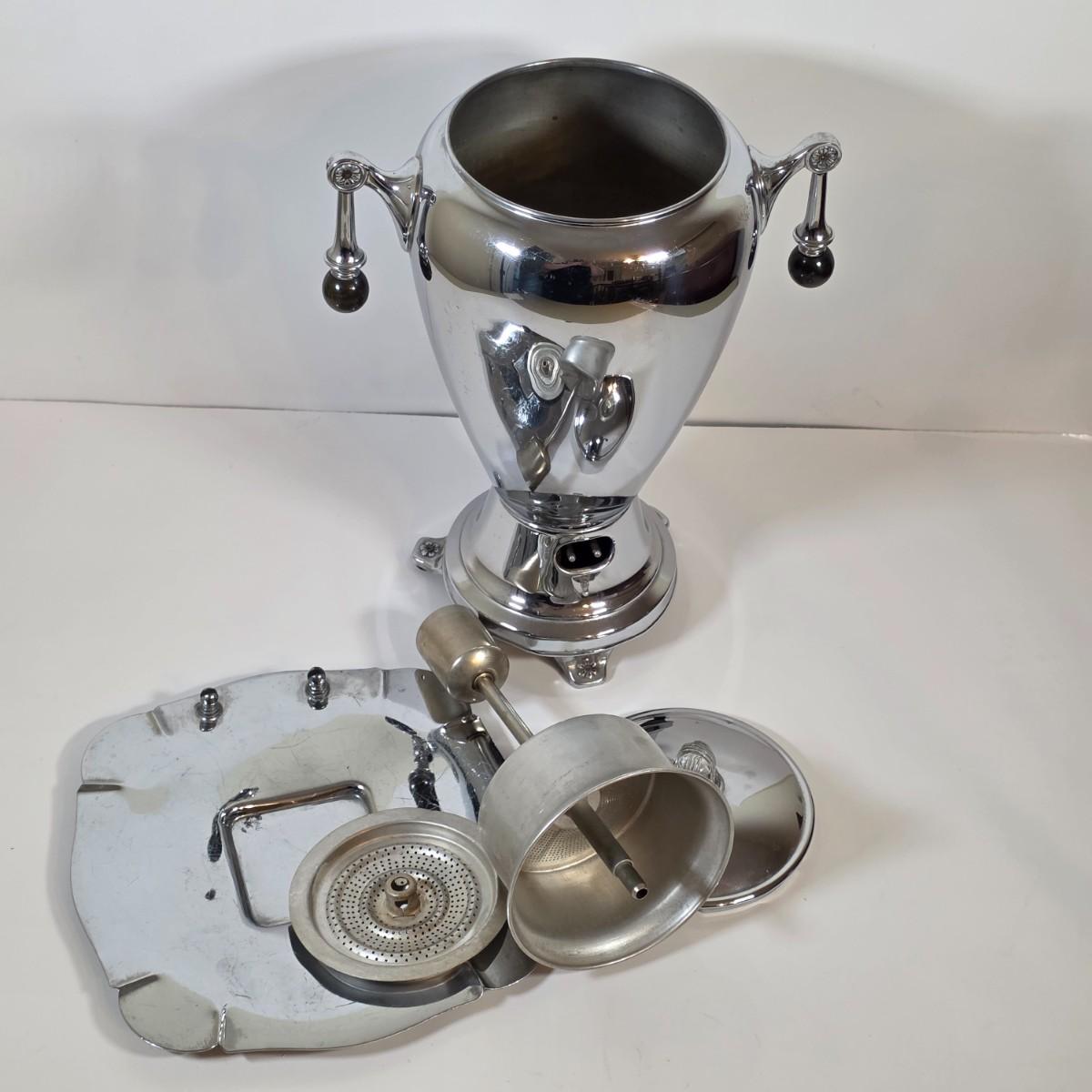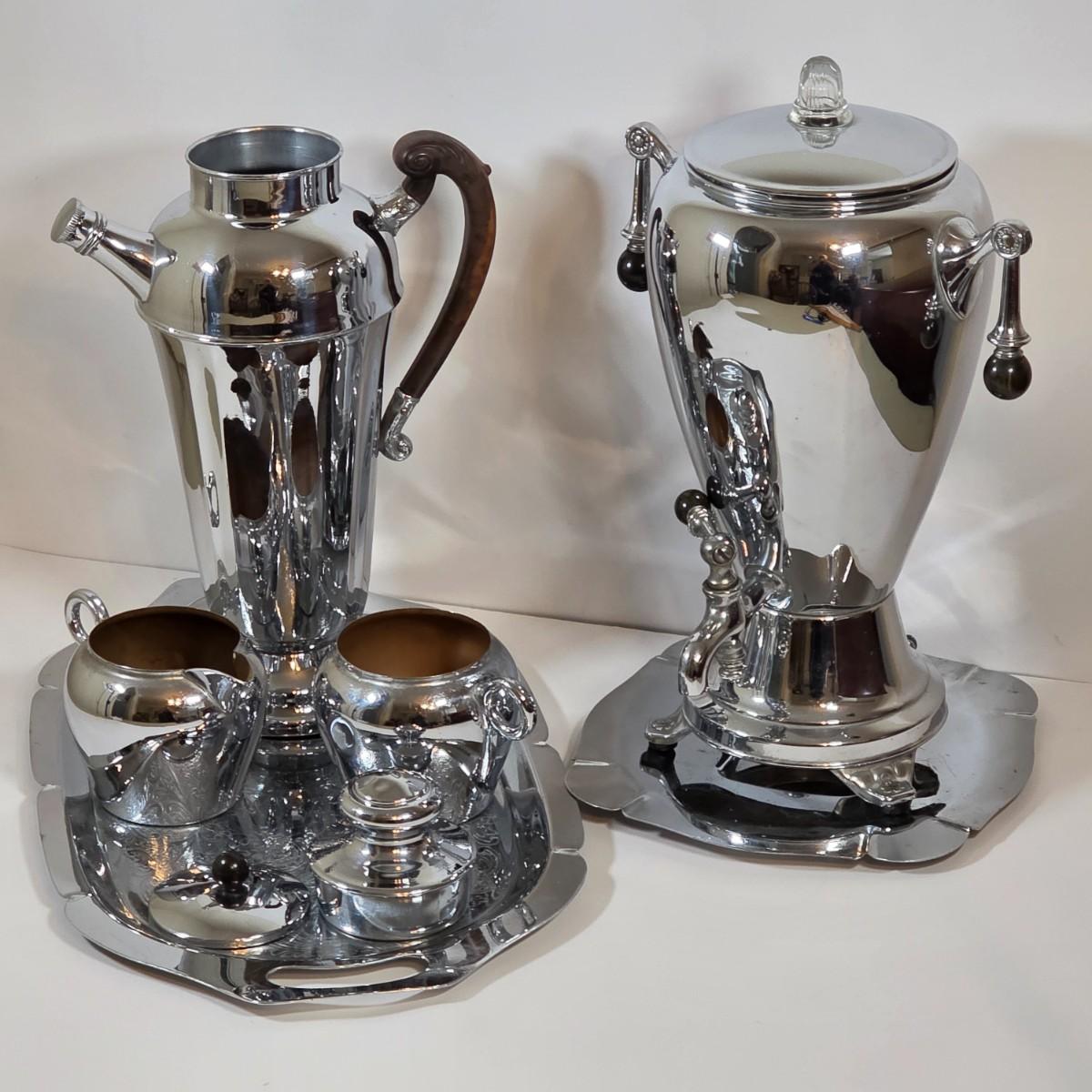 LOT 43K: MCM London & Brighton Chromium Footed Martini/Cocktail Shaker, Along w/Farber Brothers Serving Tray & GE Electric Coffee Percolator w/Creamer Set and Tray
