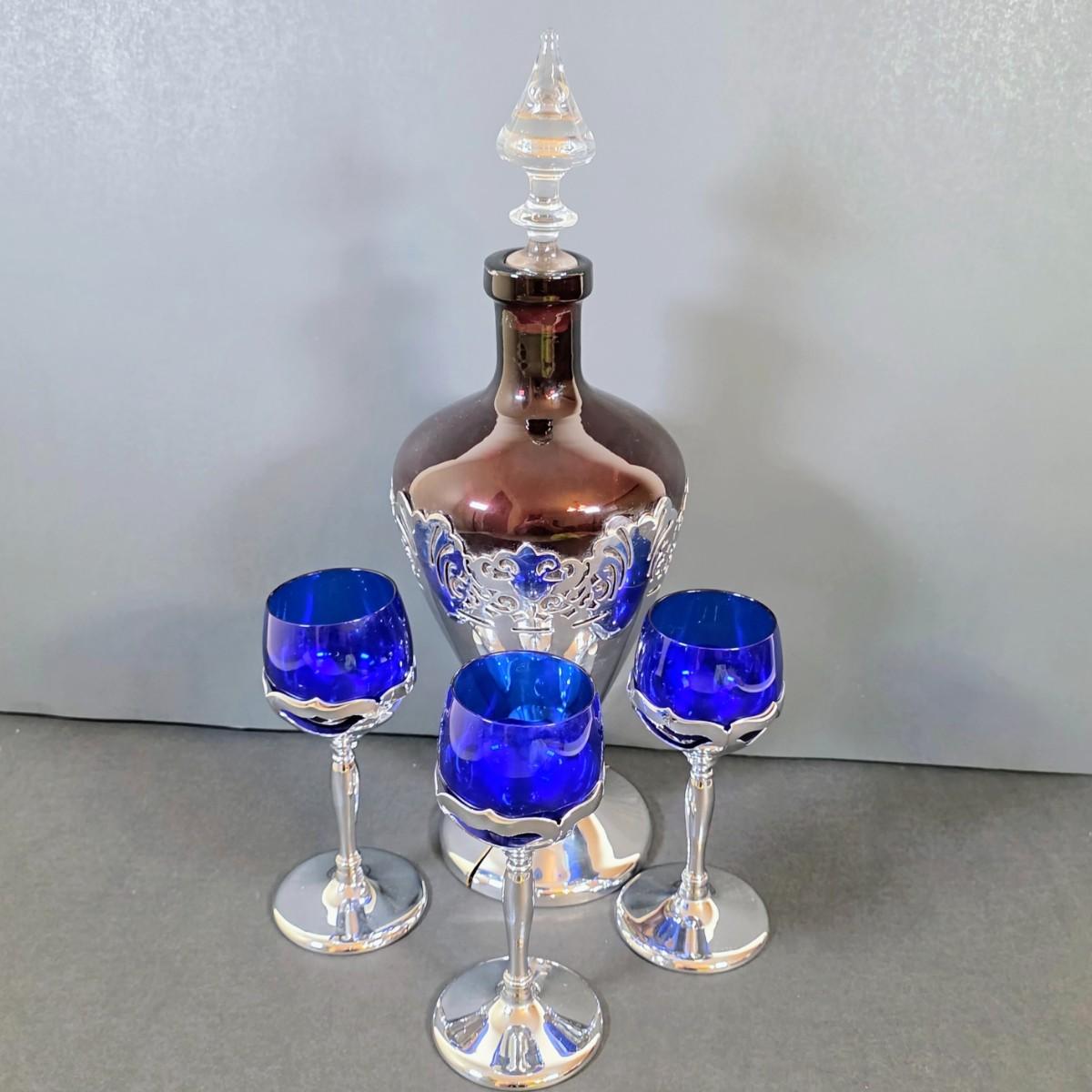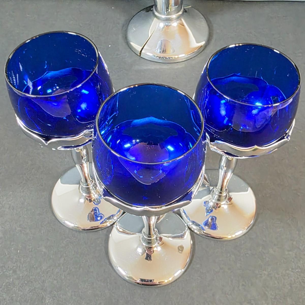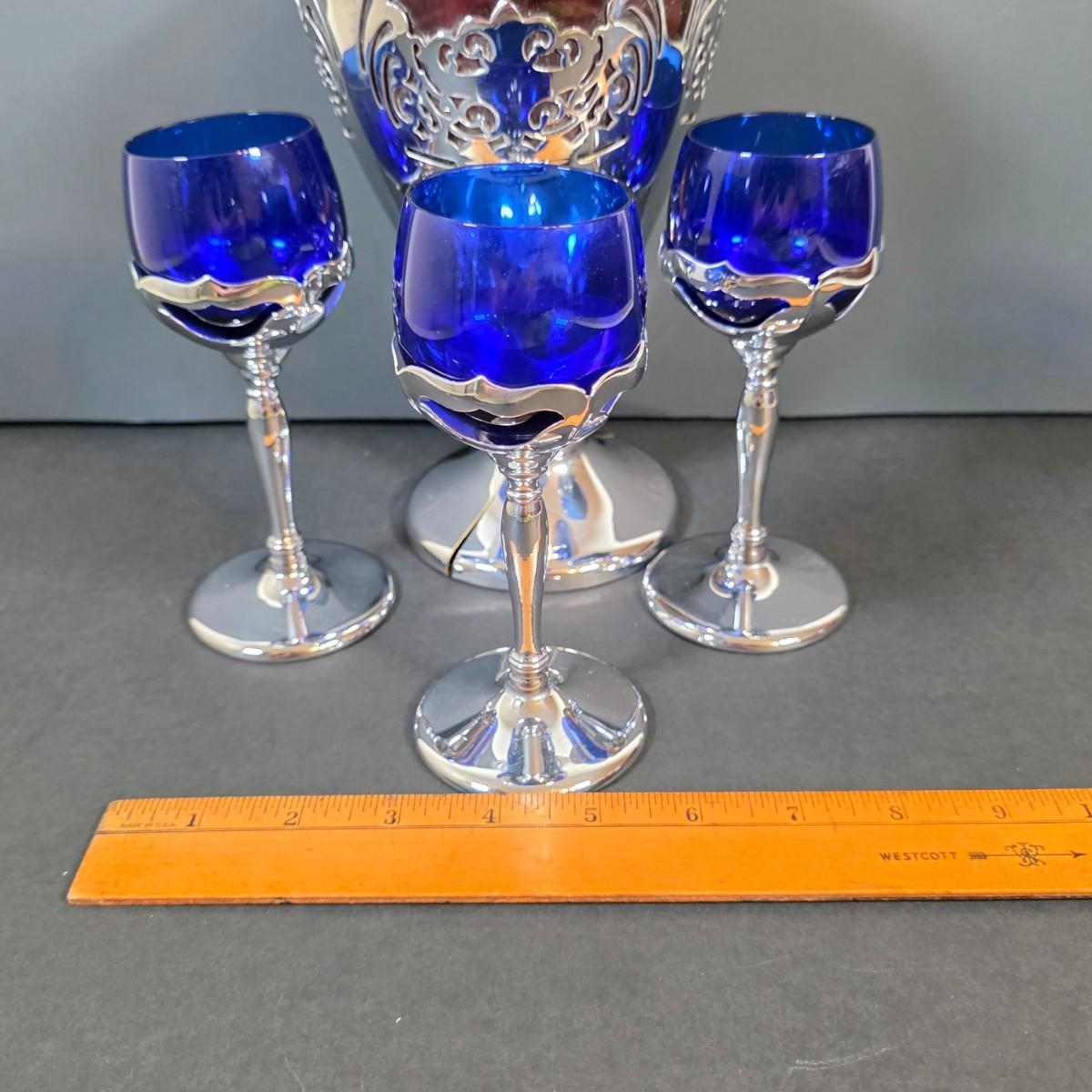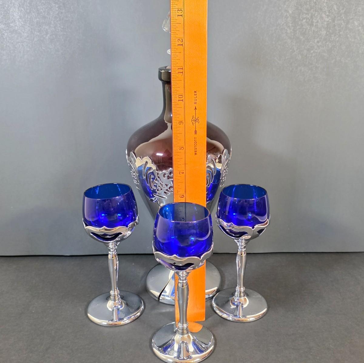 LOT 45K: Antique/Vintage Farber Bros Krome Kraft Amethyst Glass Decanter & 3 Cobalt Blue, Chrome Stem Glasses