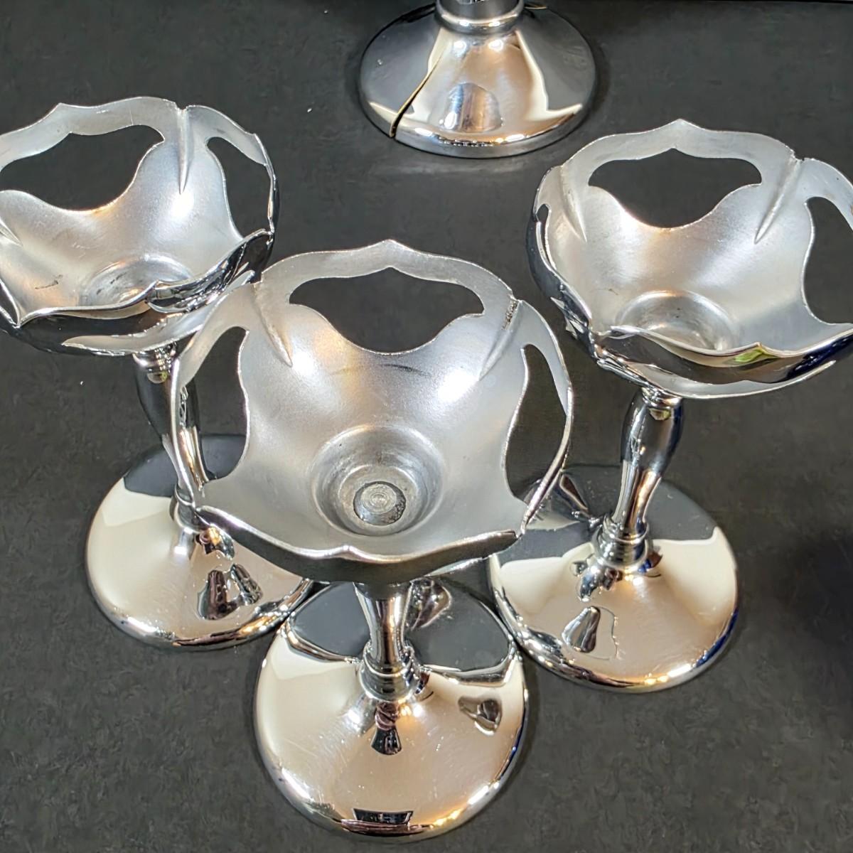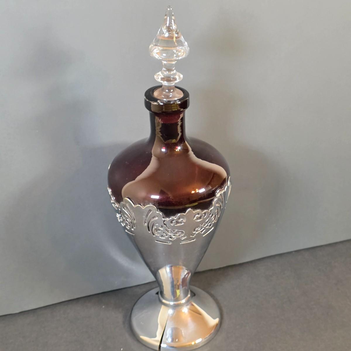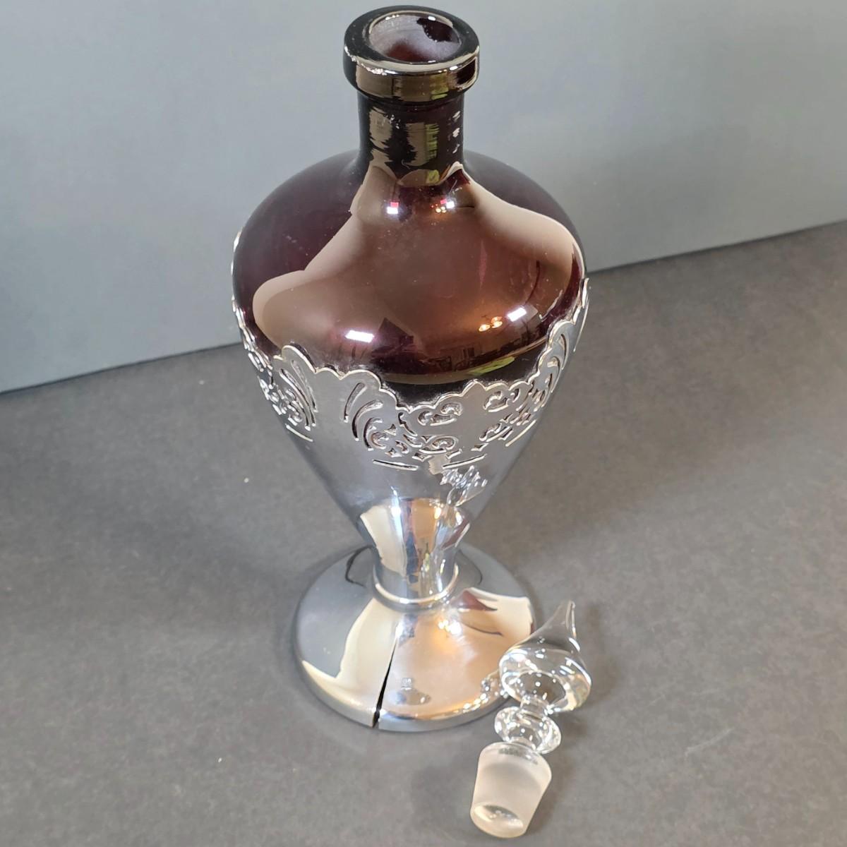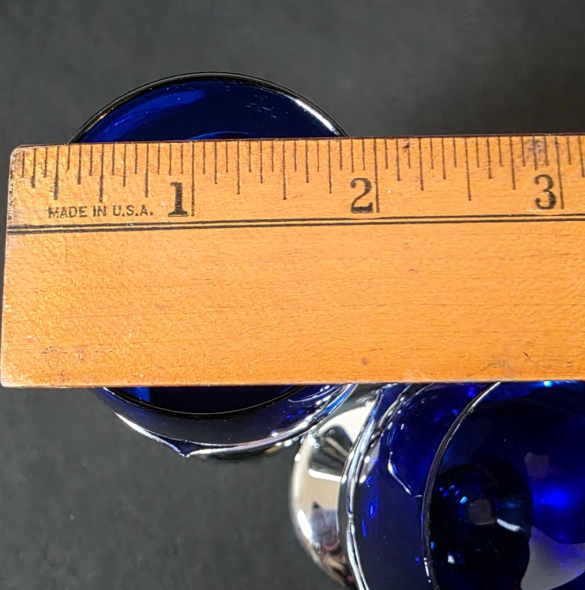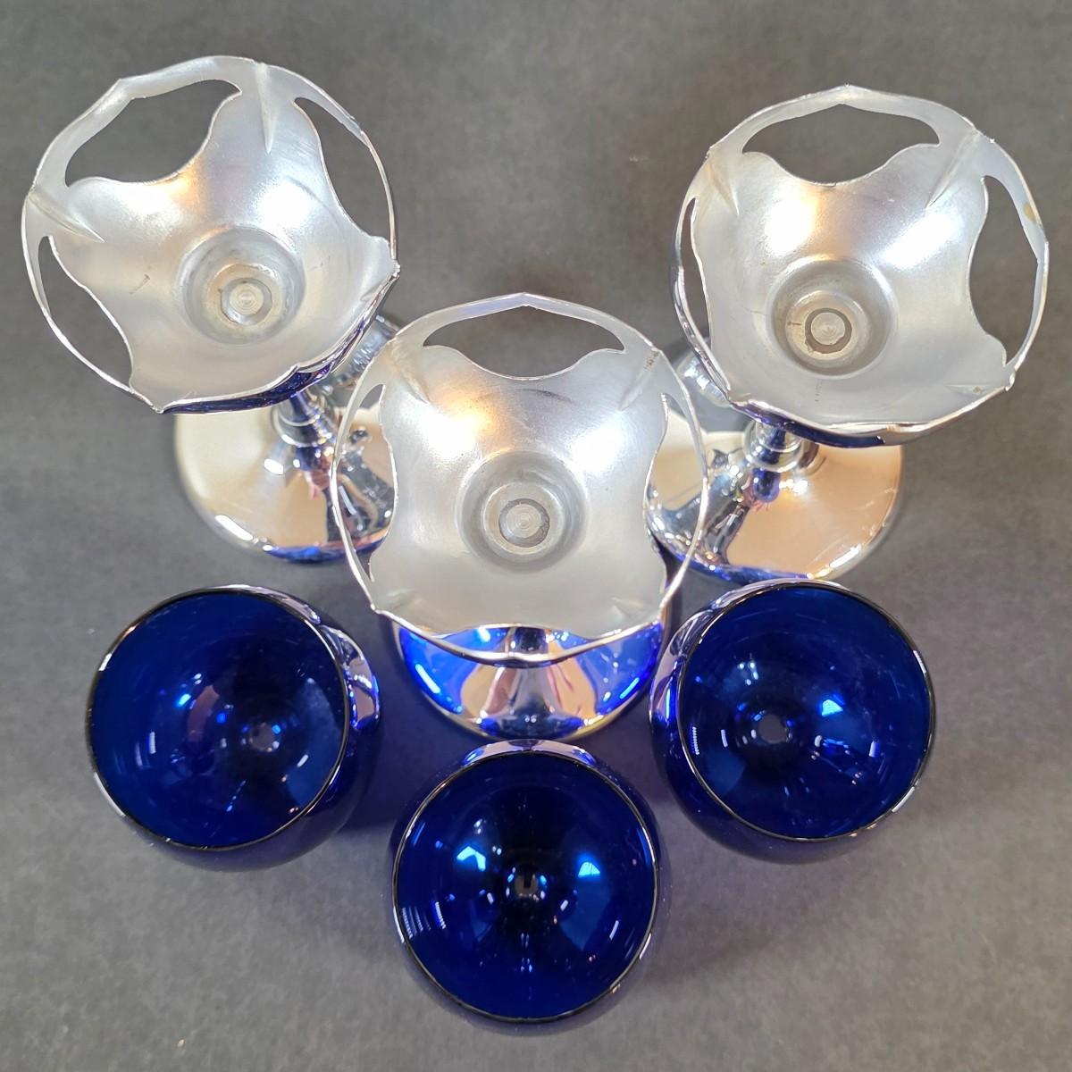 LOT 45K: Antique/Vintage Farber Bros Krome Kraft Amethyst Glass Decanter & 3 Cobalt Blue, Chrome Stem Glasses