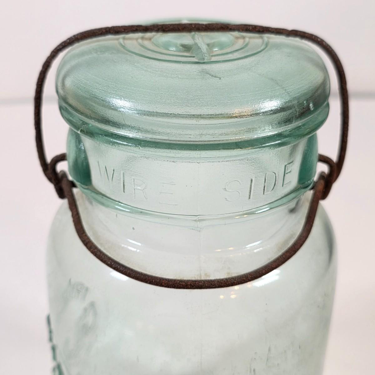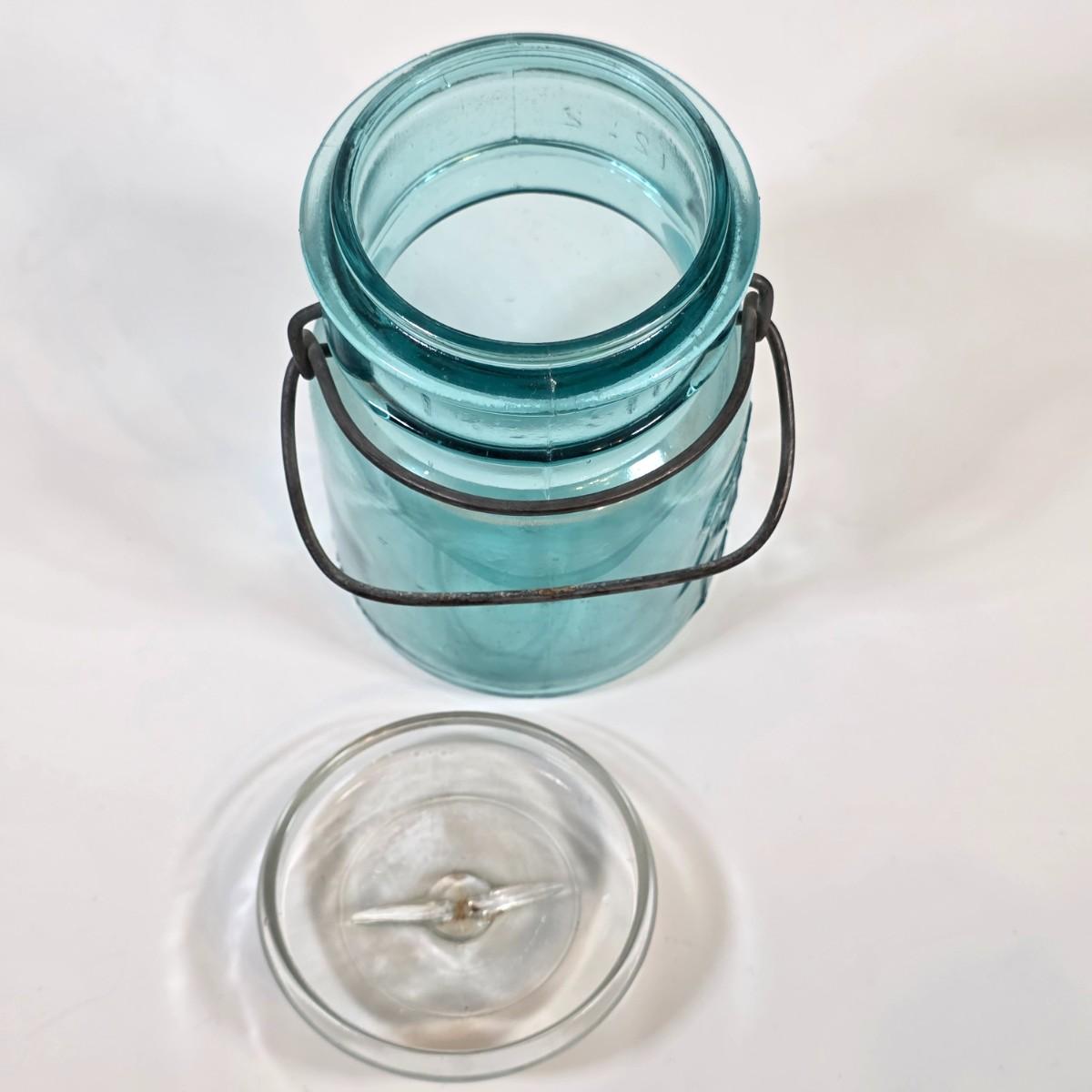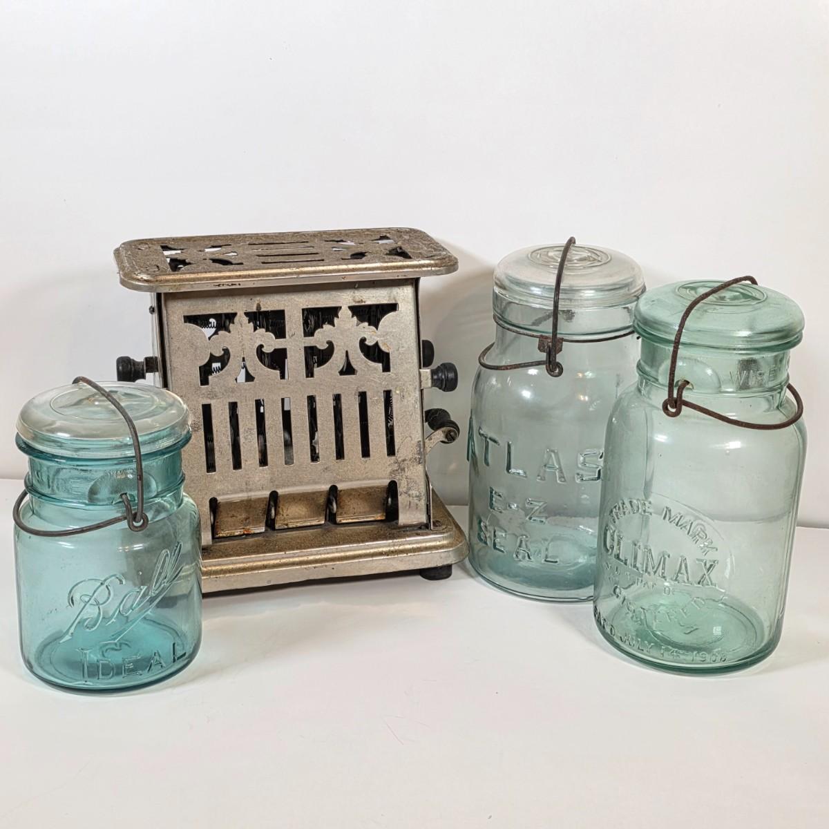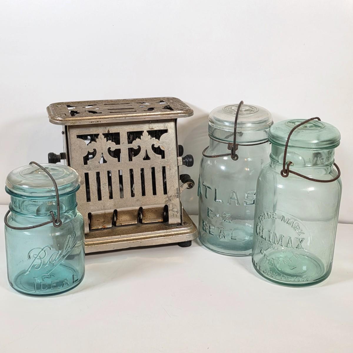 LOT 48K: Antique/Vintage Universal Landers, Frary & Clark Electric Toaster W/3 Wire Bail Closure Blue-Green Glass Canning Jars