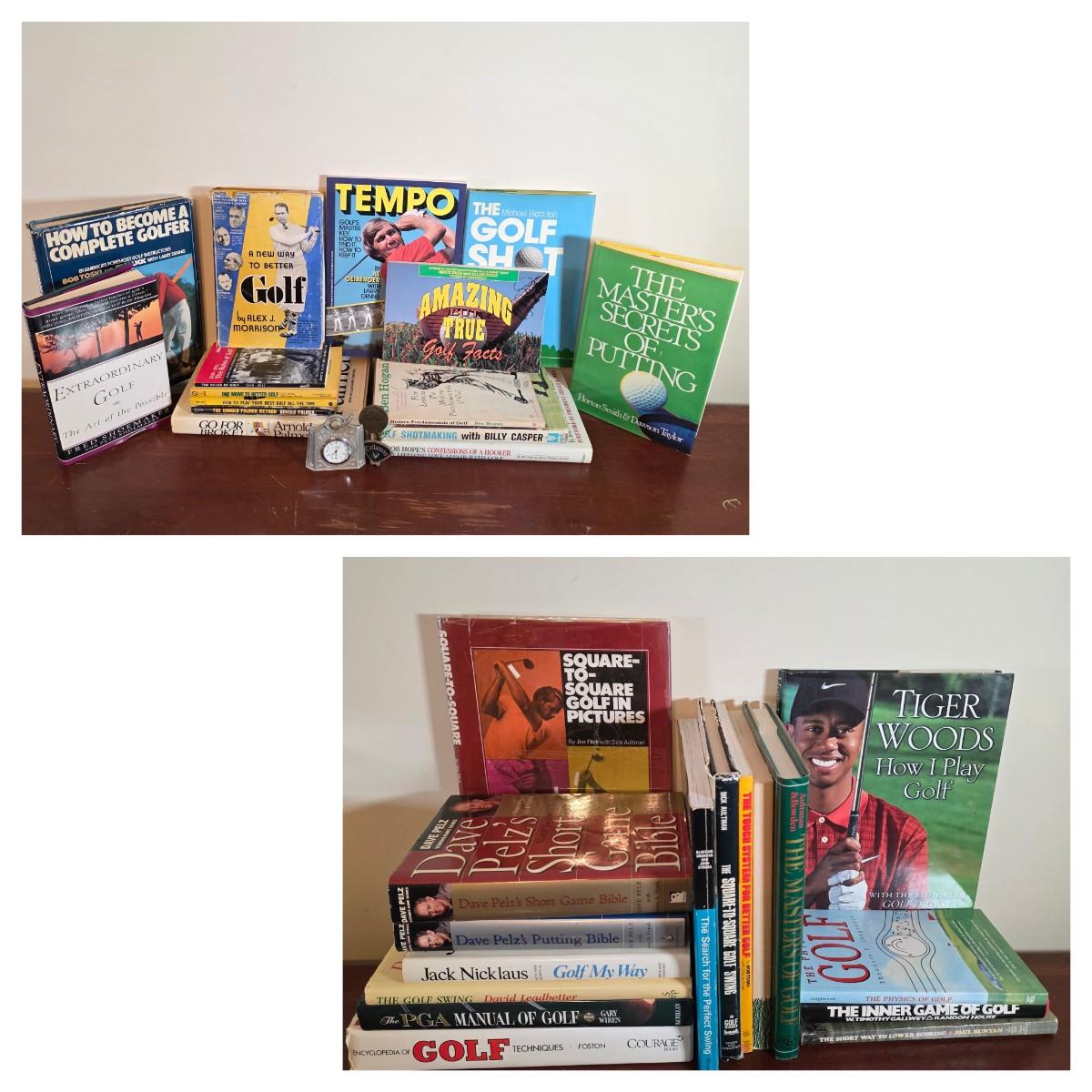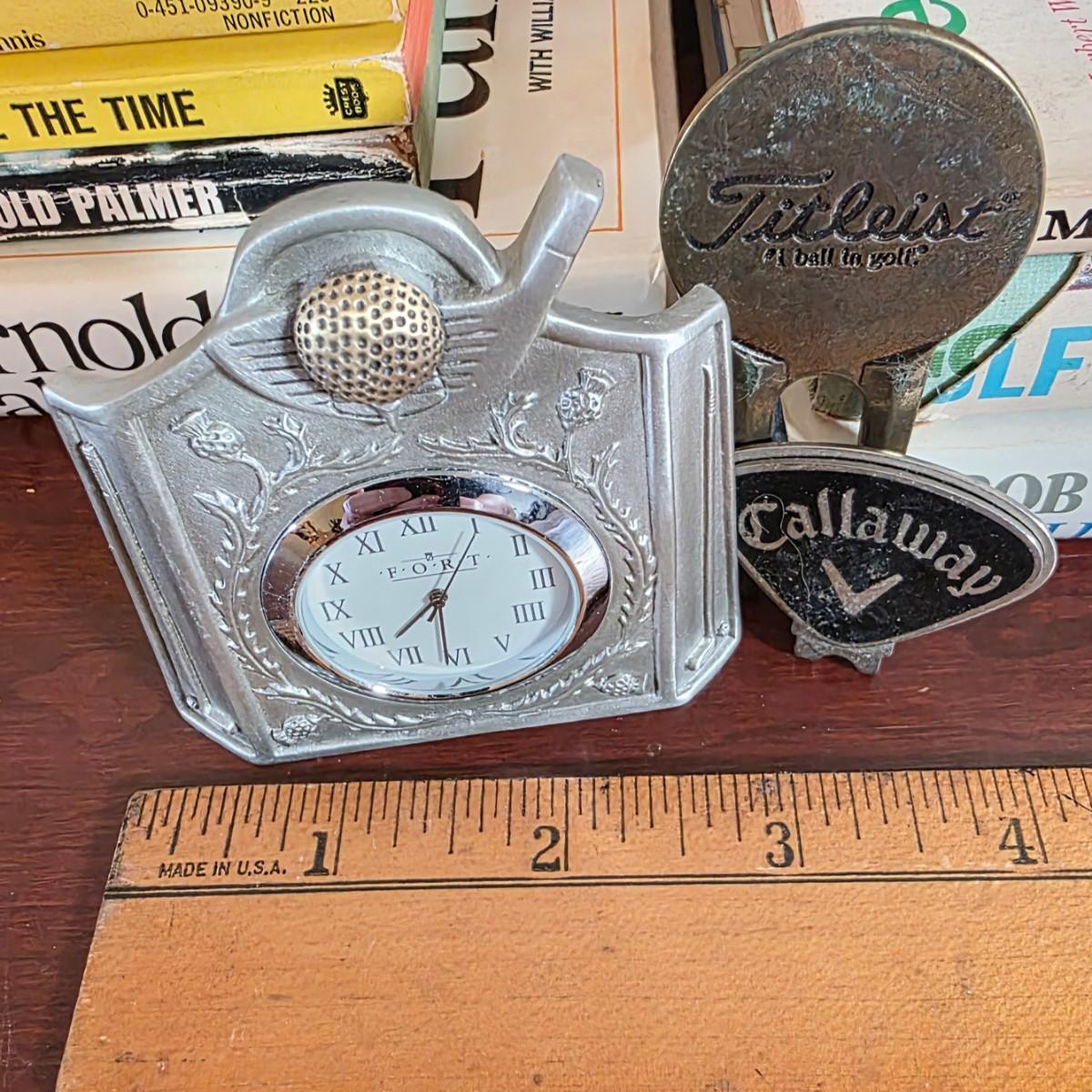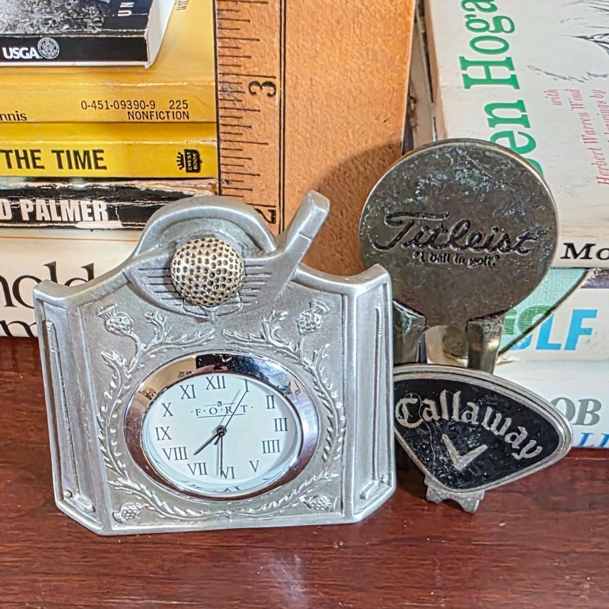 LOT 51K: Vintage Books For The Beginner & Long Time Golfer, Along With A Magnetic Calaway Hat Clip/Ball Marker, A Titleist Divot Fixer & Golf Themed Desk Clock