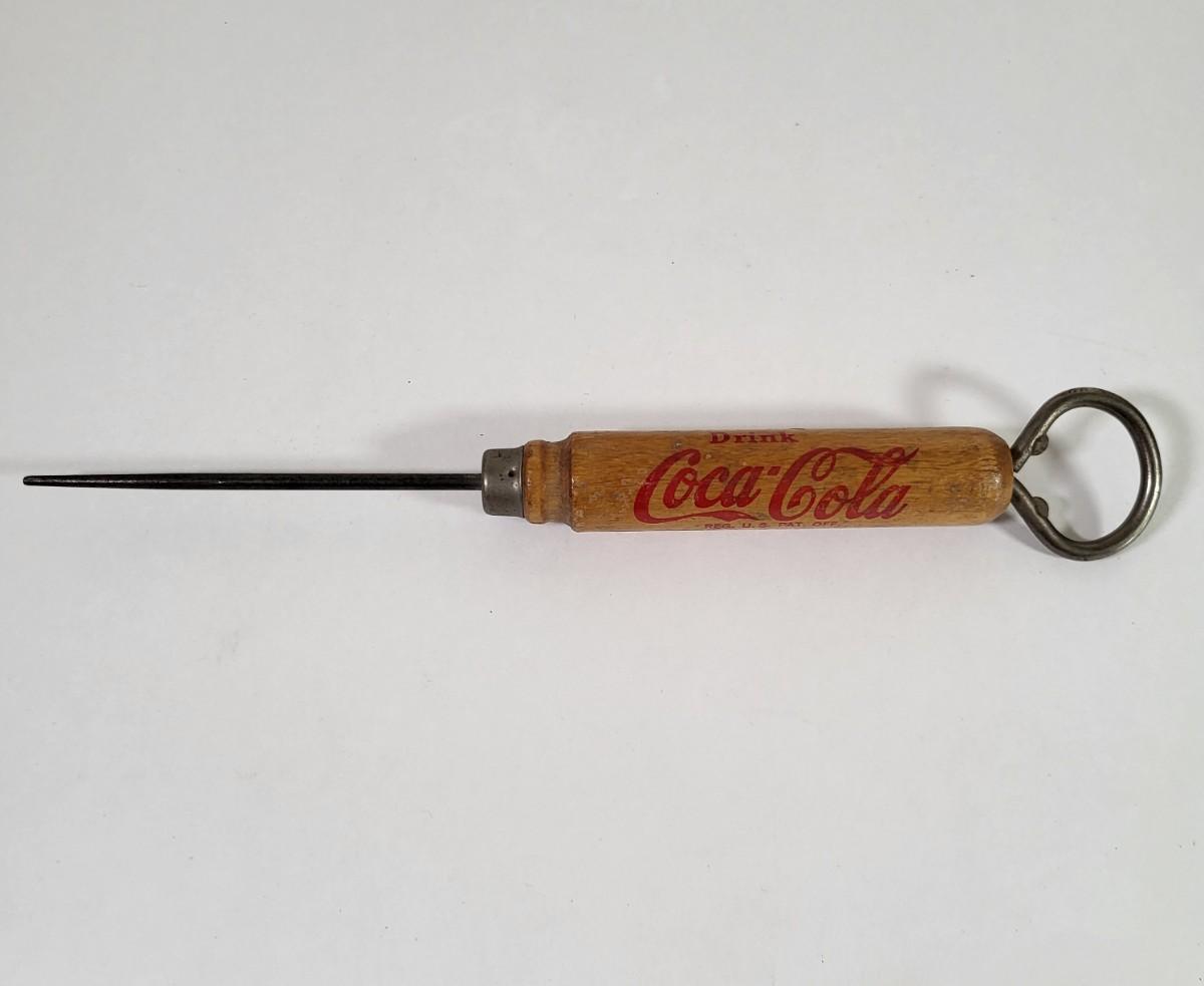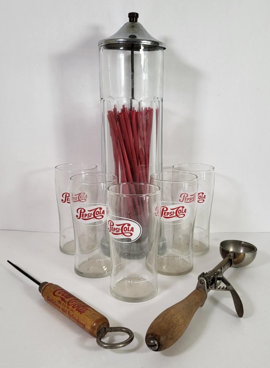 LOT 63K: Vintage Lot of Five Pepsi-Cola Glasses and Straw Dispenser, with Wooden Handle Ice Cream Scoop and Wooden Coca-Cola Ice Pick