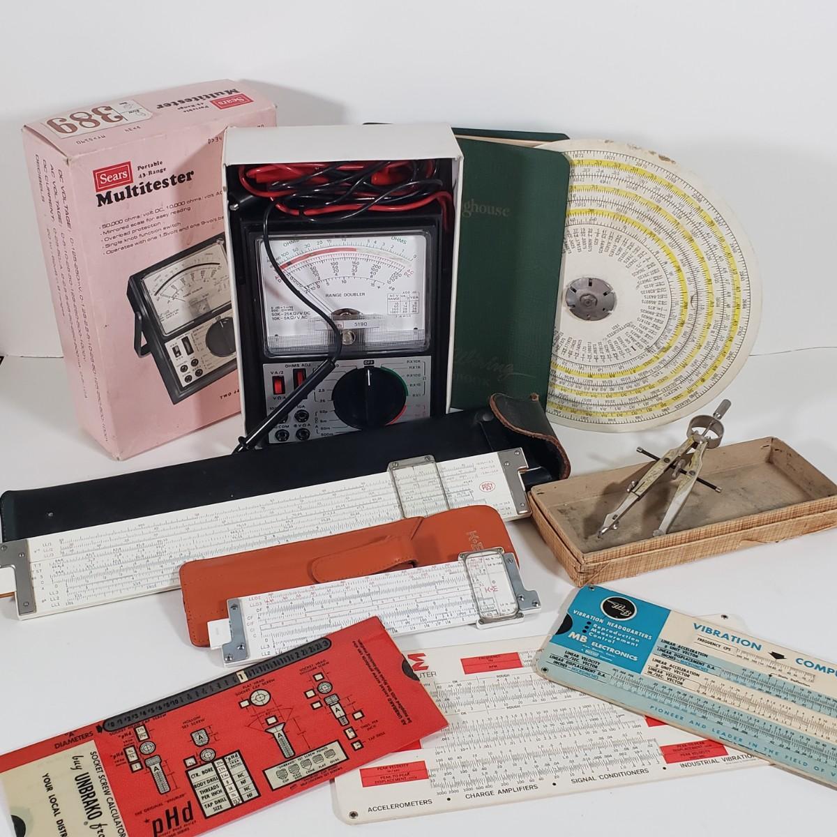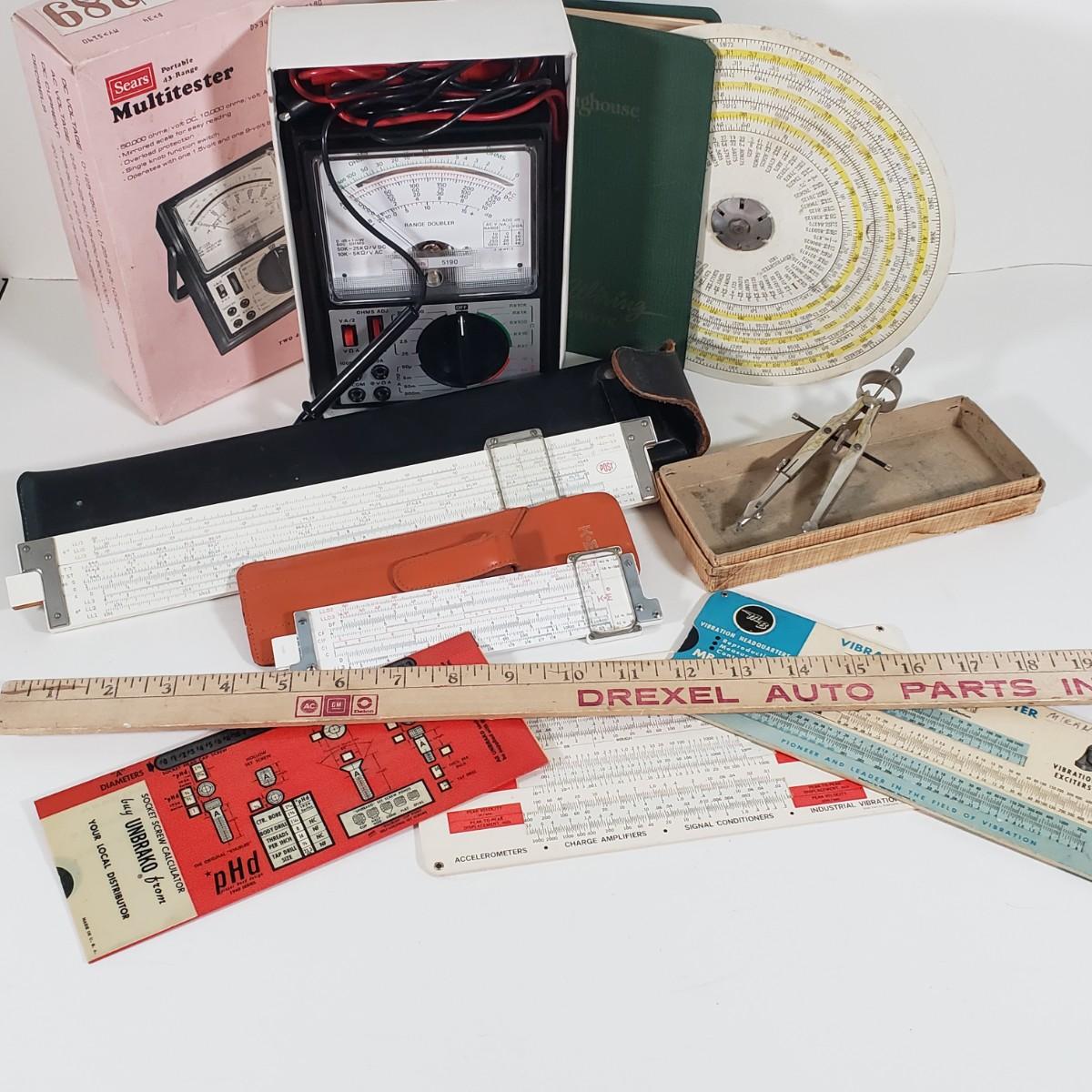 LOT 83X: Vintage Engineering Supplies; German Lietz Compass, Slide Rules, Multitester, and More