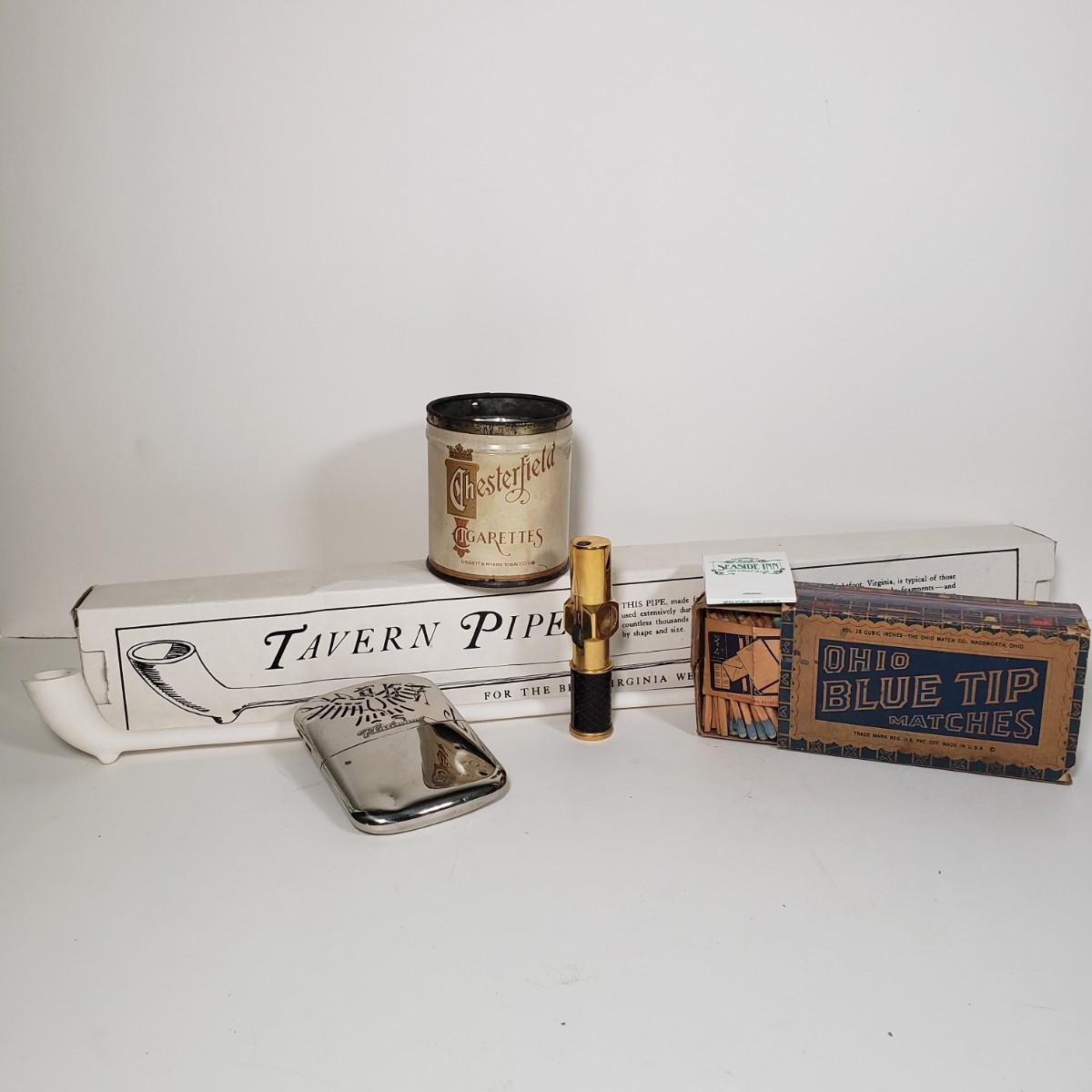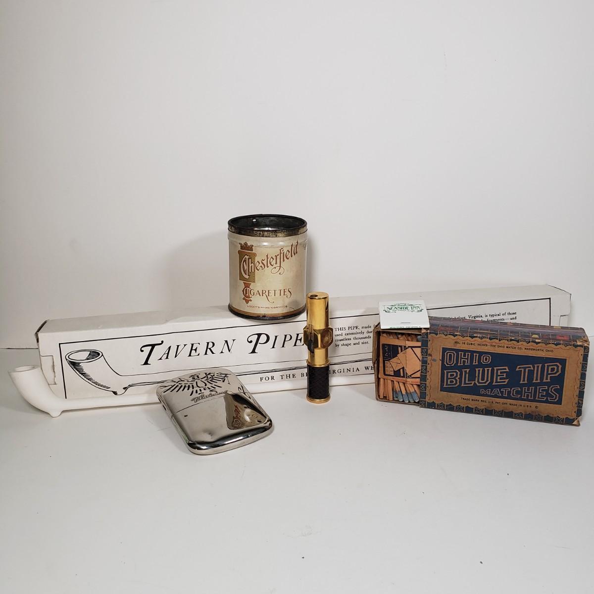 LOT 91X: Vintage Smoker Collection; Nimrod Pipelighter, Chesterfield, Ohio Blue Tip Matches, and More