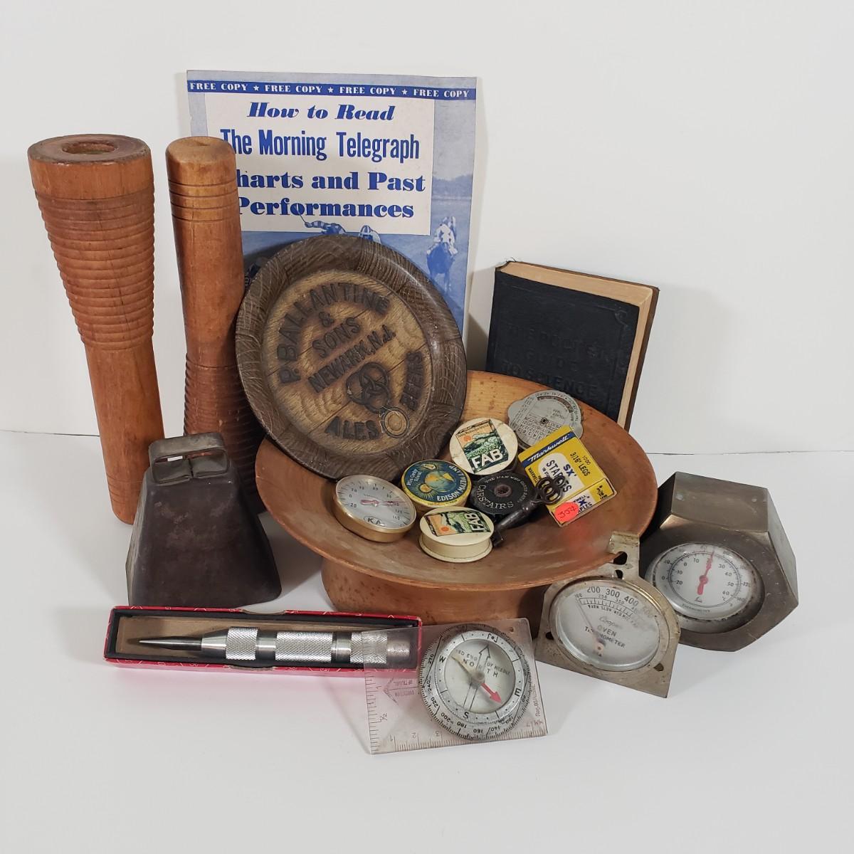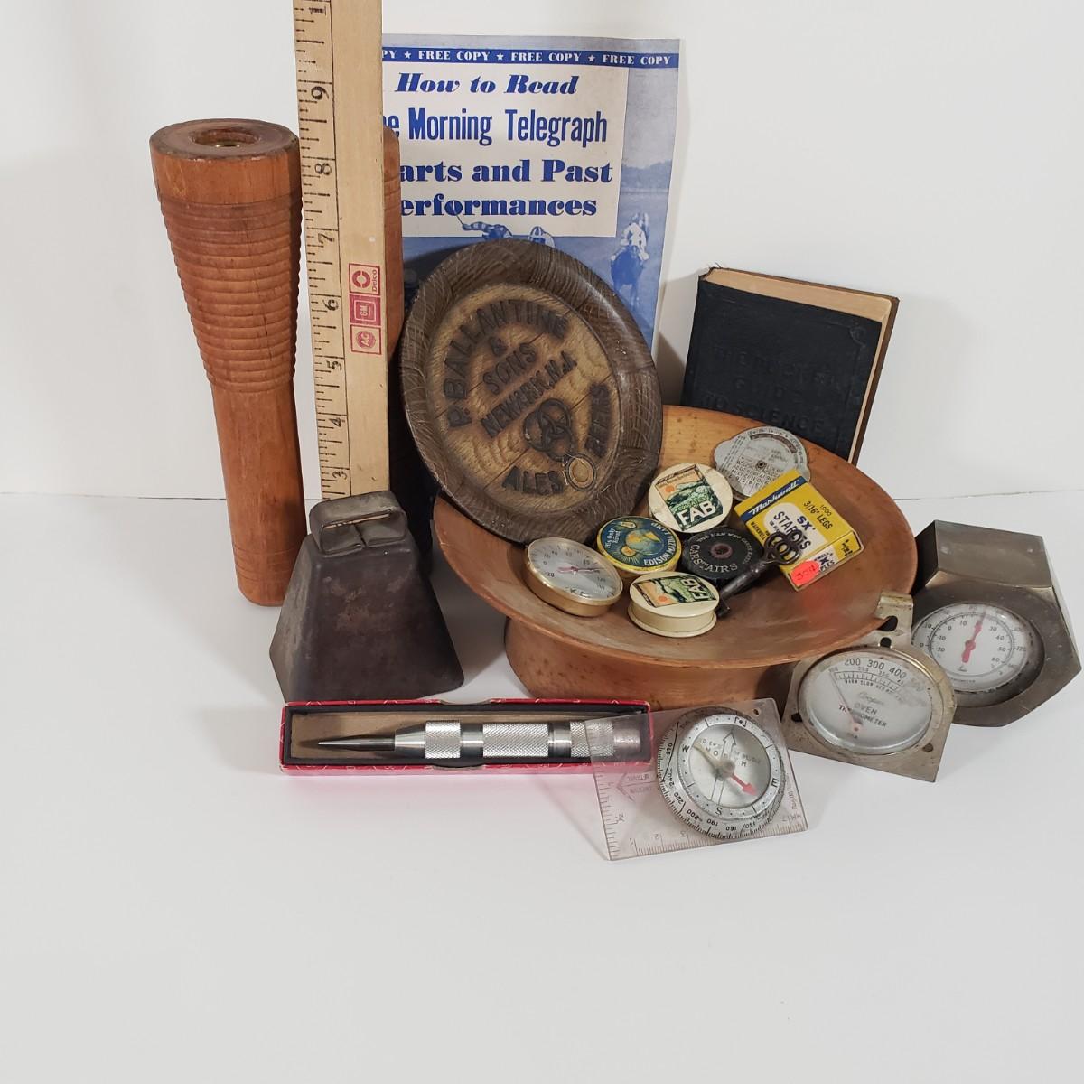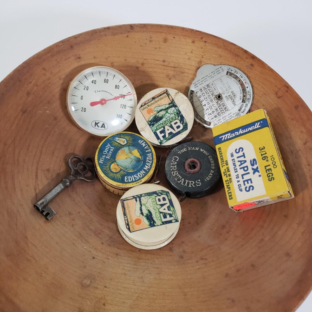 LOT 95X: Junk Drawer Lot; Vintage Celluloid Tape Measures, Ballantine Beer Tip Tray, Heavy Bolt Thermometer, and More