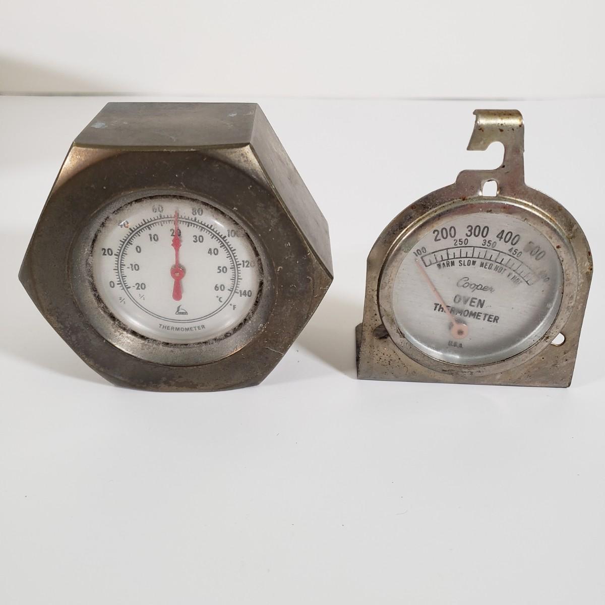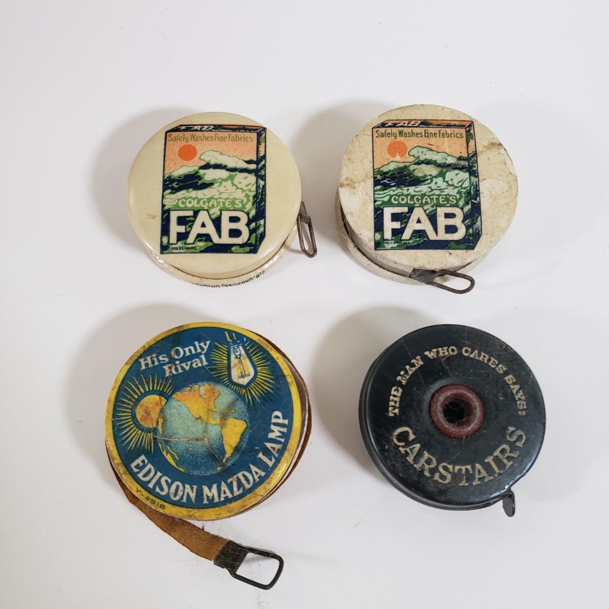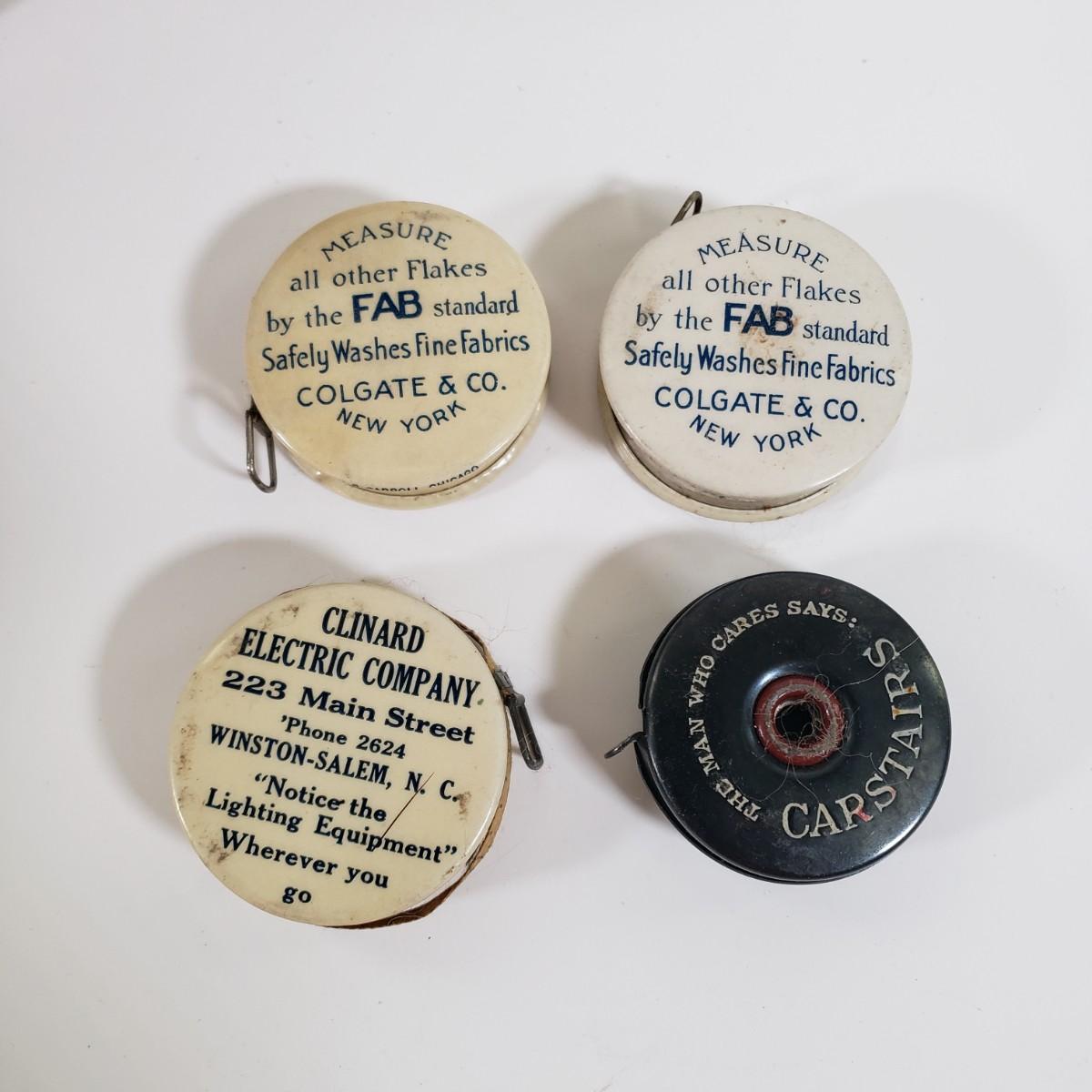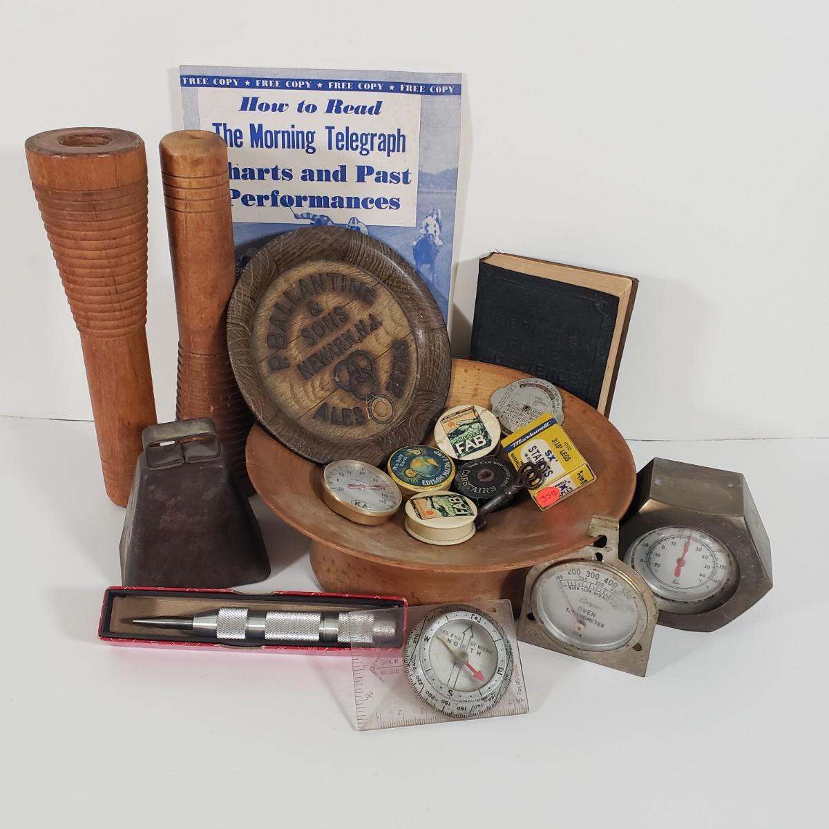 LOT 95X: Junk Drawer Lot; Vintage Celluloid Tape Measures, Ballantine Beer Tip Tray, Heavy Bolt Thermometer, and More
