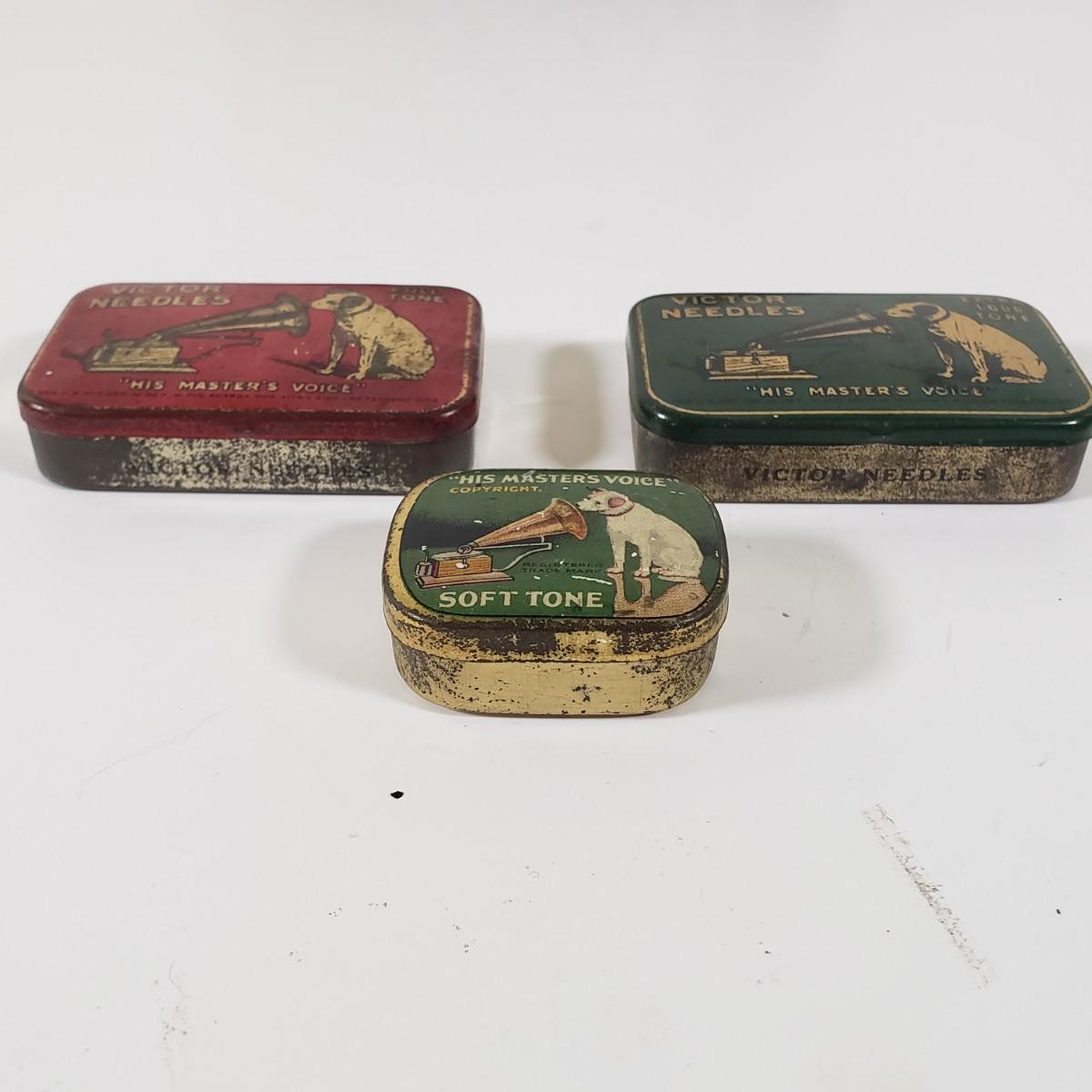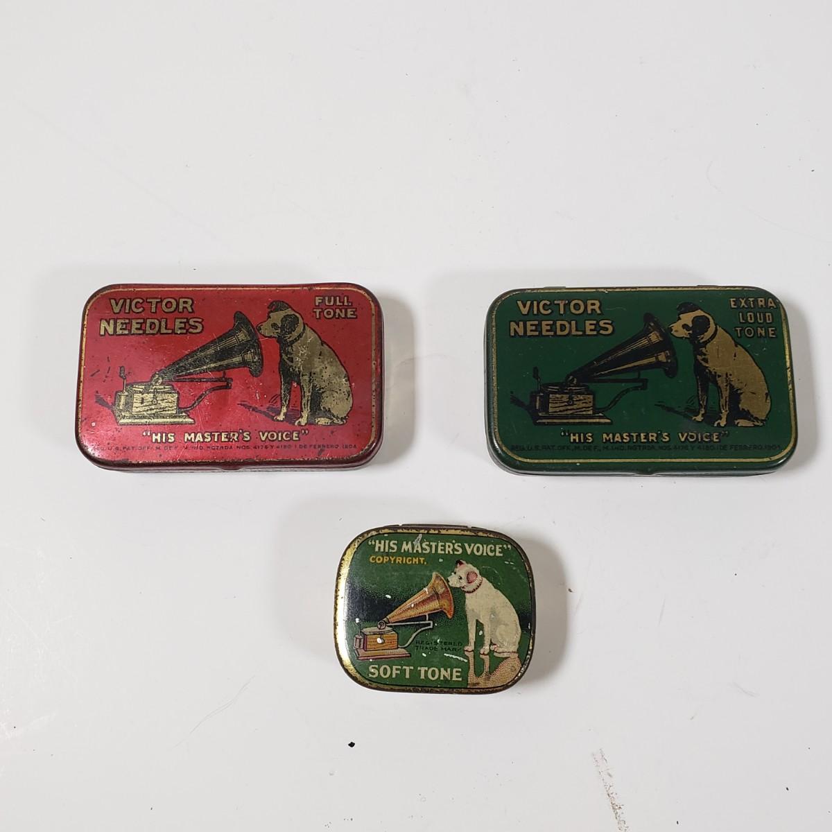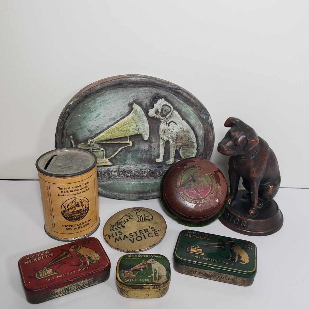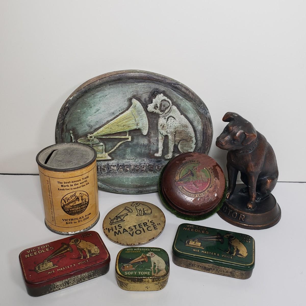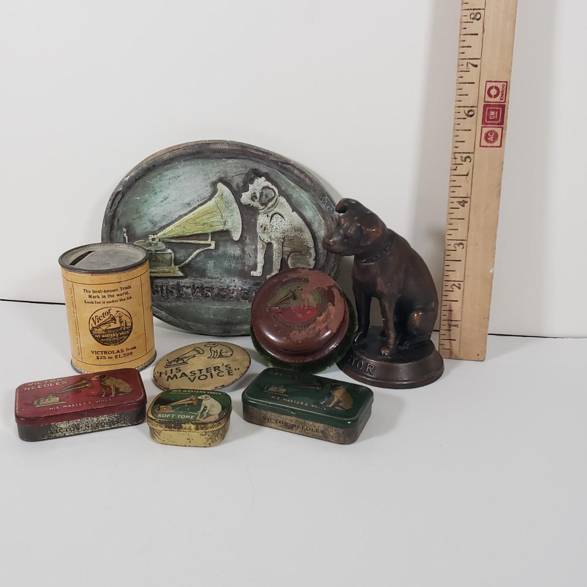 LOT 142X: His Master's Voice Collection; Nipper Dog Display/Hood Ornament, TIn Bank, Needle Tins, and More