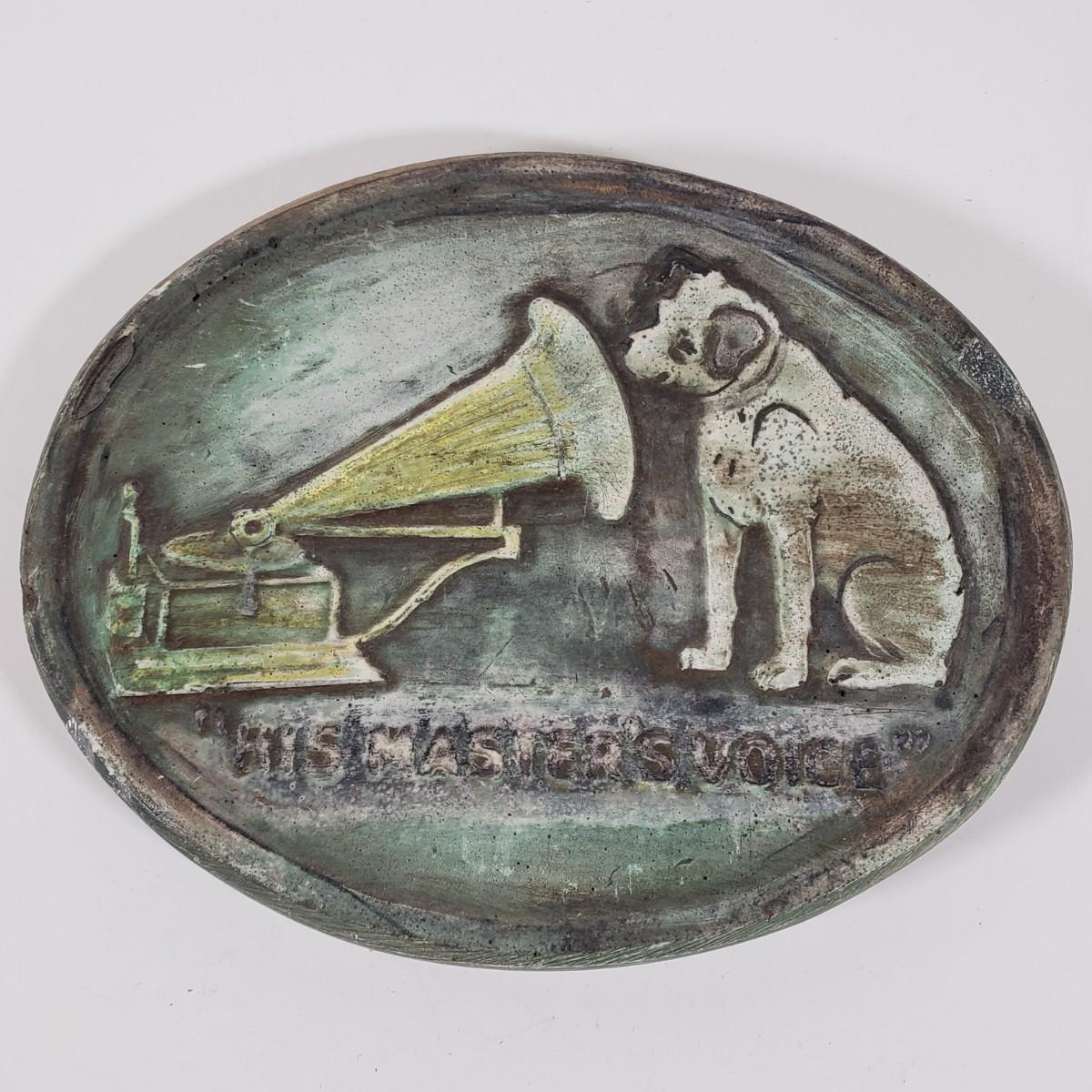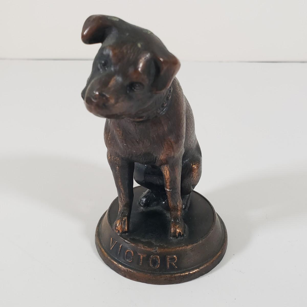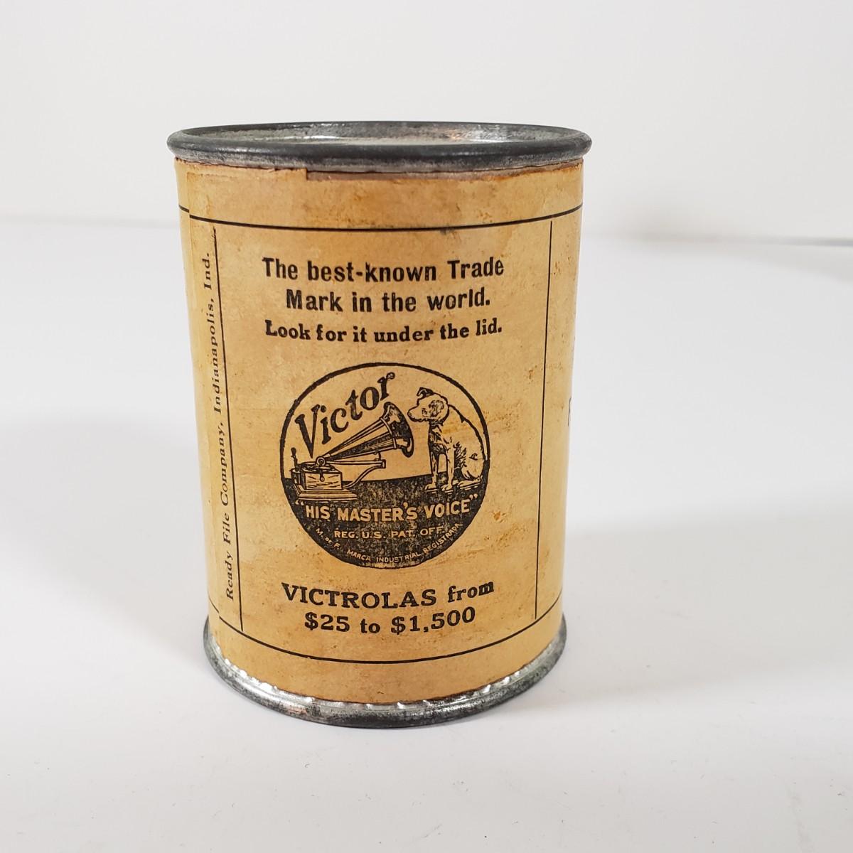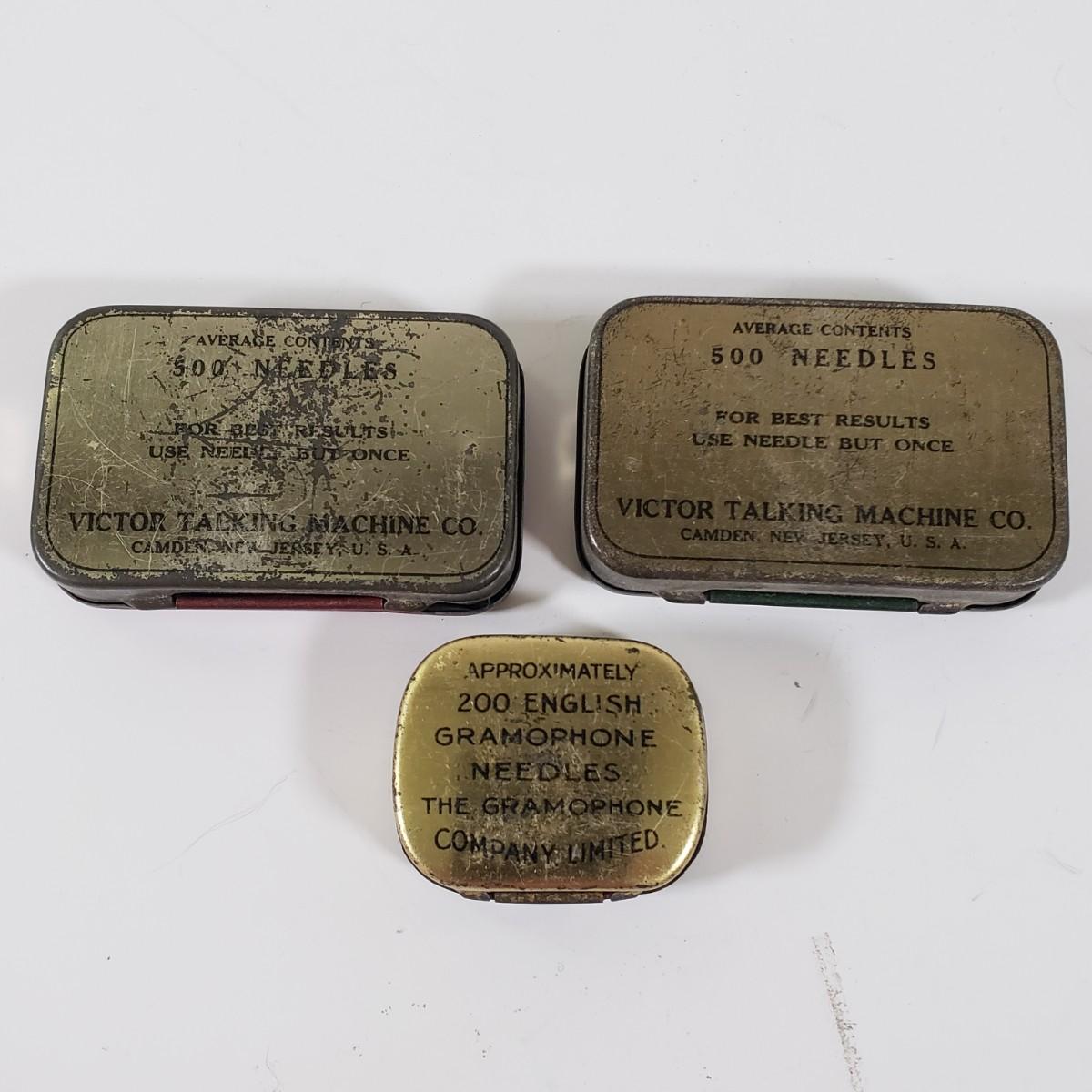 LOT 142X: His Master's Voice Collection; Nipper Dog Display/Hood Ornament, TIn Bank, Needle Tins, and More