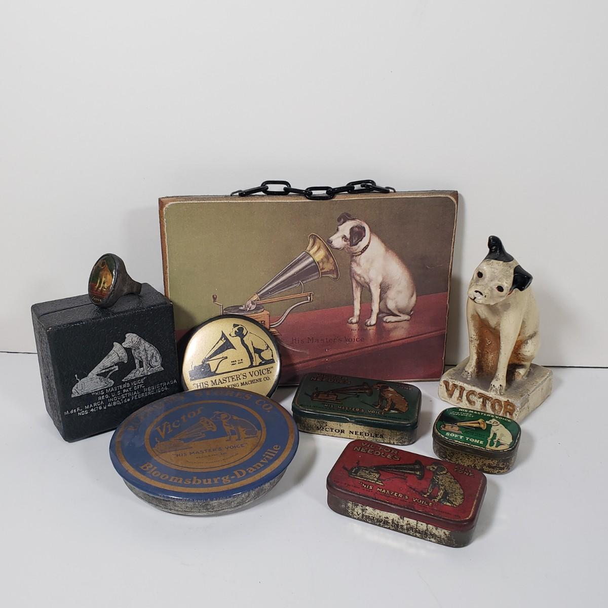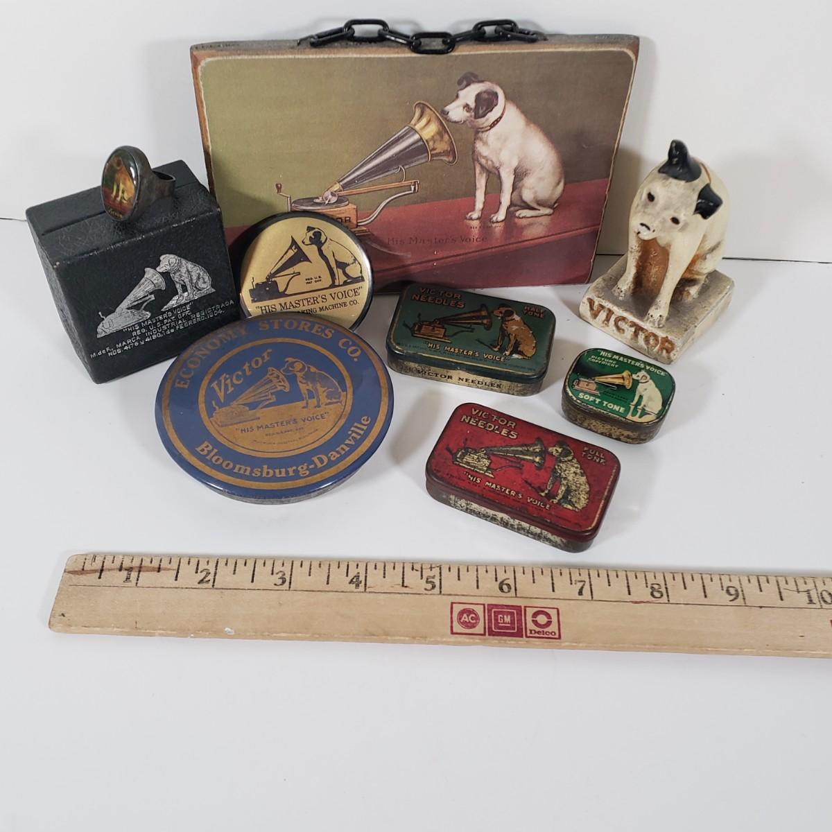 LOT 143X: Nipper the Dog Collection, Figurine, Needle Tins, Ring, and More