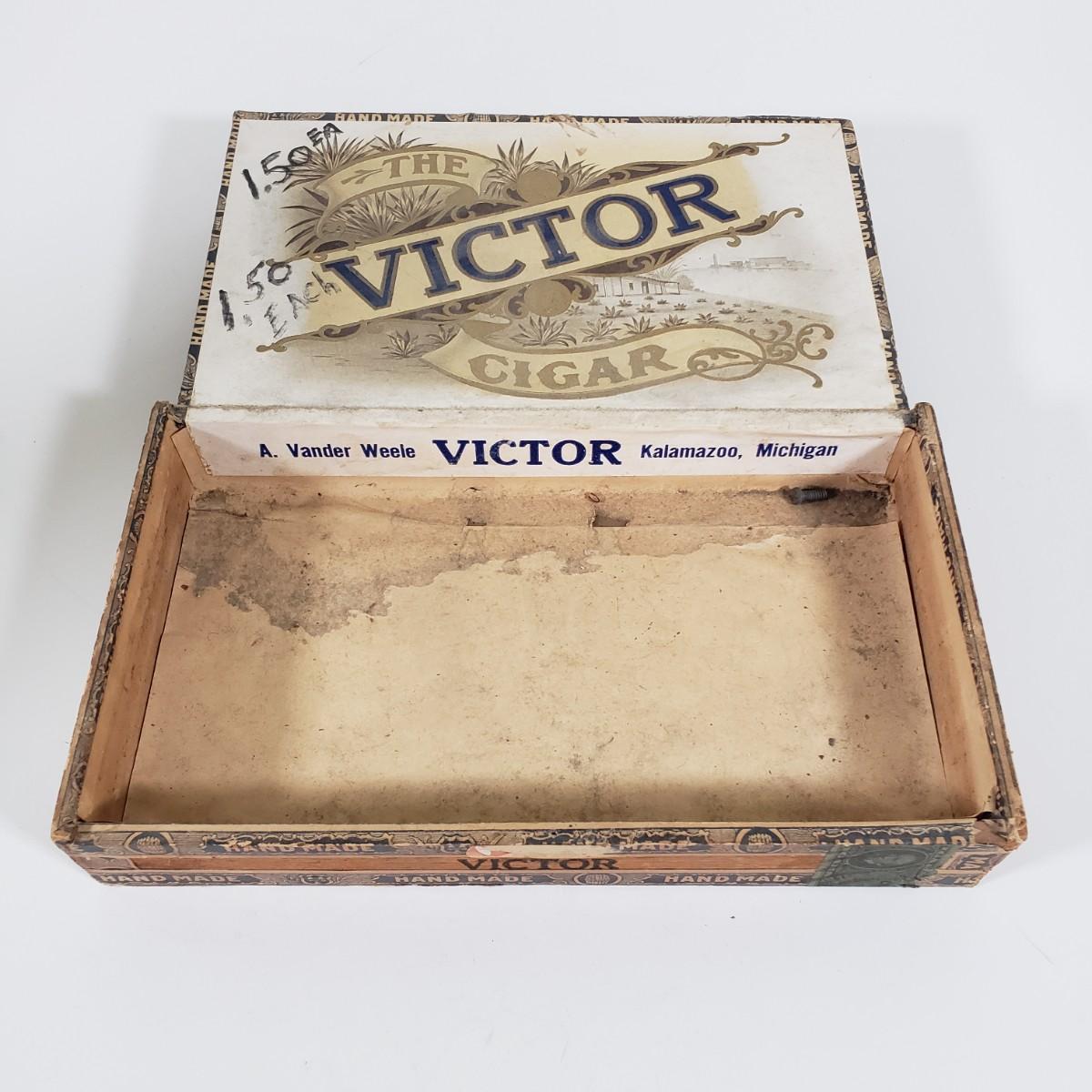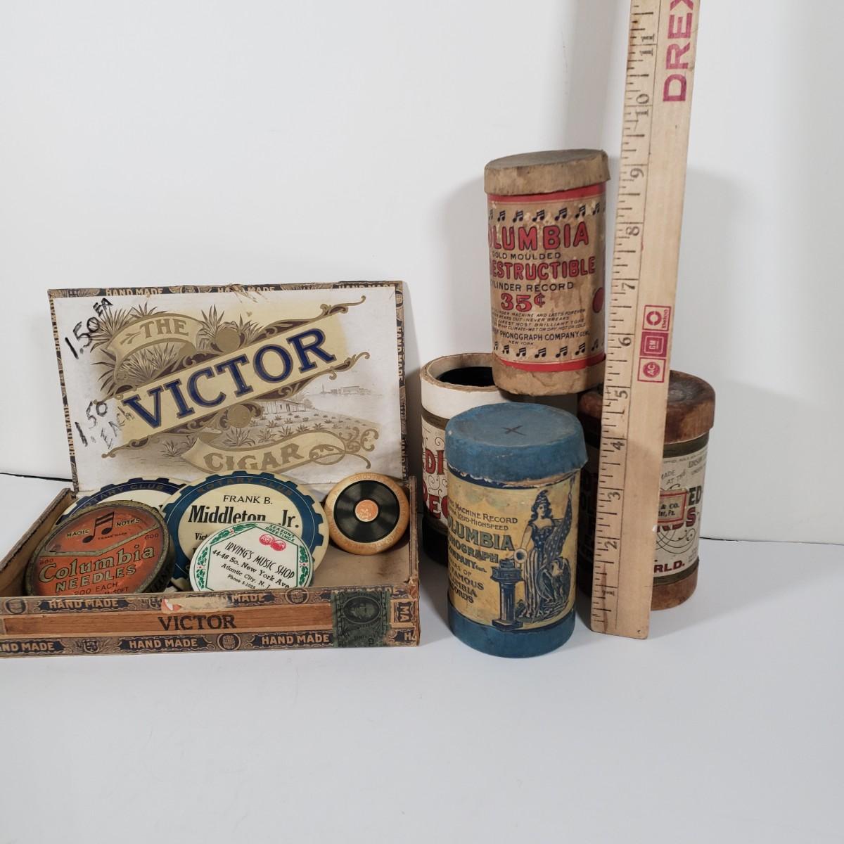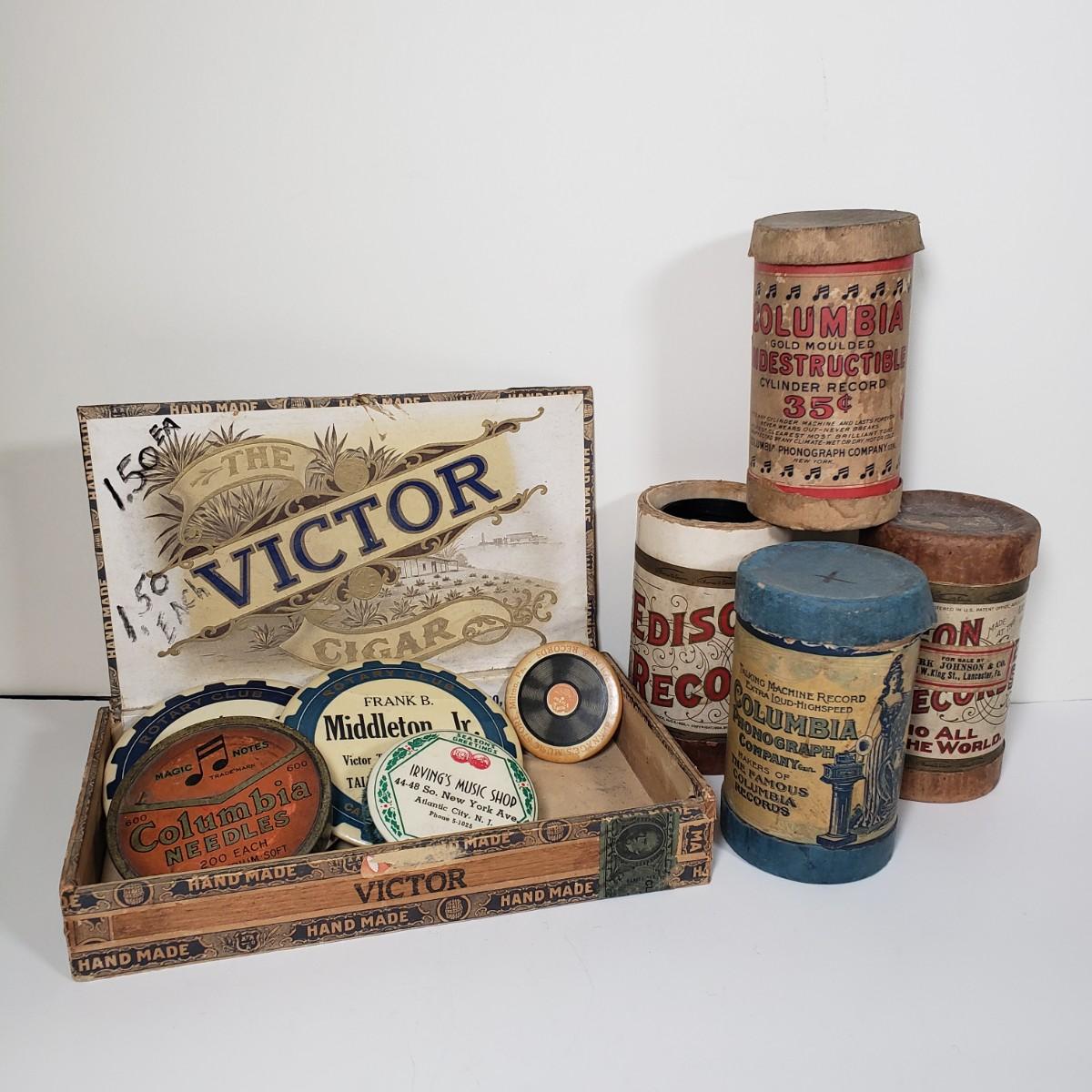 LOT 147X: The Victor Cigar Box with Vintage Music Shop Items and Phonograph Record Tubes