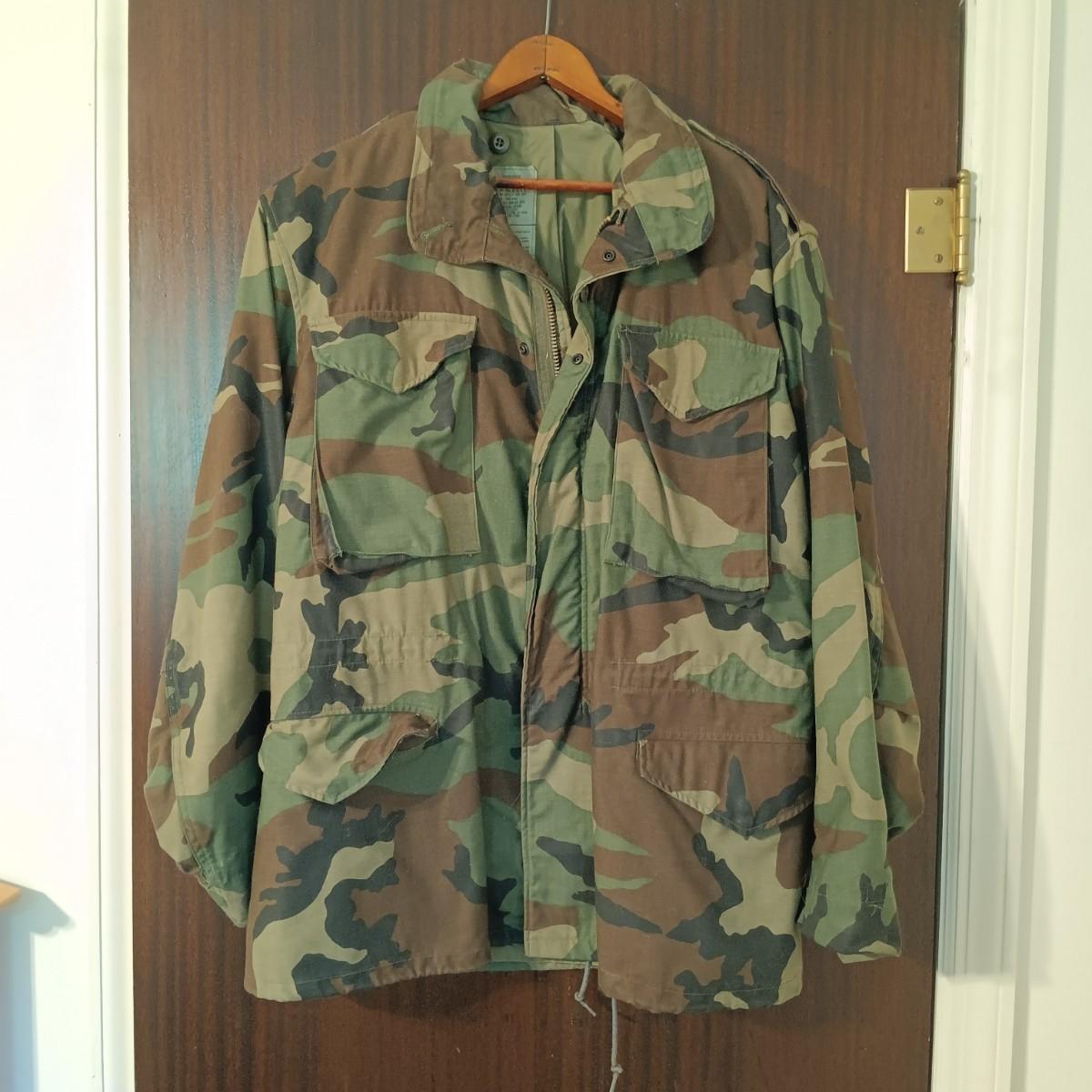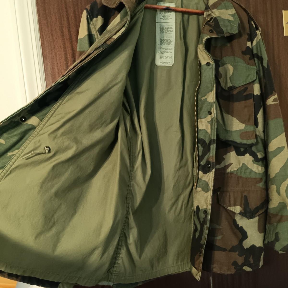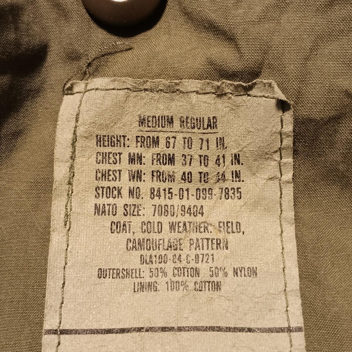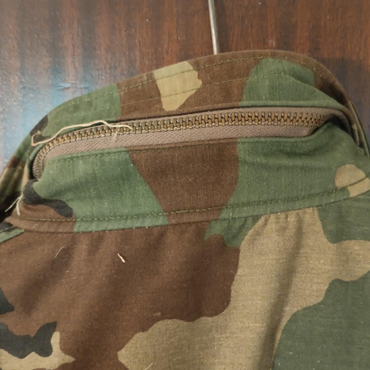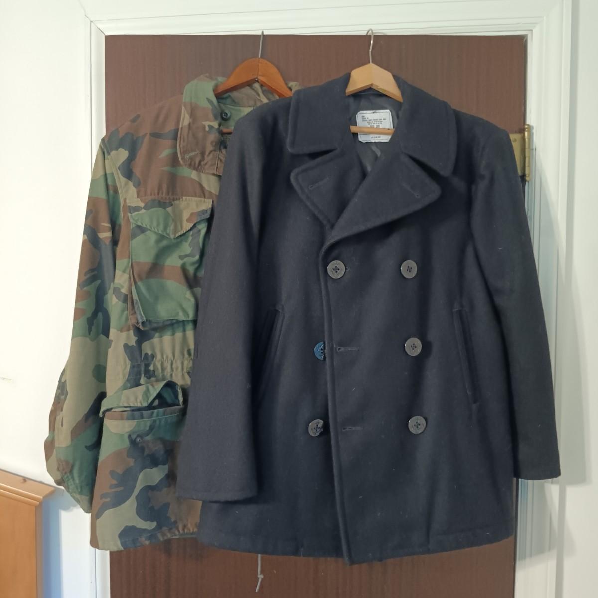 LOT 22: Vintage Military Wool Overcoat Size 38S with Camo Field Jacket Size Med Reg