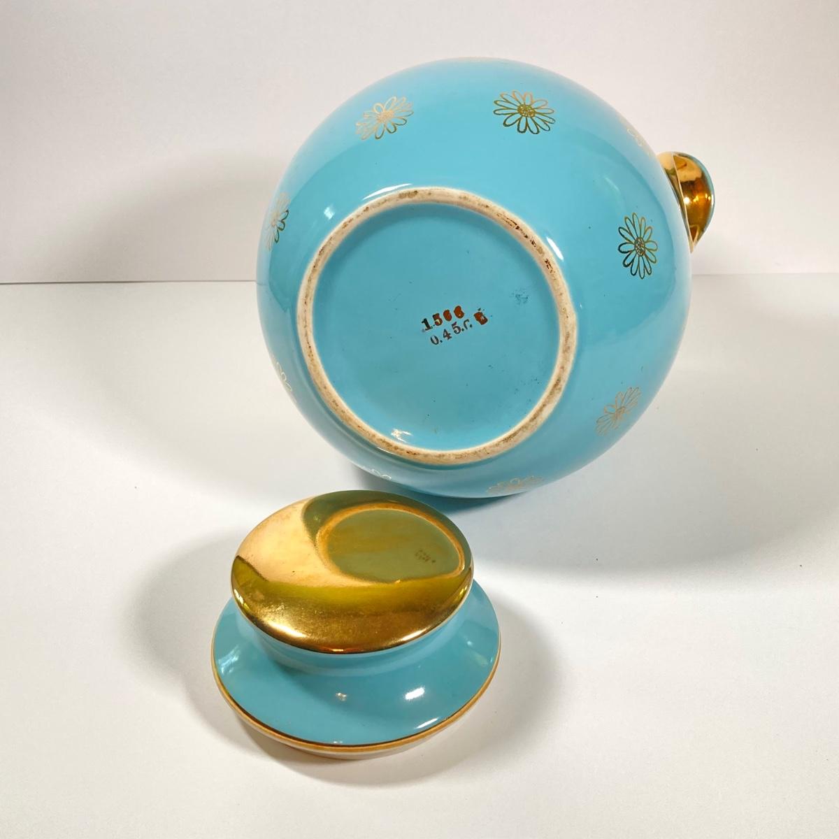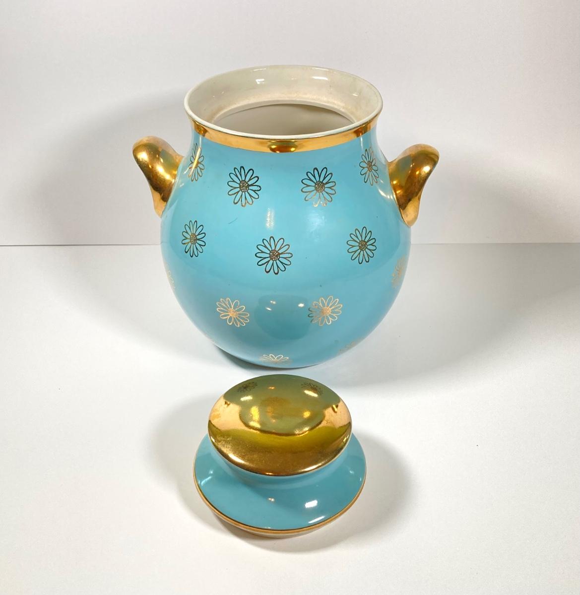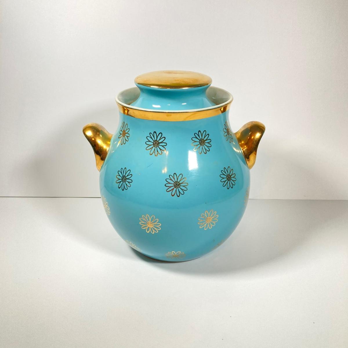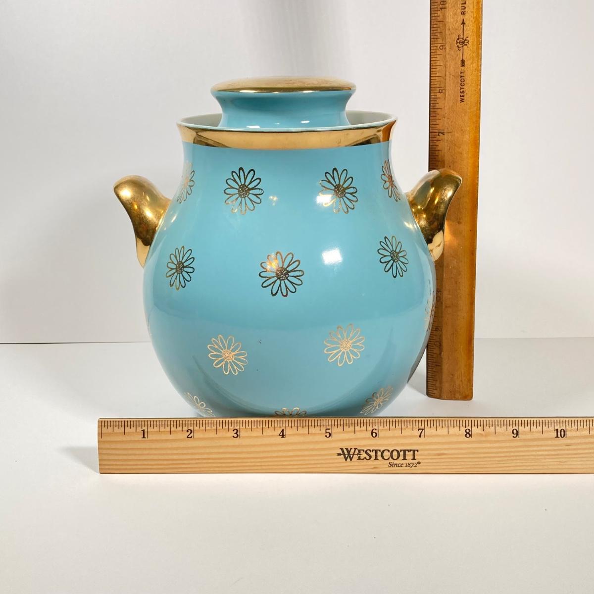 LOT 43: Vintage Hall's Cookie Jar - (Robin's Egg Blue with Gold Daisy Pattern)