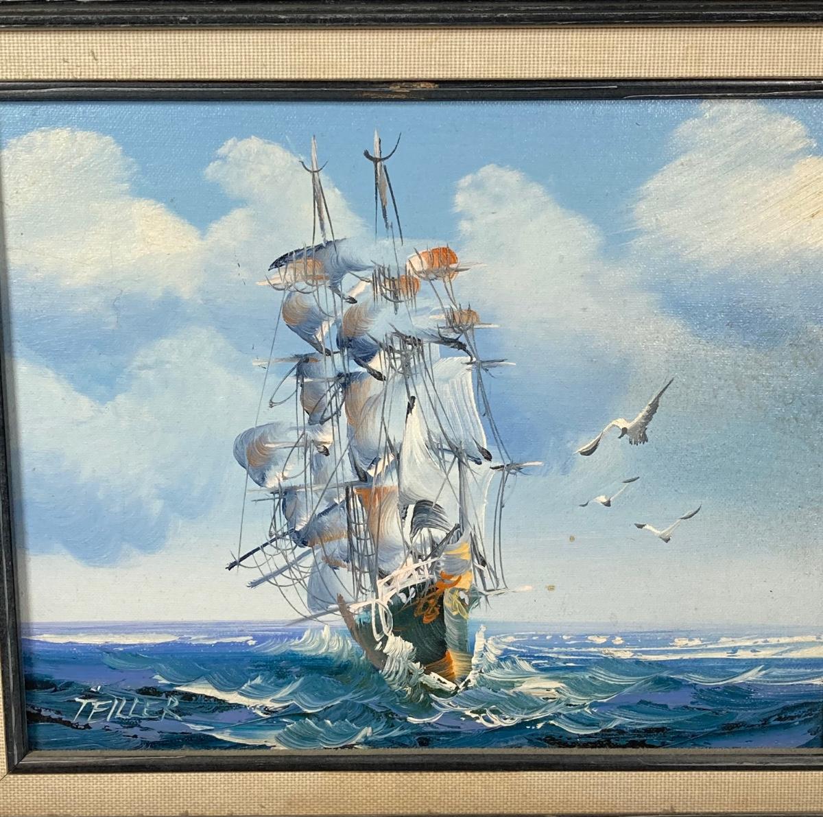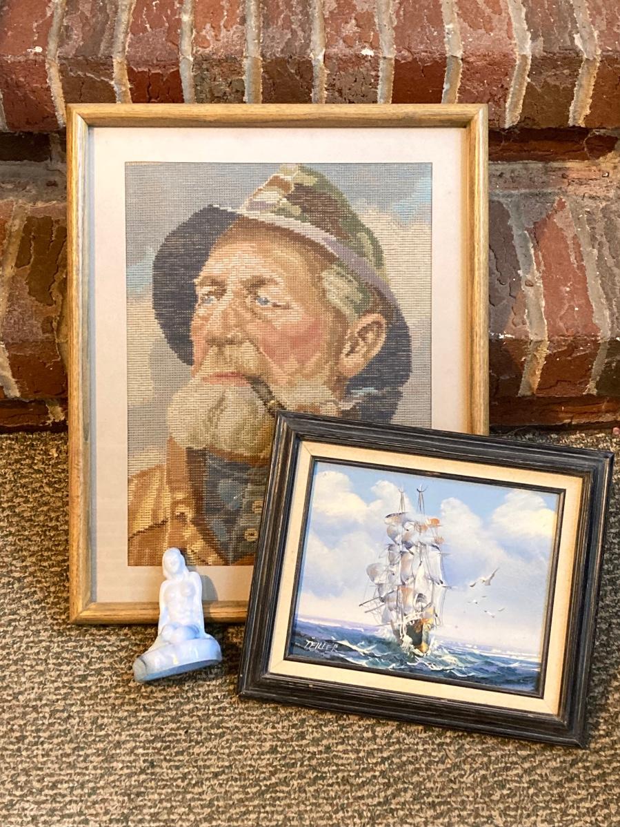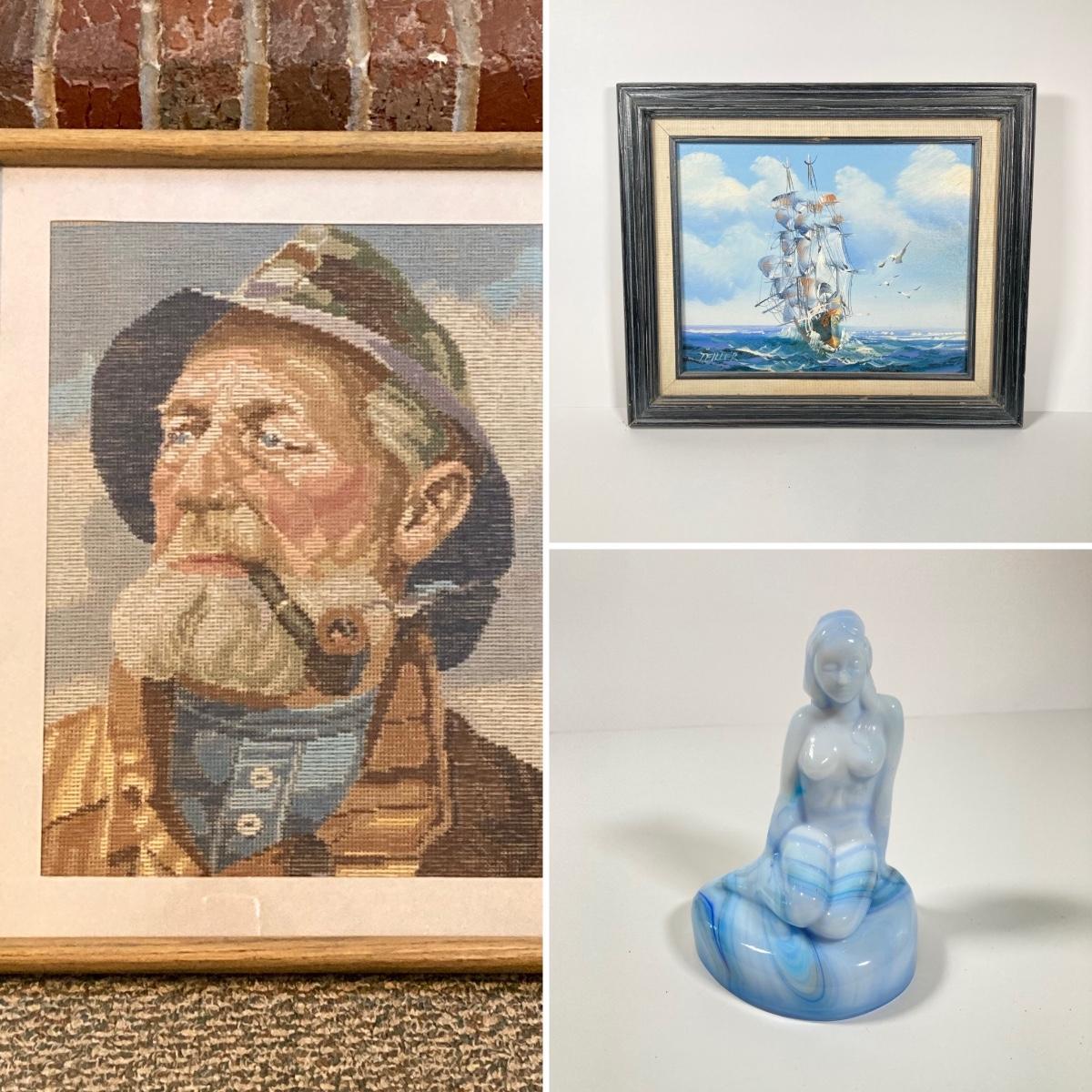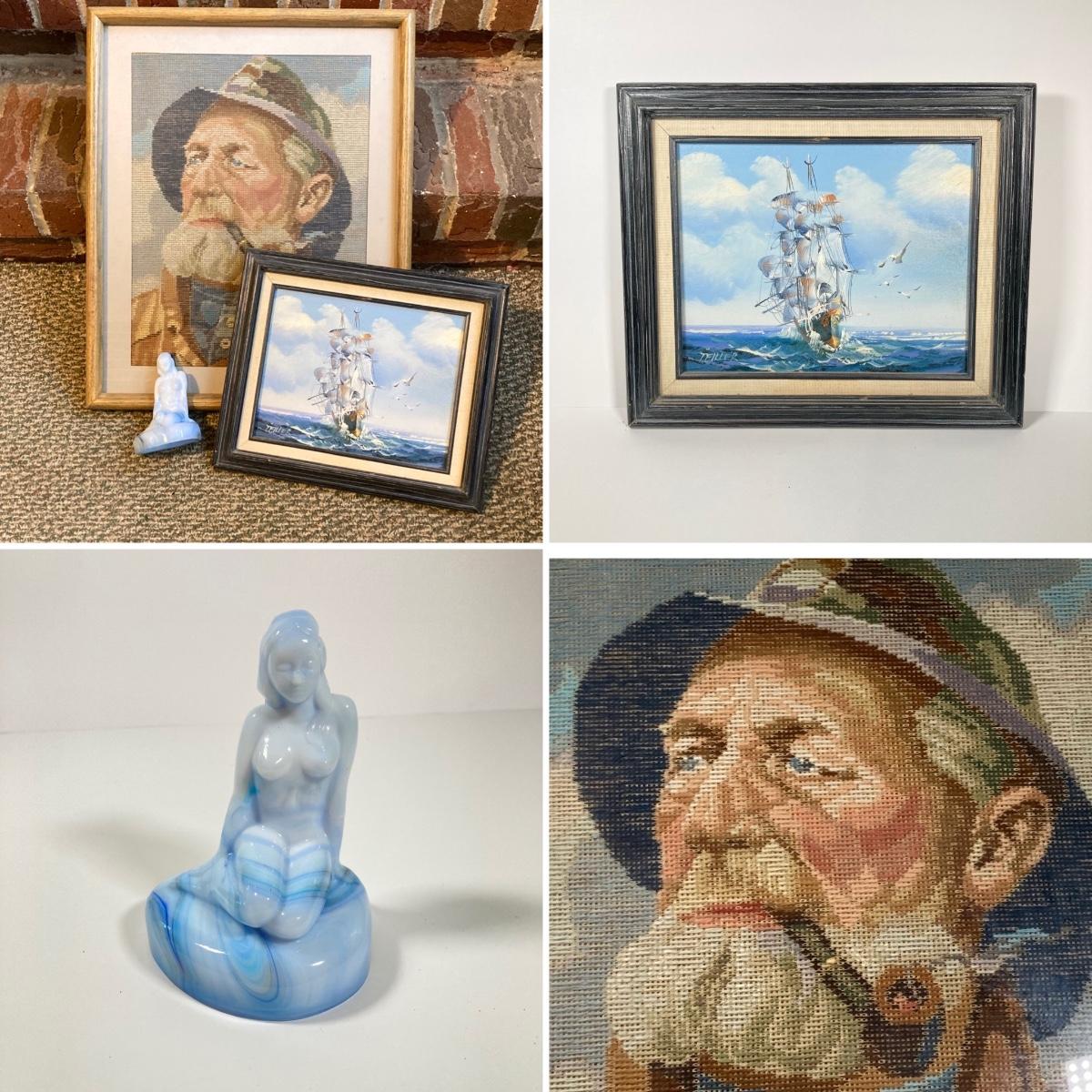 LOT 46: Nautical Art Collection - Signed by Artist Teiller Seascape Oil Painting, Blue / White Mermaid and Cross Stitch Wall Hanging
