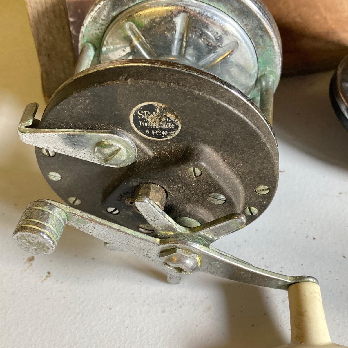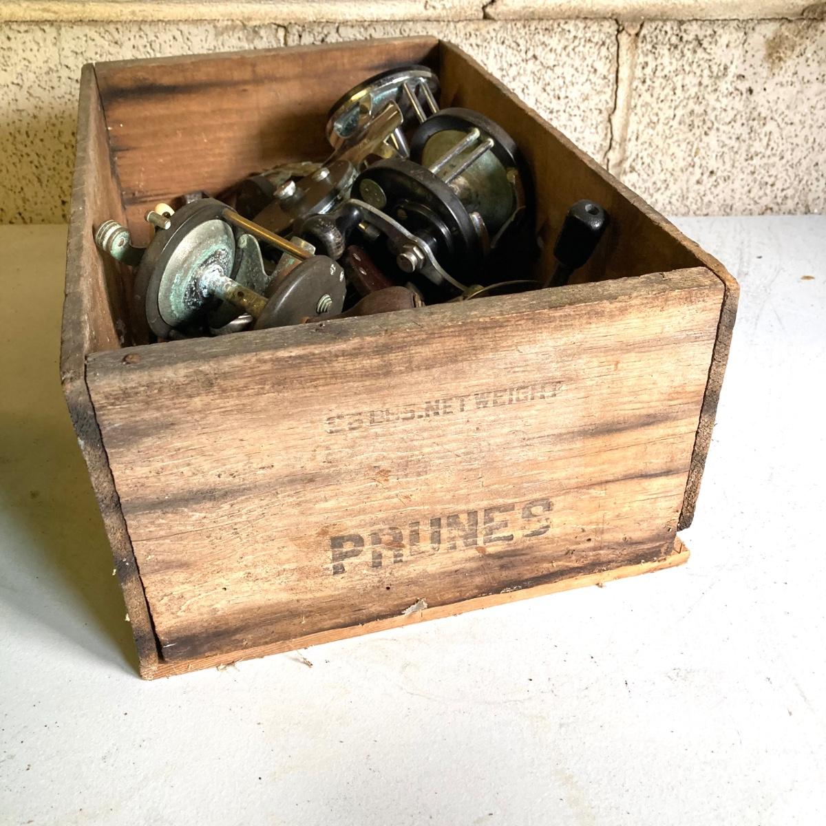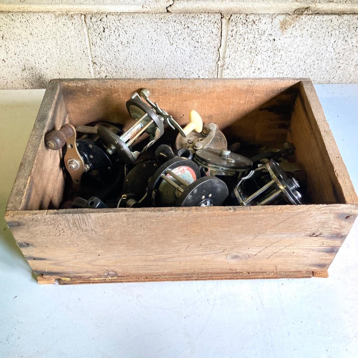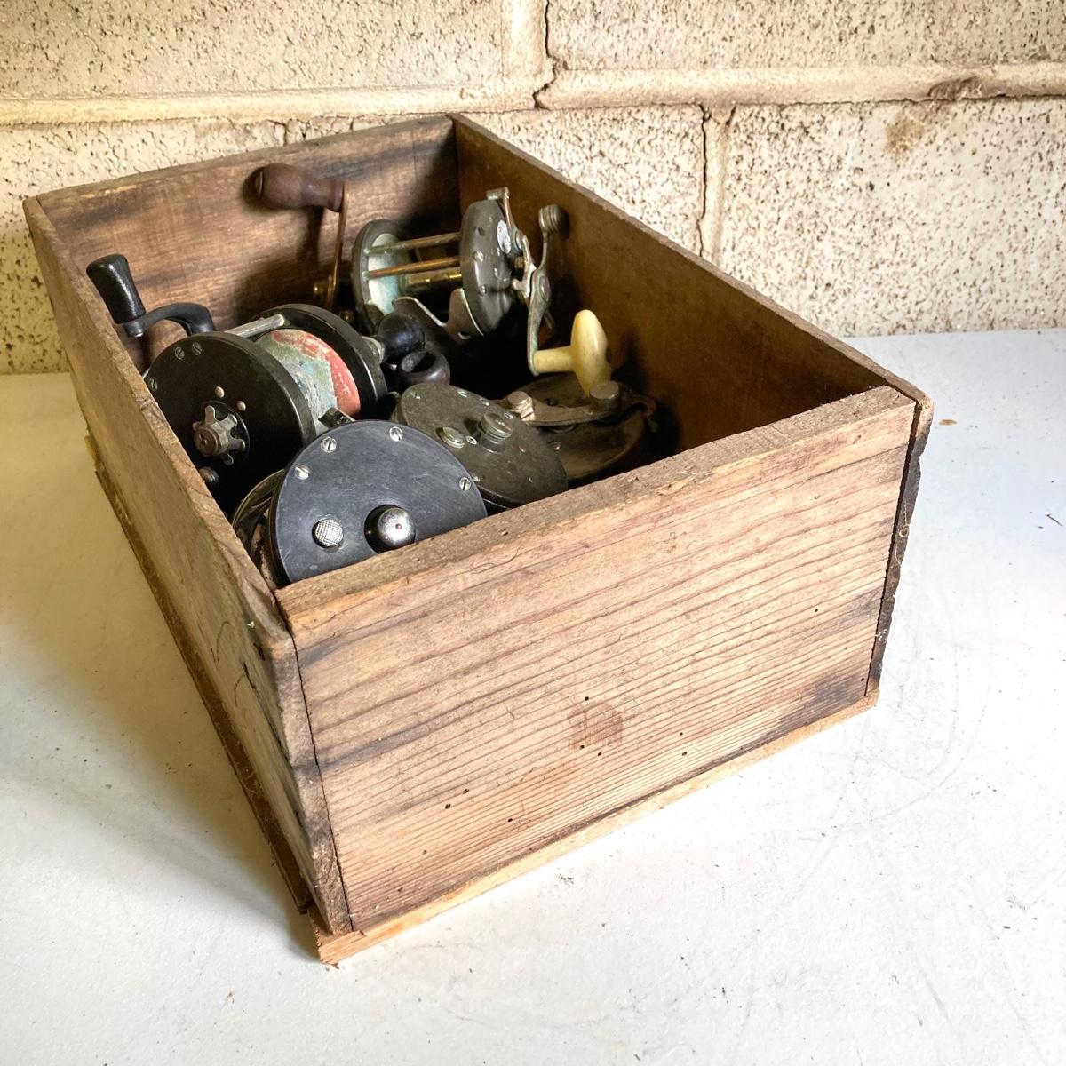 LOT 57: Vintage Wooden Box with Collection of Fishing Reels - Ocean City, Penn, Sears and More