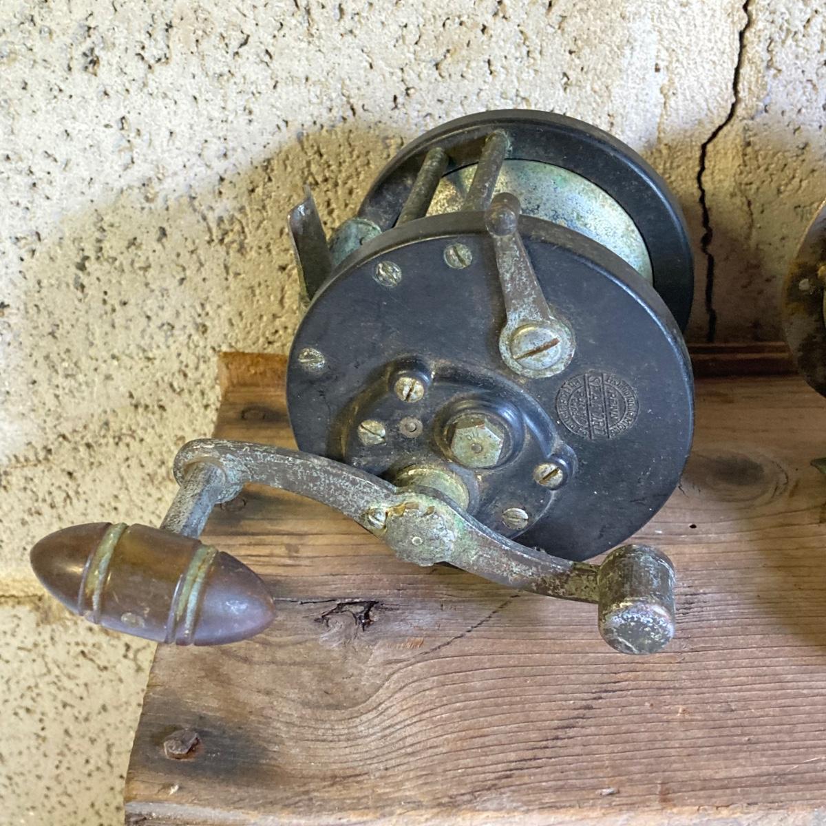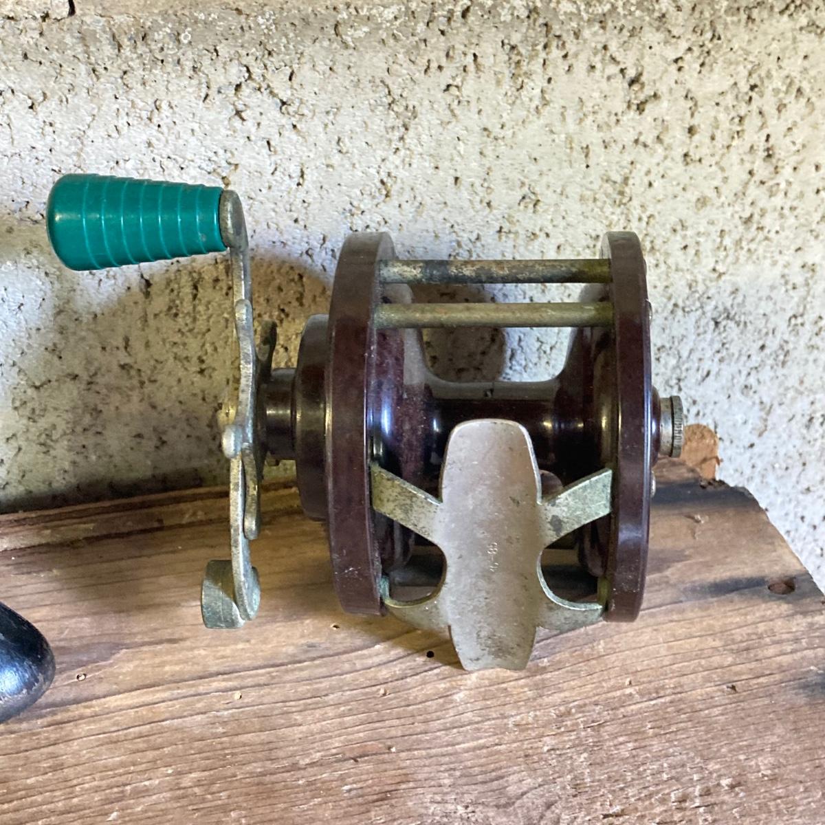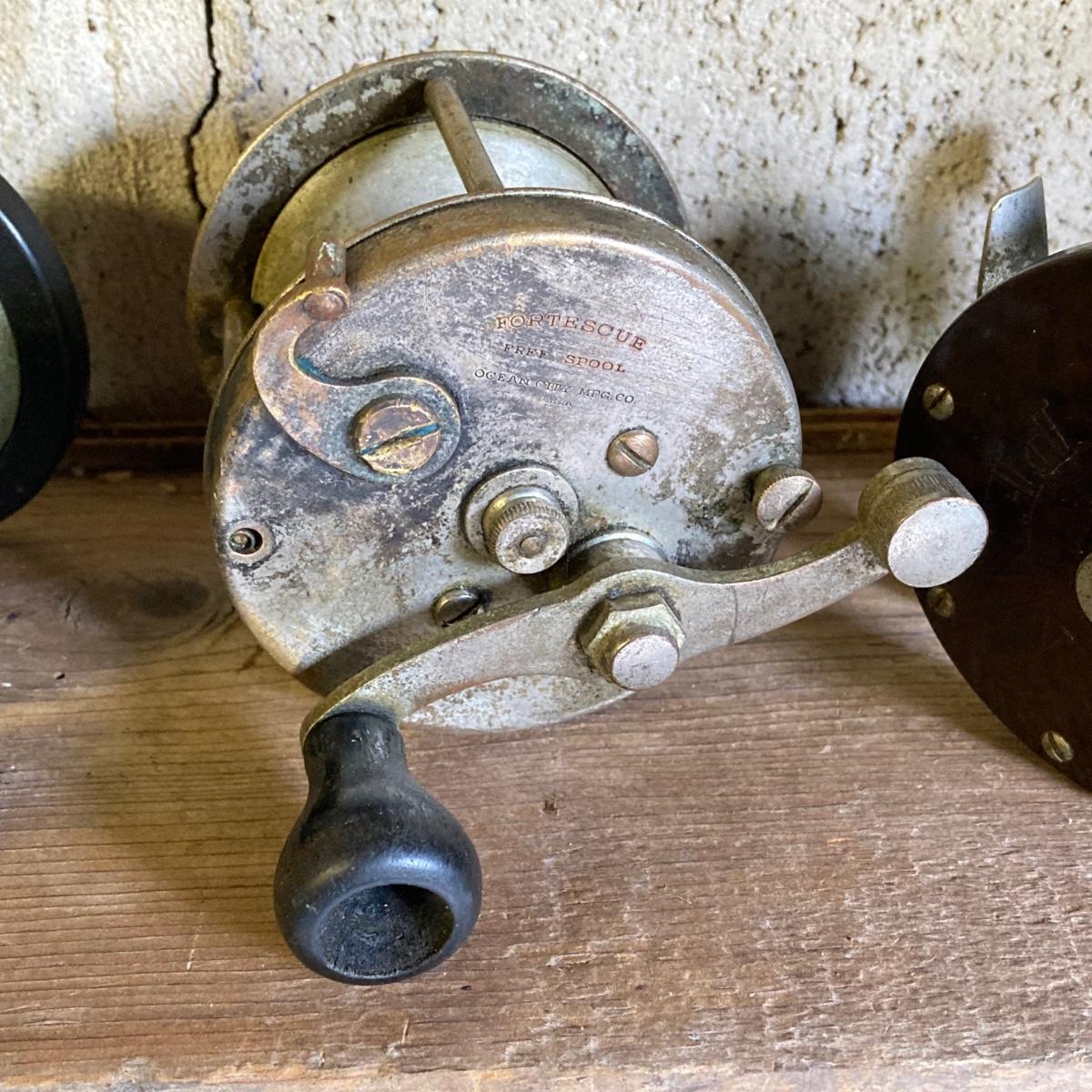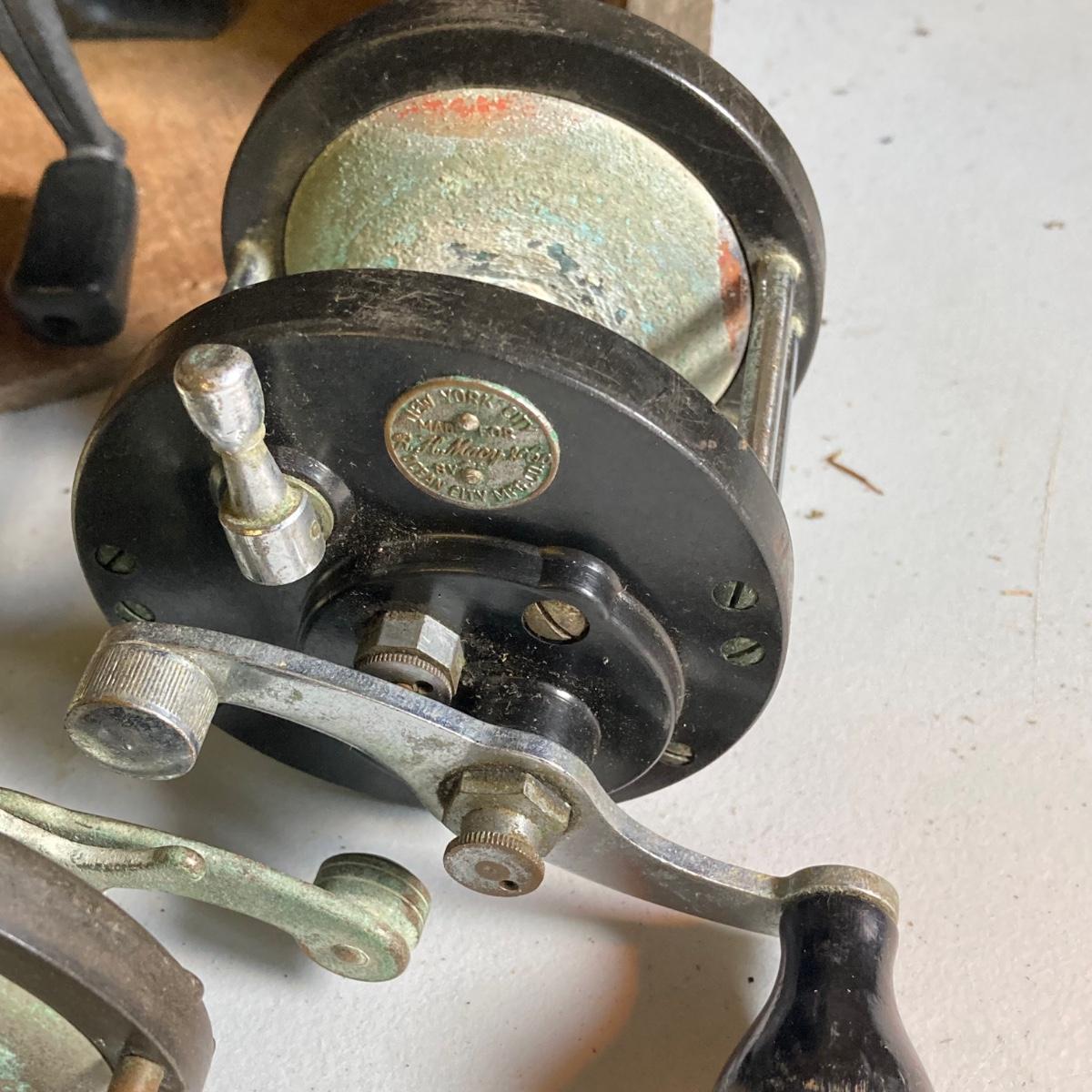 LOT 57: Vintage Wooden Box with Collection of Fishing Reels - Ocean City, Penn, Sears and More