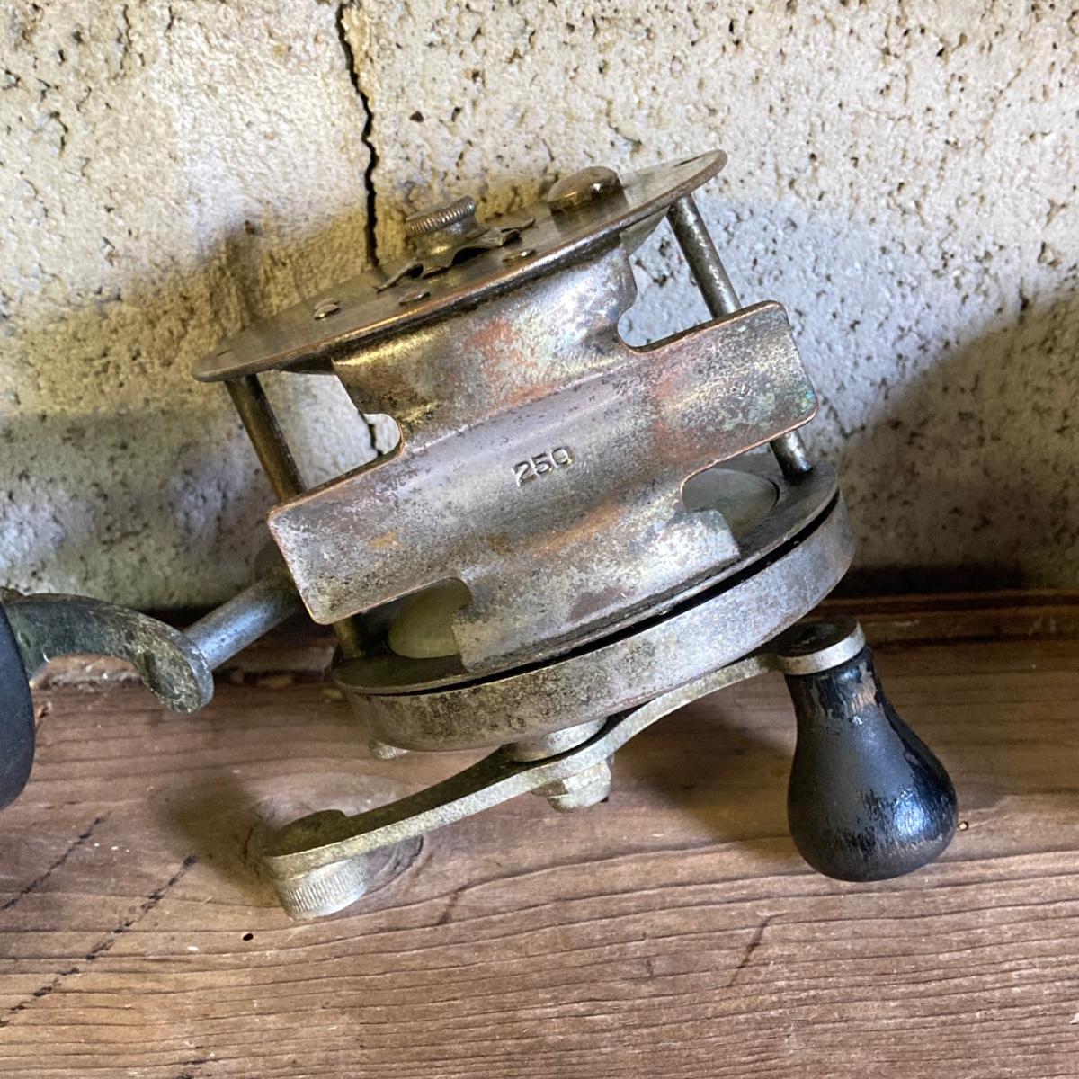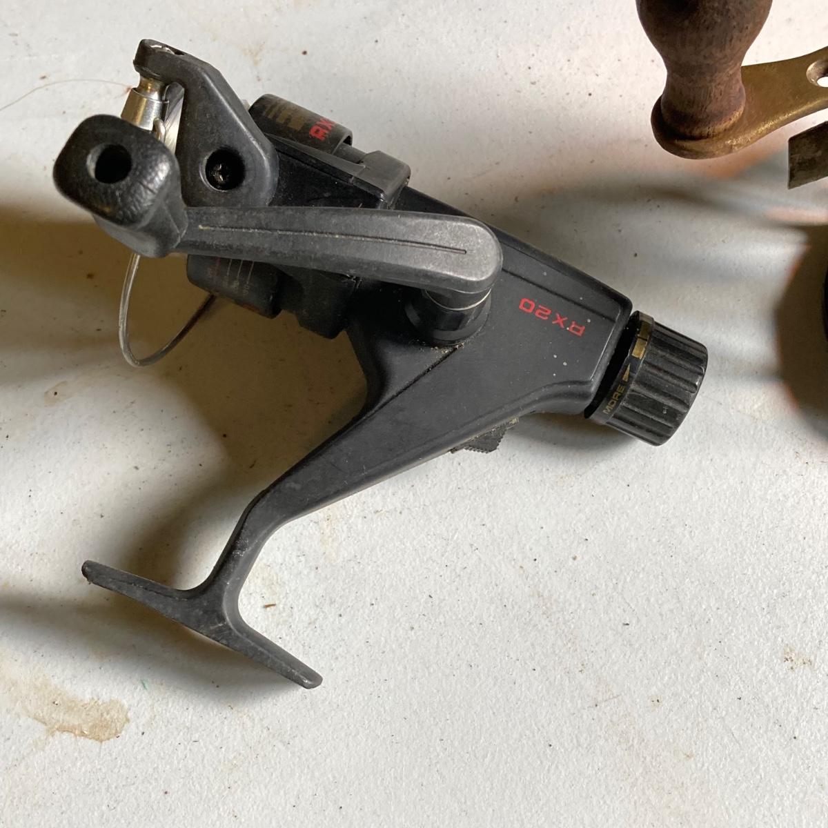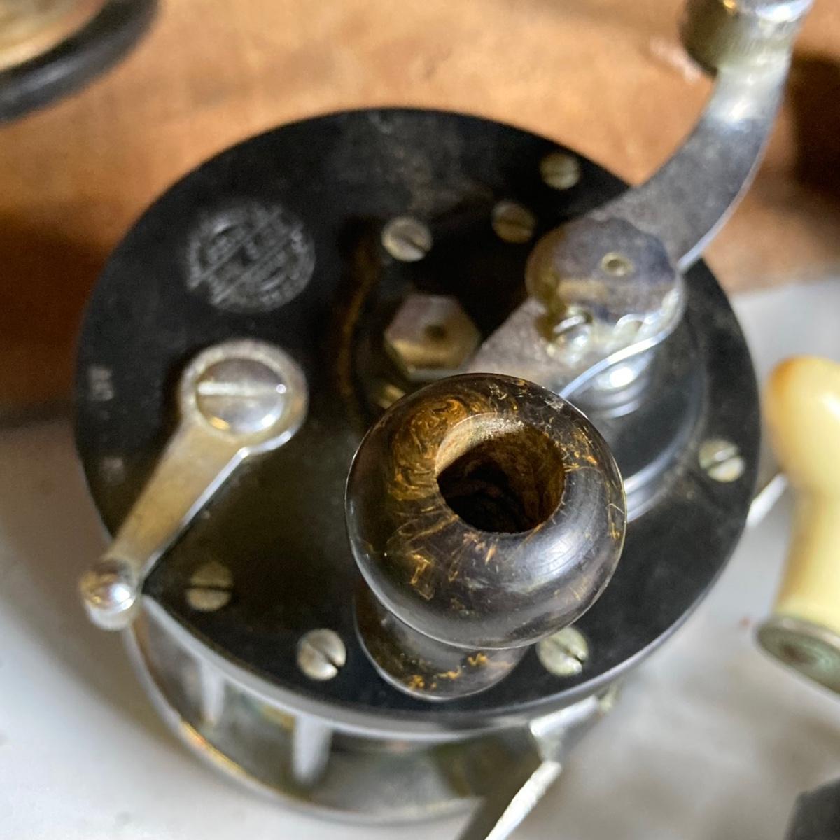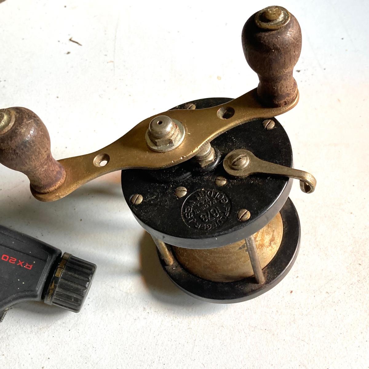 LOT 57: Vintage Wooden Box with Collection of Fishing Reels - Ocean City, Penn, Sears and More