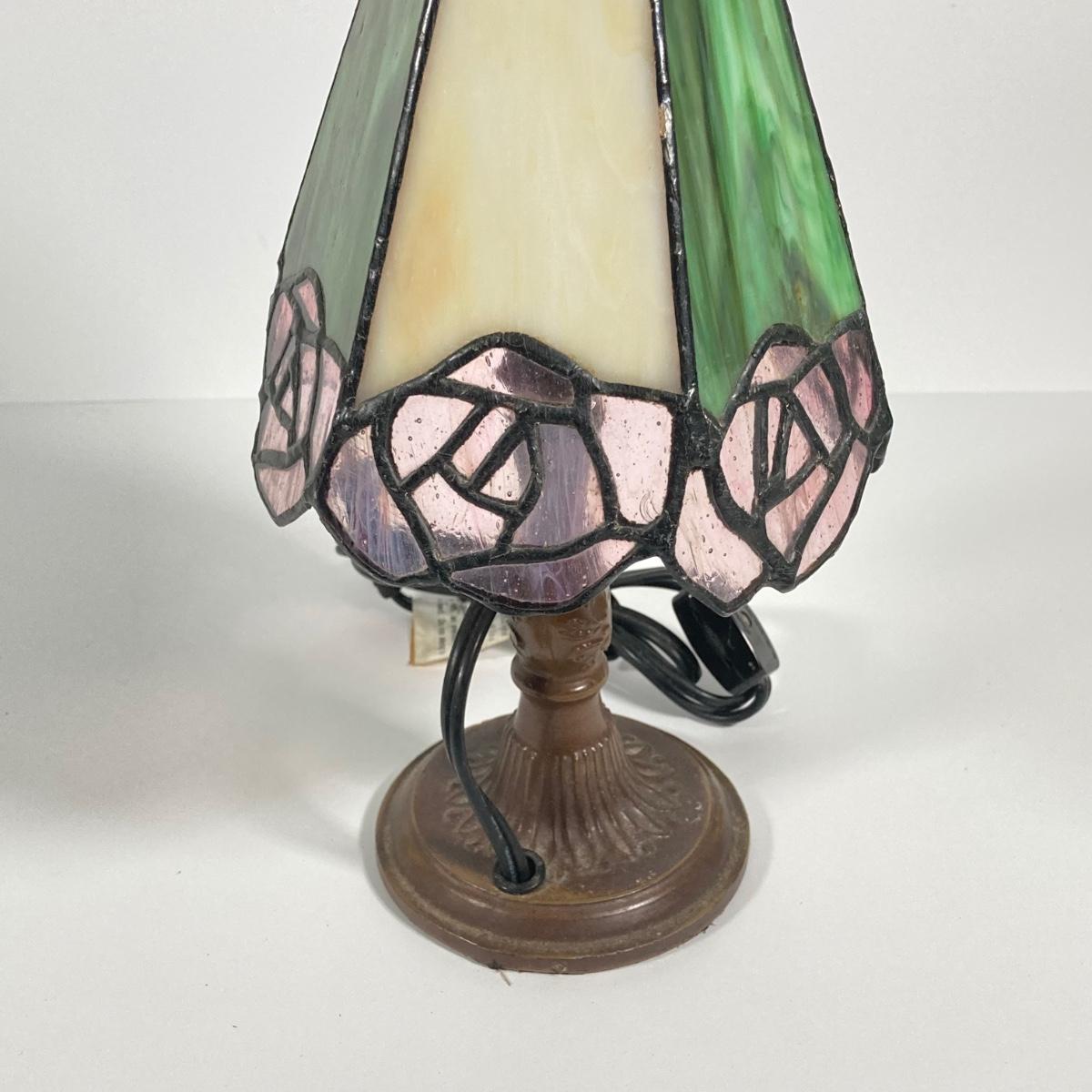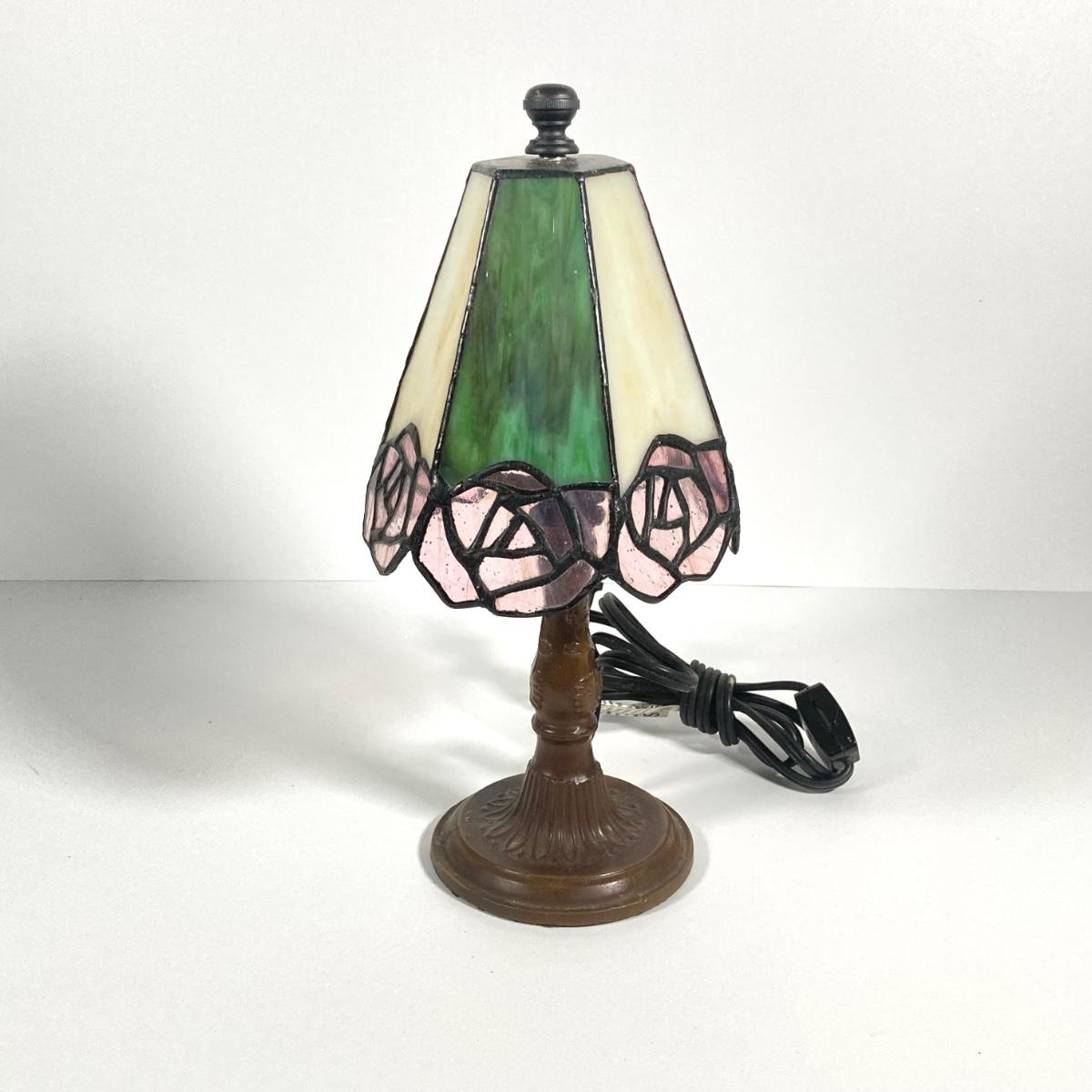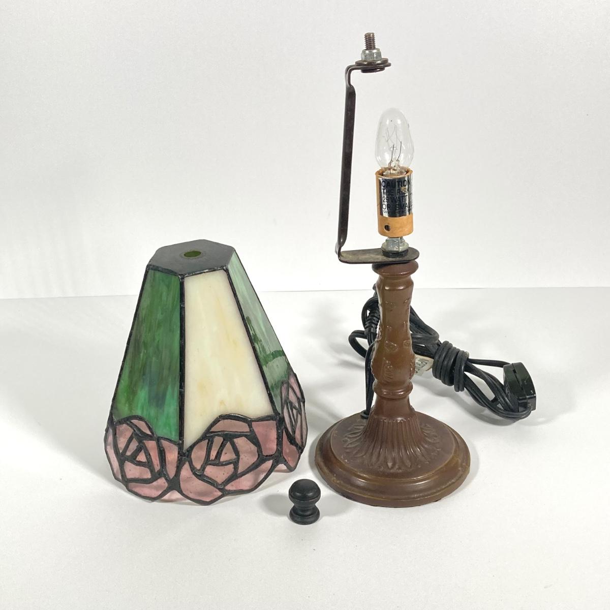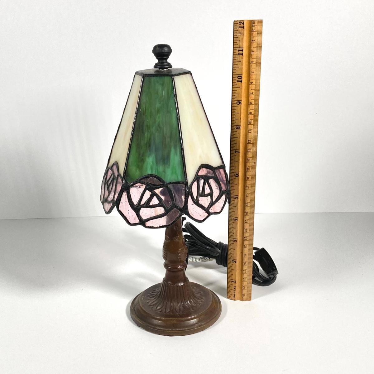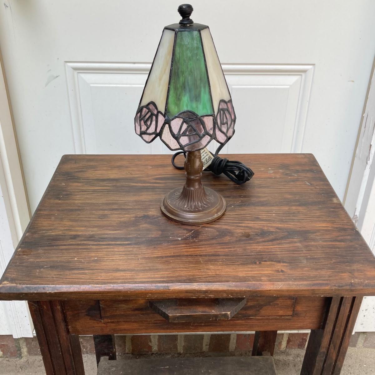 LOT 64: Small Stained Glass Tiffany Style Table Lamp and Wooden Side Accent Table