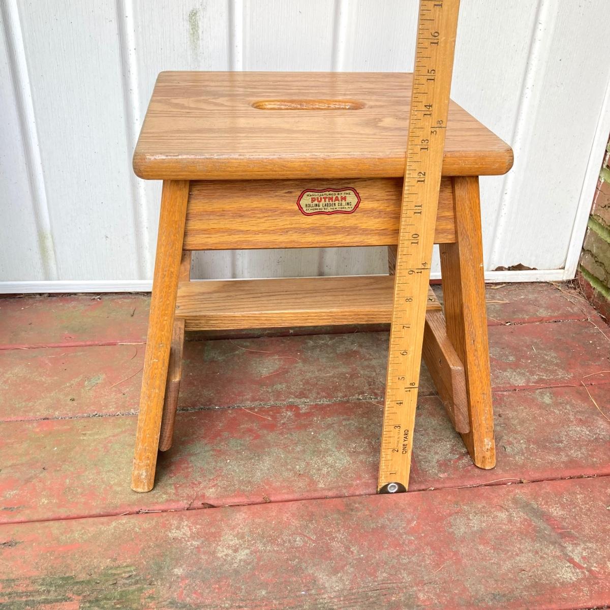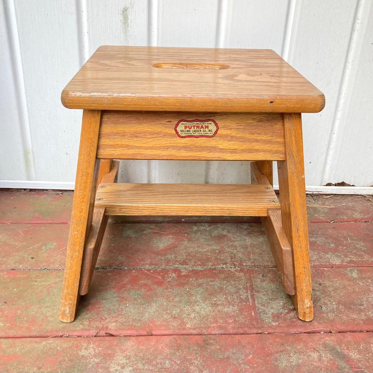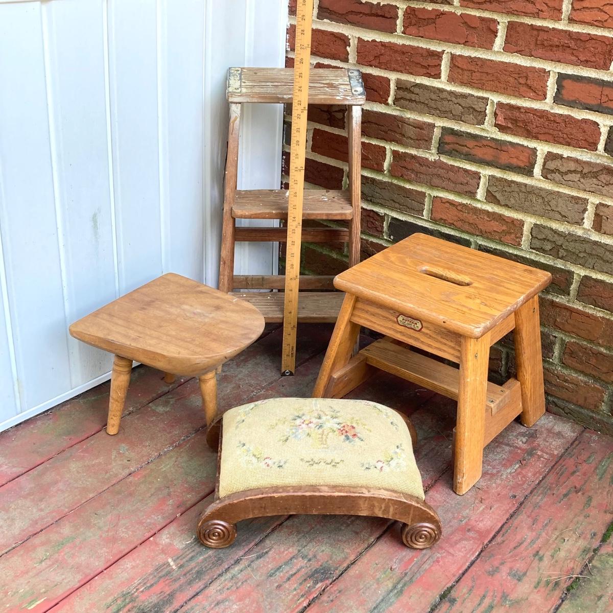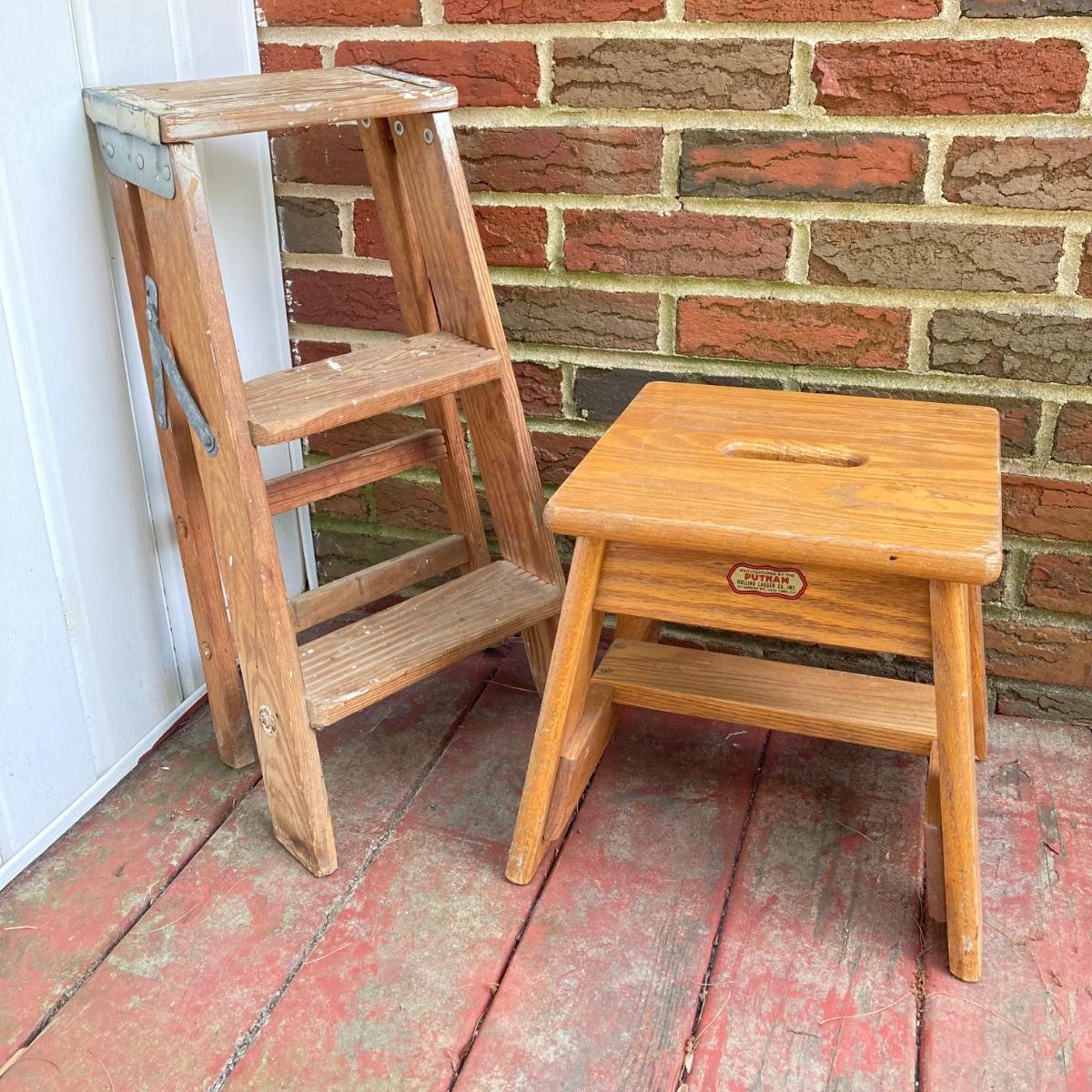 LOT 66: Vintage Wooden Stools and Step Ladder - Putnam Rolling Ladder Co. Inc. Included