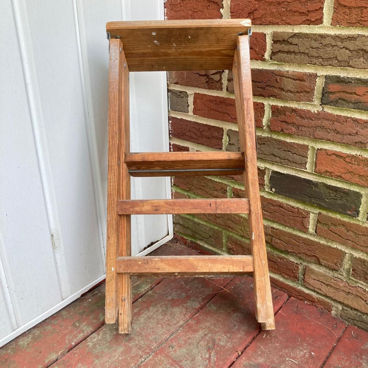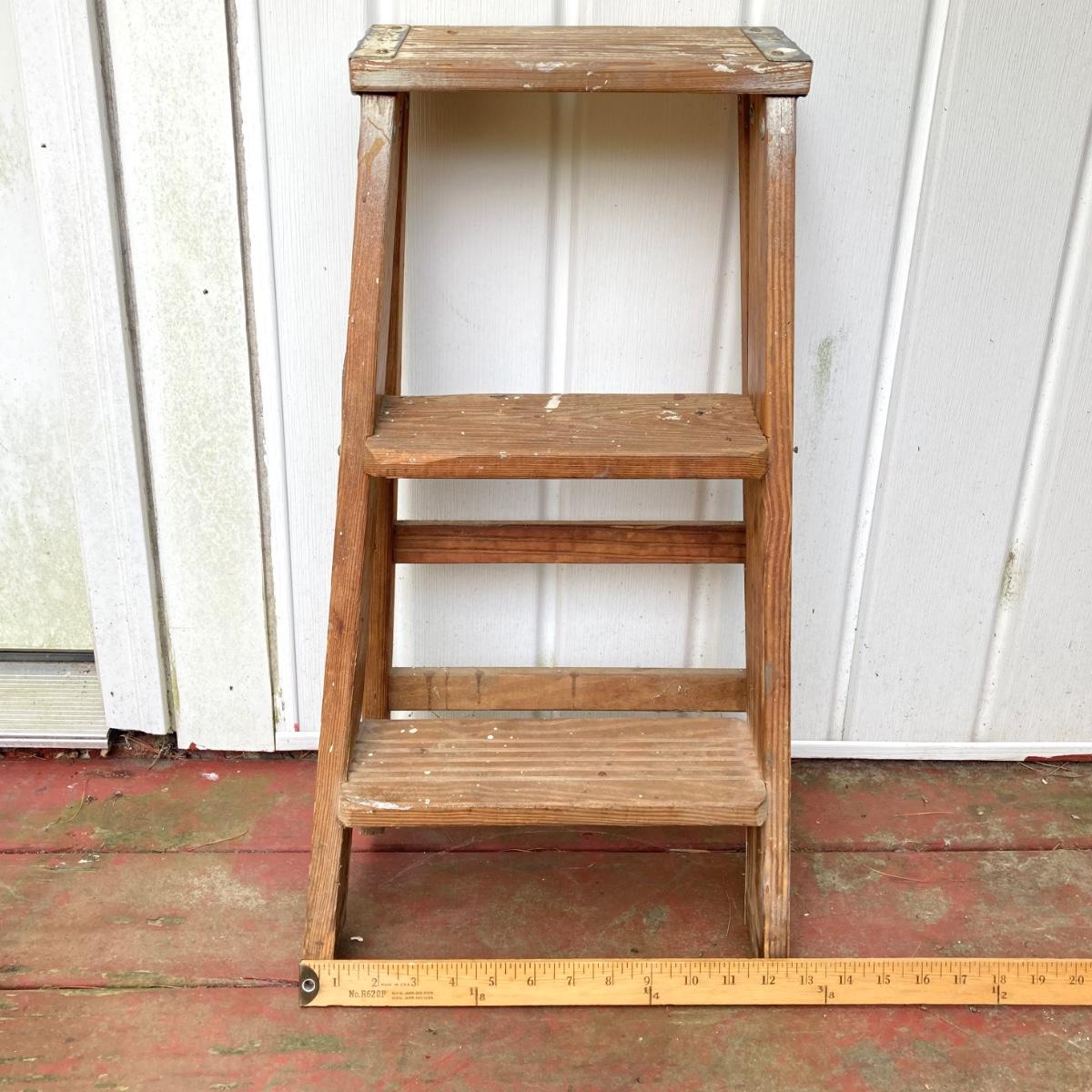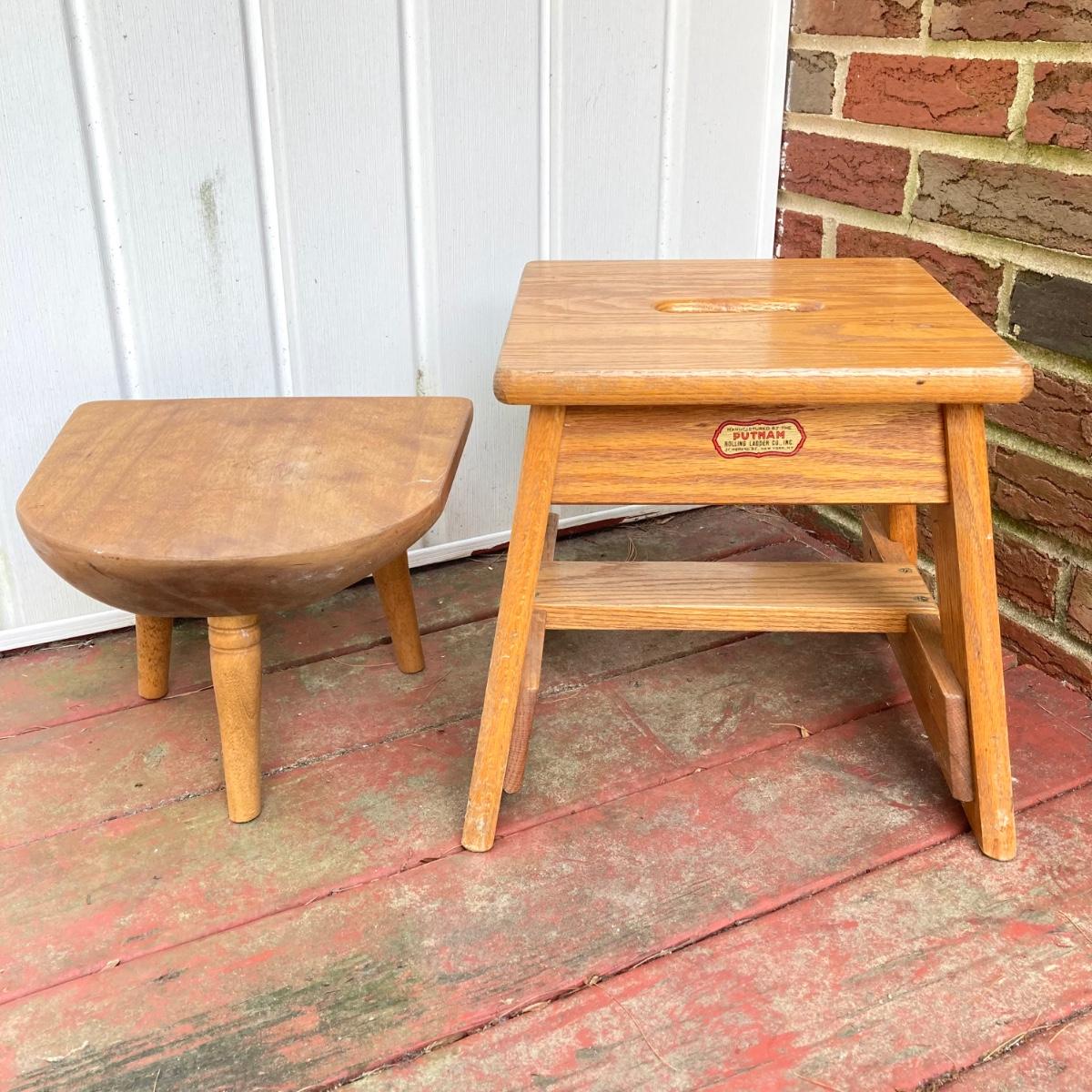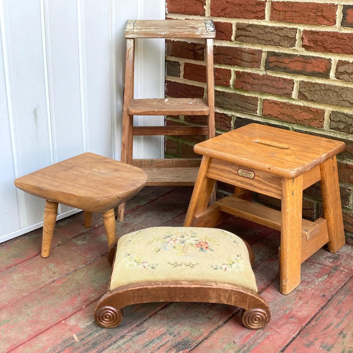 LOT 66: Vintage Wooden Stools and Step Ladder - Putnam Rolling Ladder Co. Inc. Included