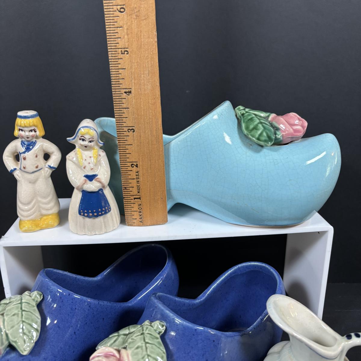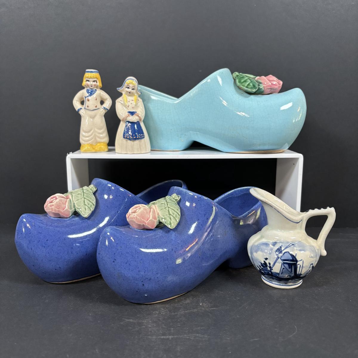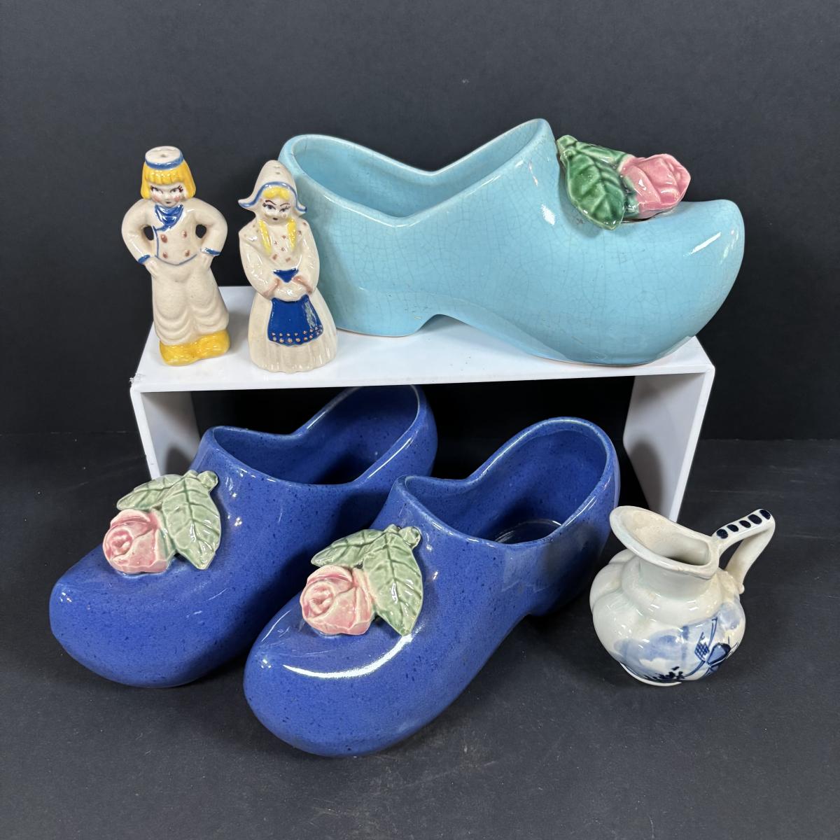 LOT 104: McCoy Dutch Shoe Planters, Delft Blue Pitcher, Ceramic Art Studio Wee Dutch Boy & Girl Salt/Pepper Shakers