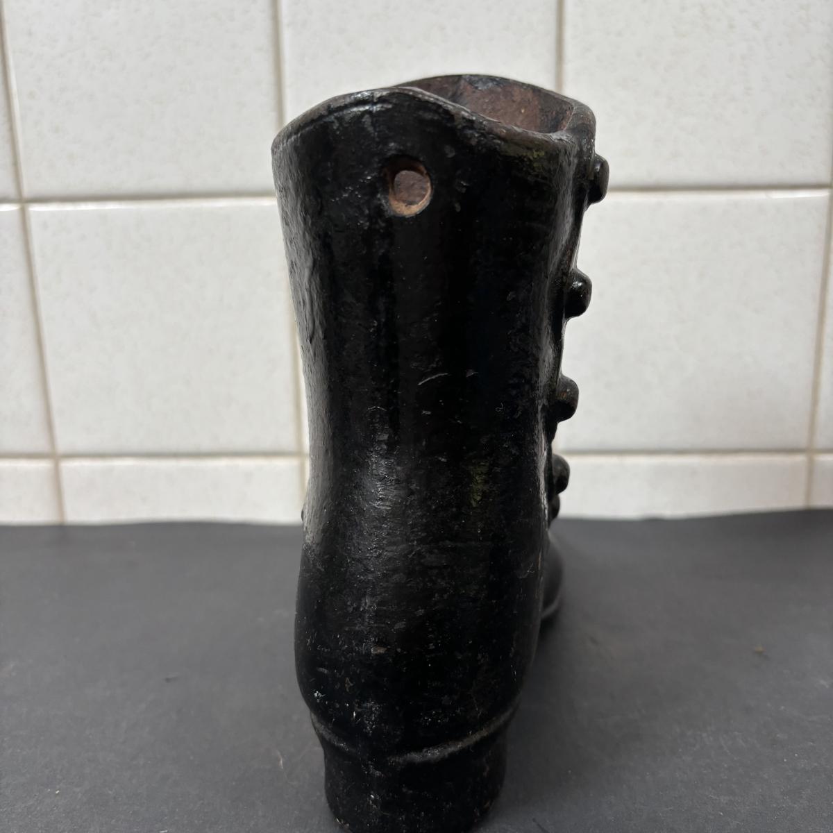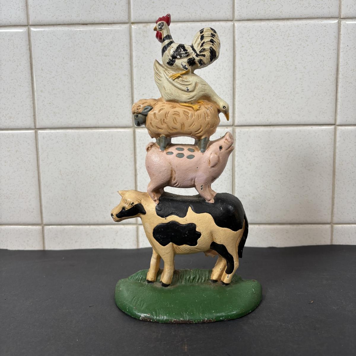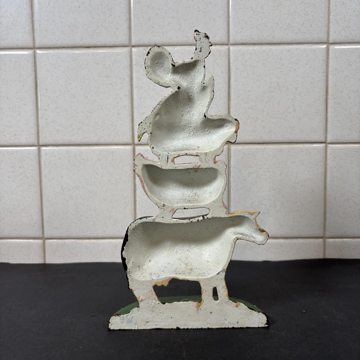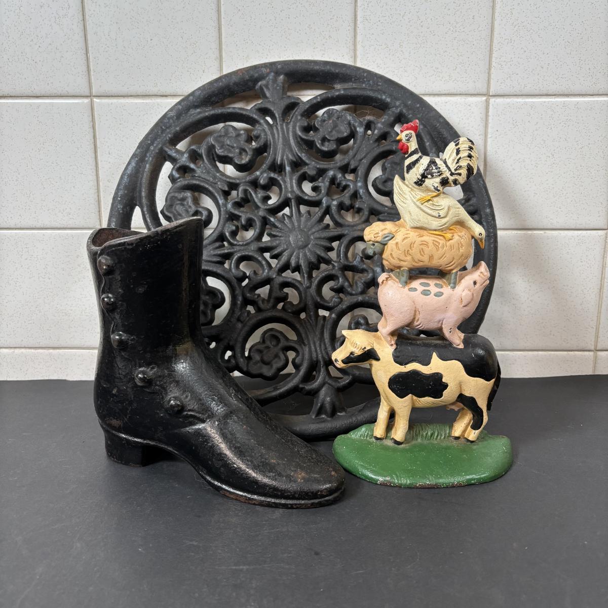 LOT 110: Cast Iron Collection: Large Round Architecture Trivet, Farm Animal Door Stop and High-Top Ladies Boot Door Stop