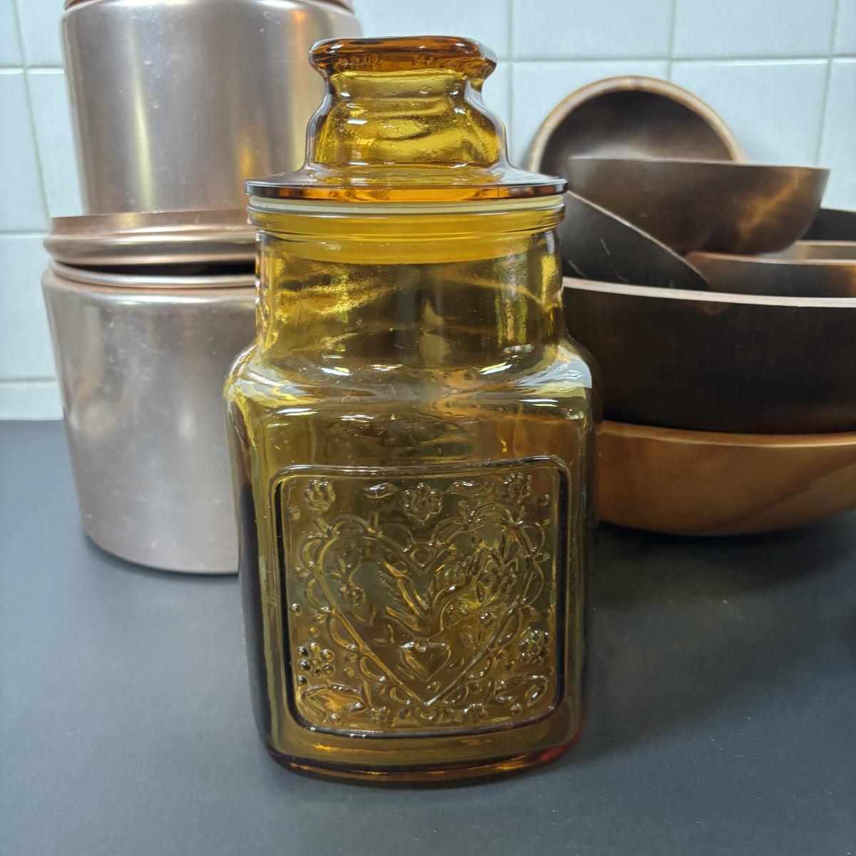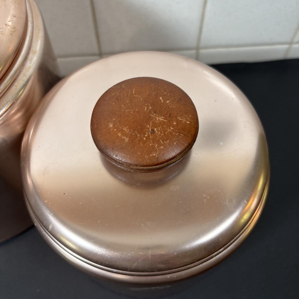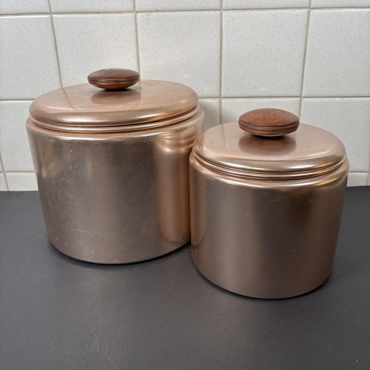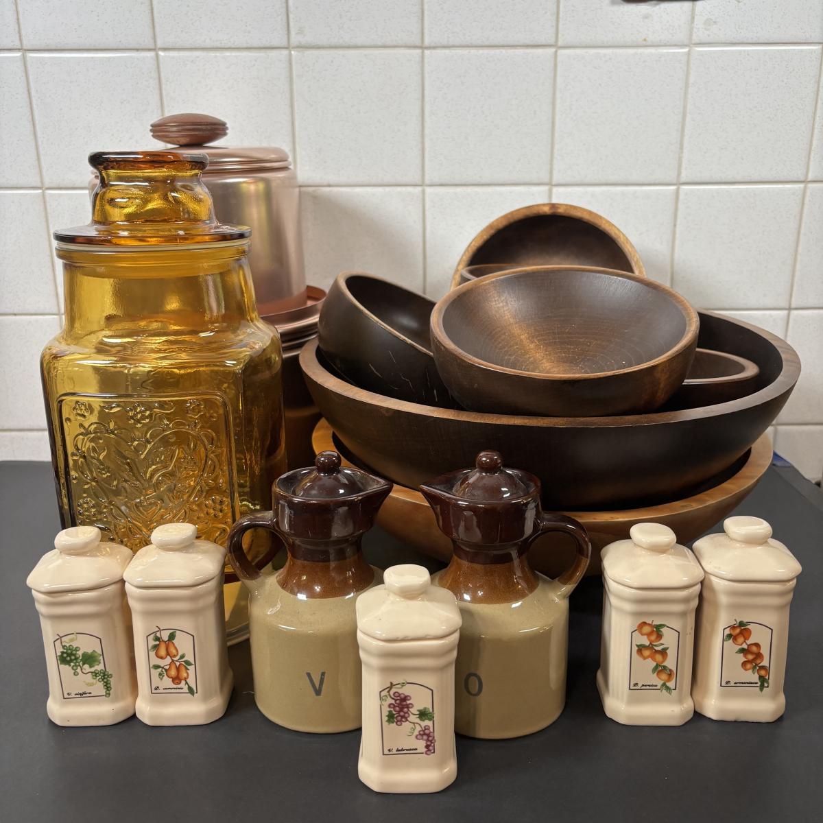 LOT 114: Weston Bowl Mill Bowl Collection, Wheaton Amber Jar, 2-Mirro Rose Gold/Copper Canisters, Elgin Home Spice Jars
