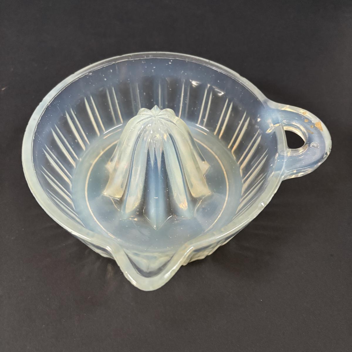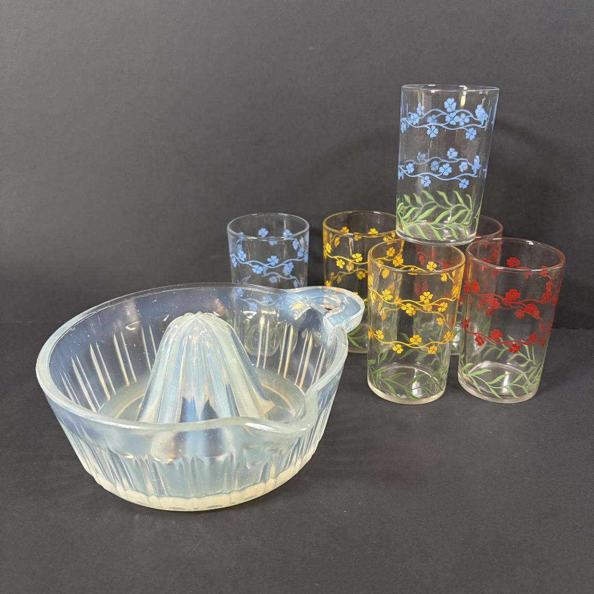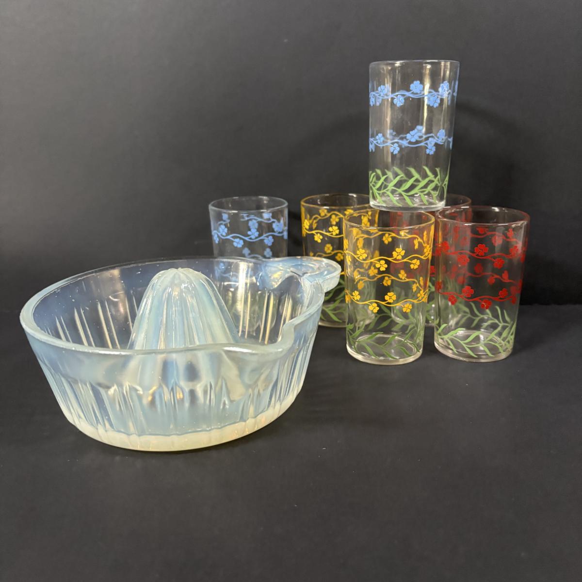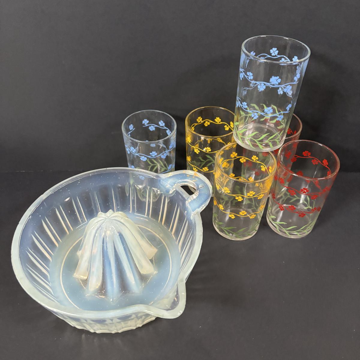 LOT 120: Vintage Opalescent Citrus Reamer/Juicer along with Swanky Swig- Kraft Foods Juice Glasses (6)
