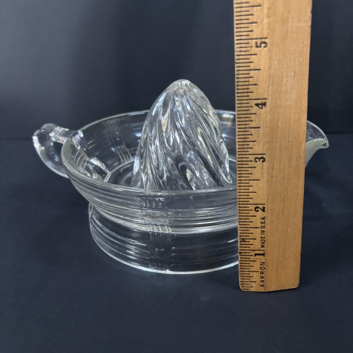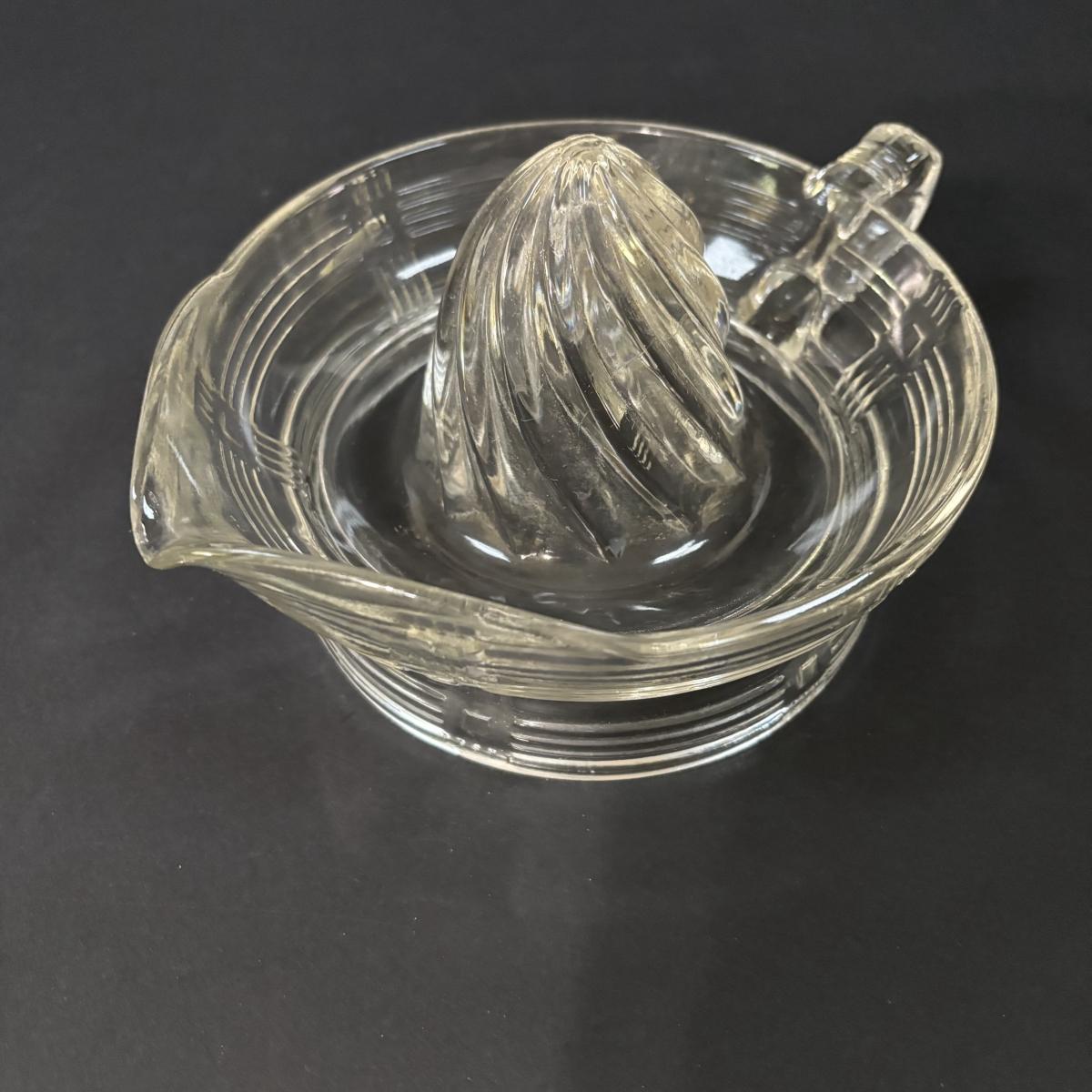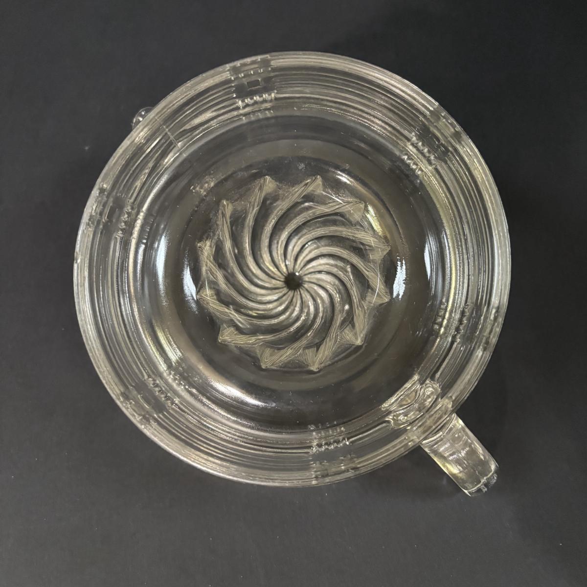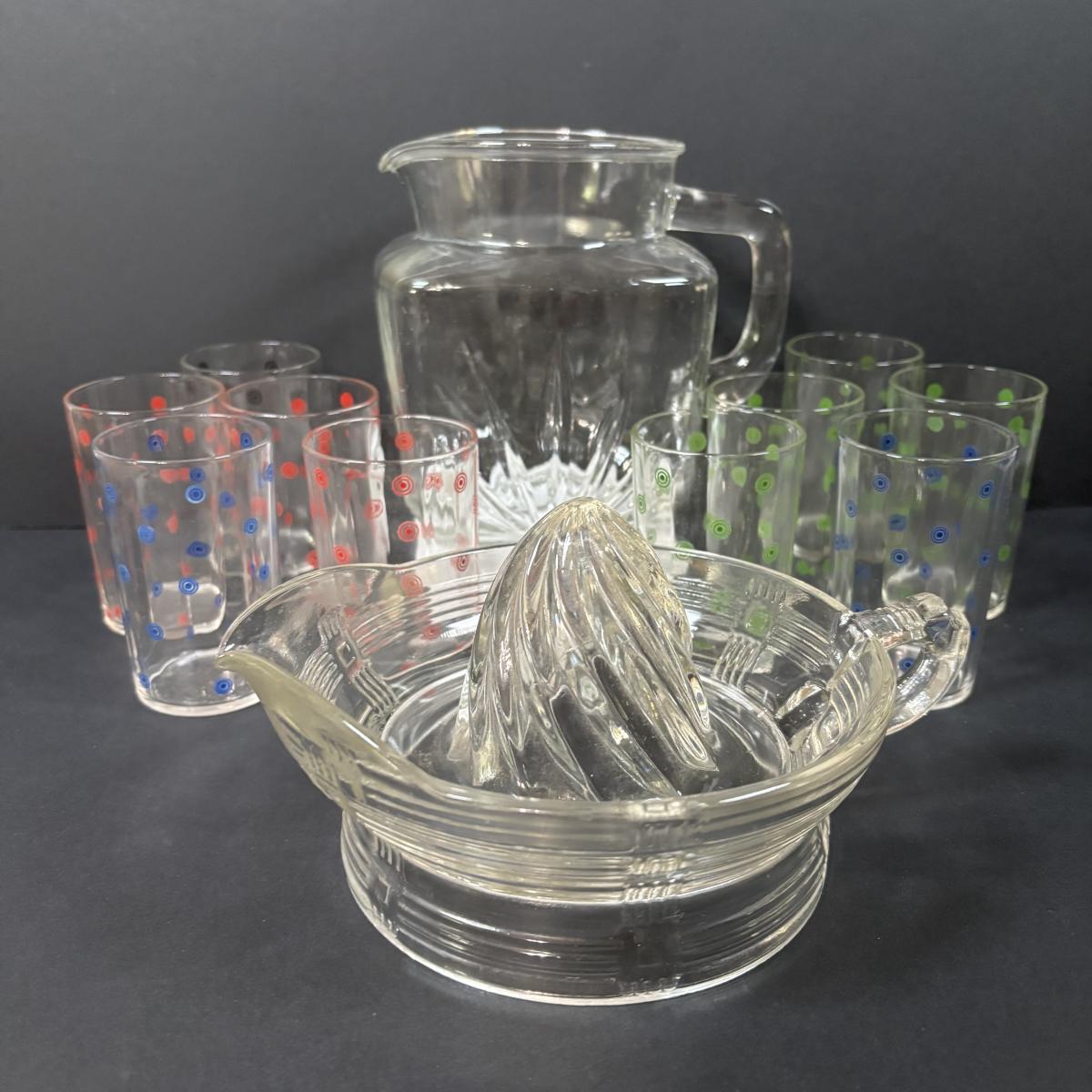 LOT 122: Vintage Hazel Atlas Citrus Reamer/Juicer along with 10 Kraft Swanky Swig Juice Glass & Square Federal Glass Pitcher