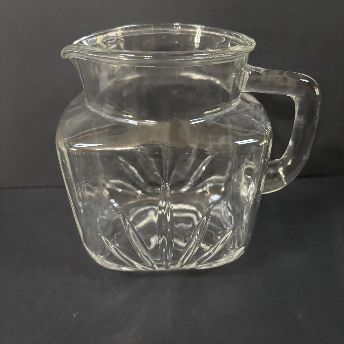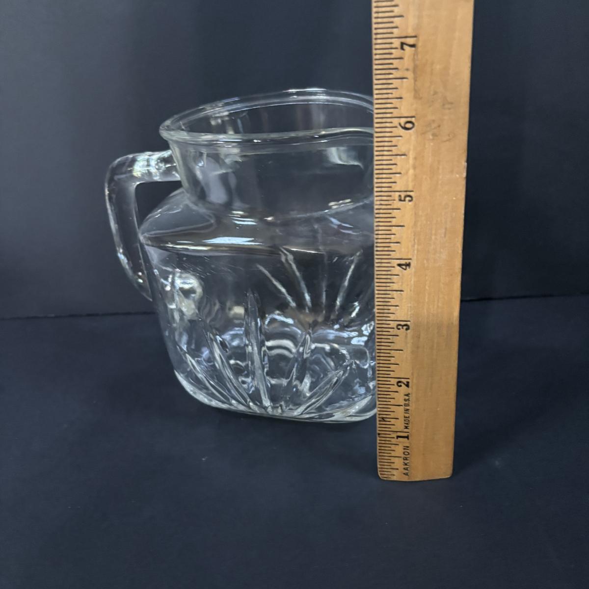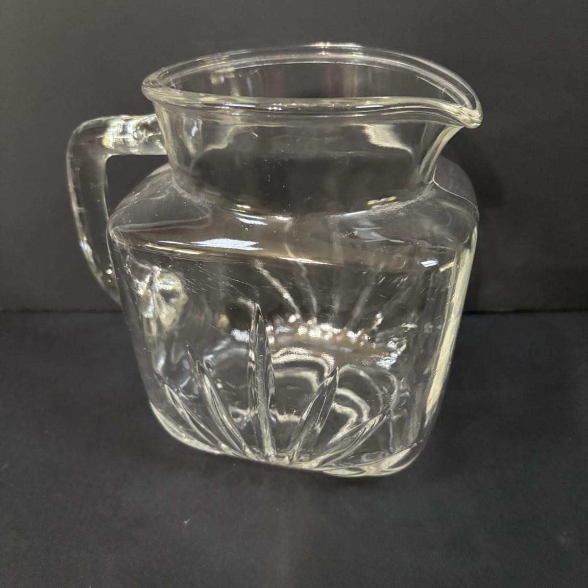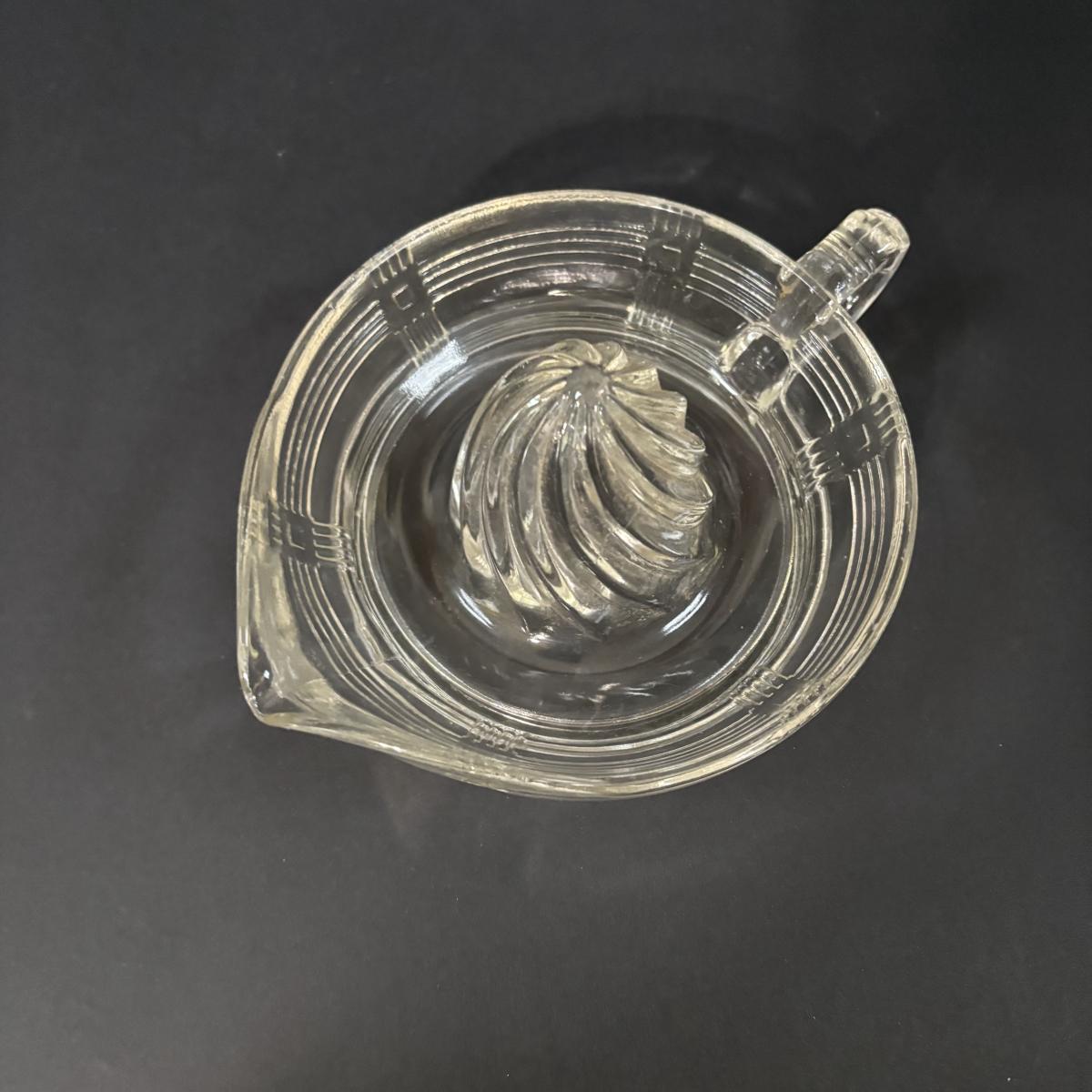 LOT 122: Vintage Hazel Atlas Citrus Reamer/Juicer along with 10 Kraft Swanky Swig Juice Glass & Square Federal Glass Pitcher