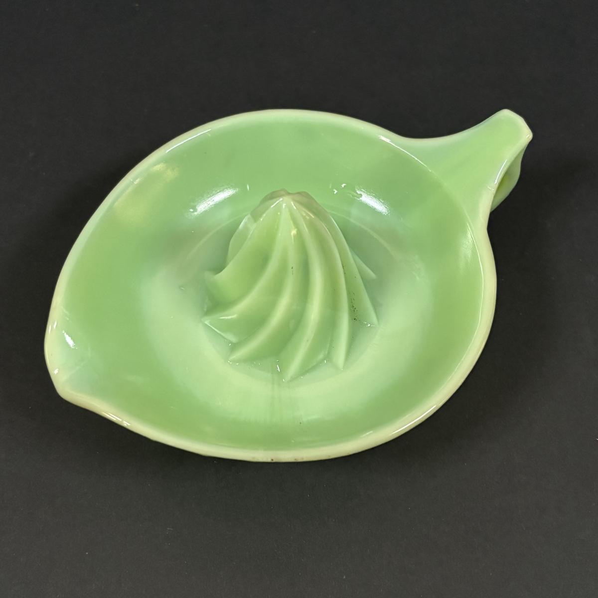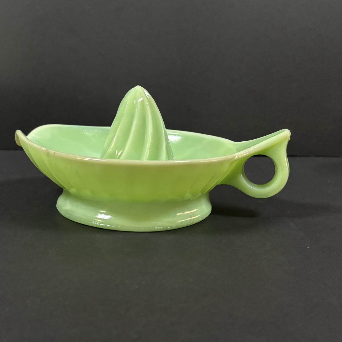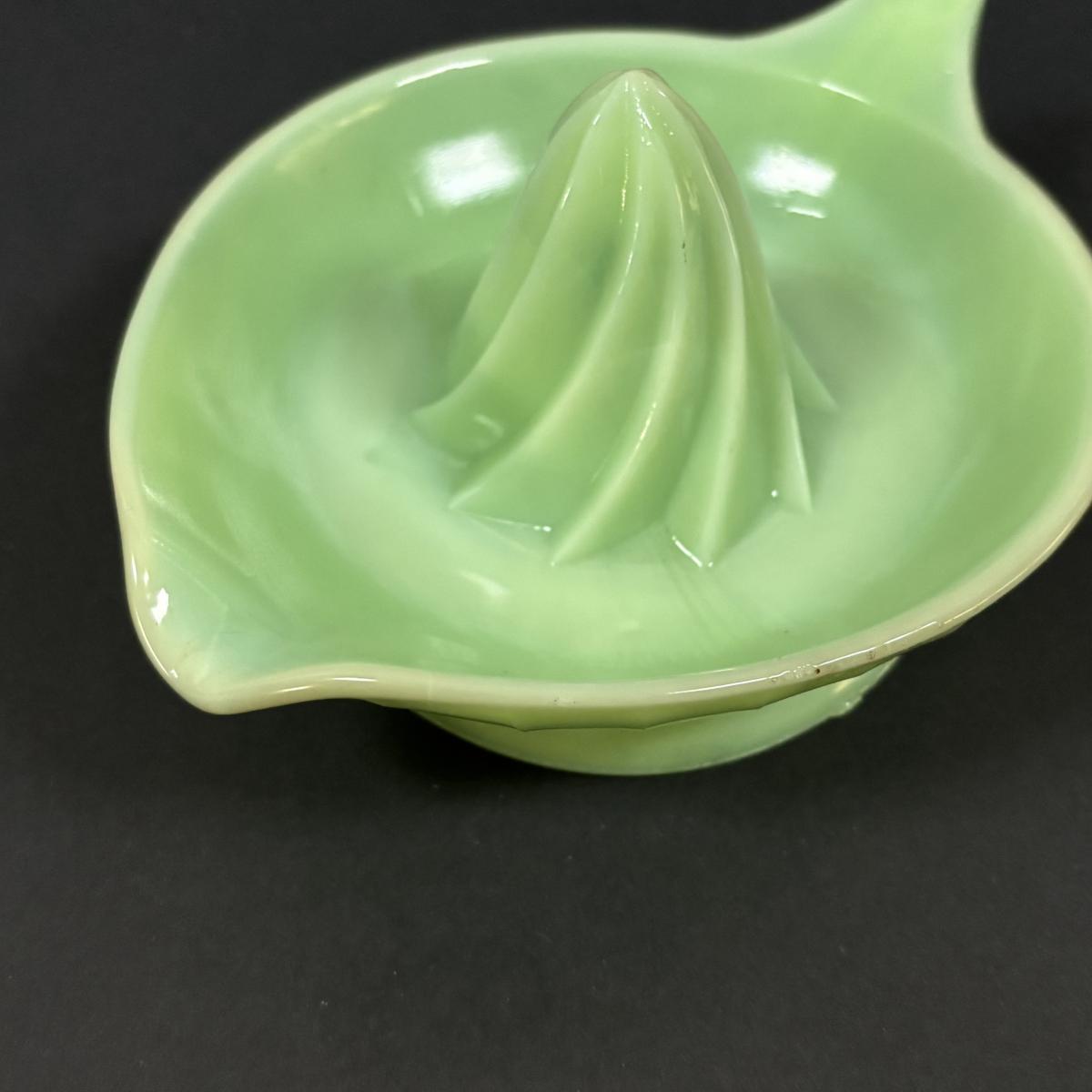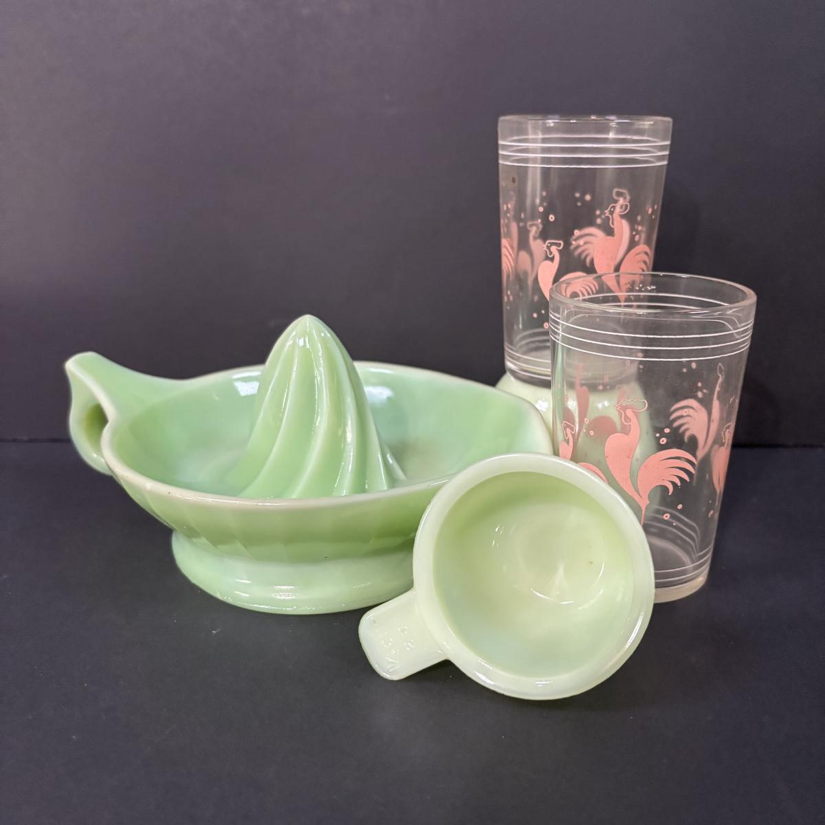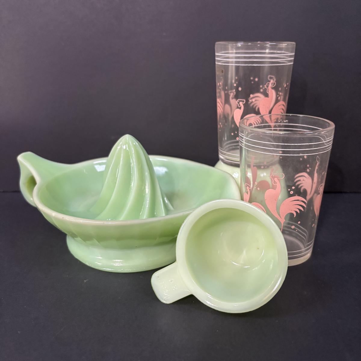 LOT 124: Jadeite/Uranium Glass Citrus Reamer/Juicer, 2-Measuring Cups & 2-Kraft Swanky Swig Juice Glasses