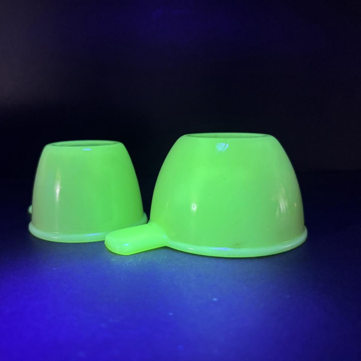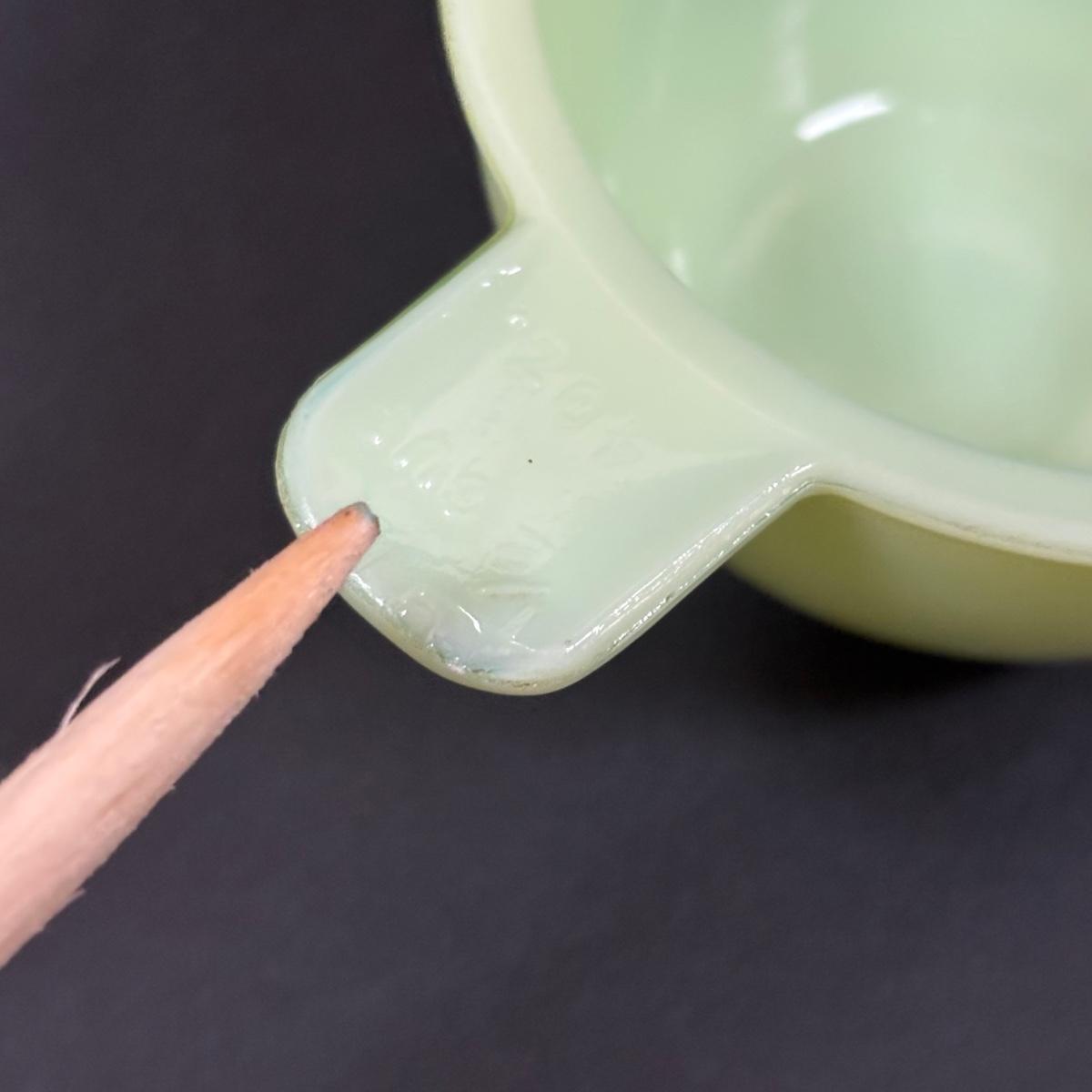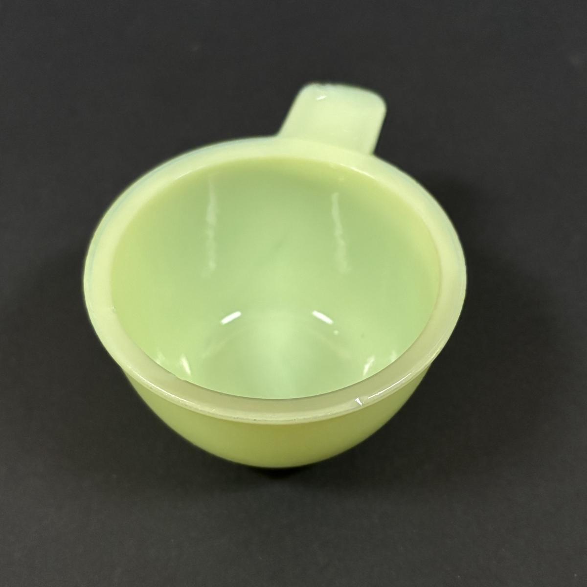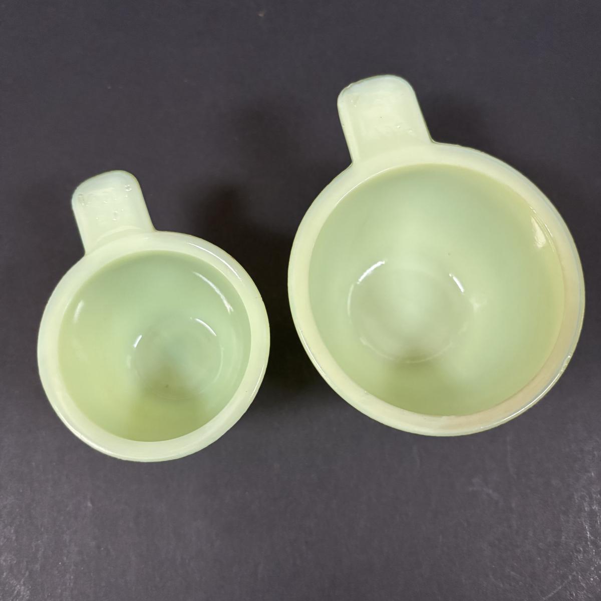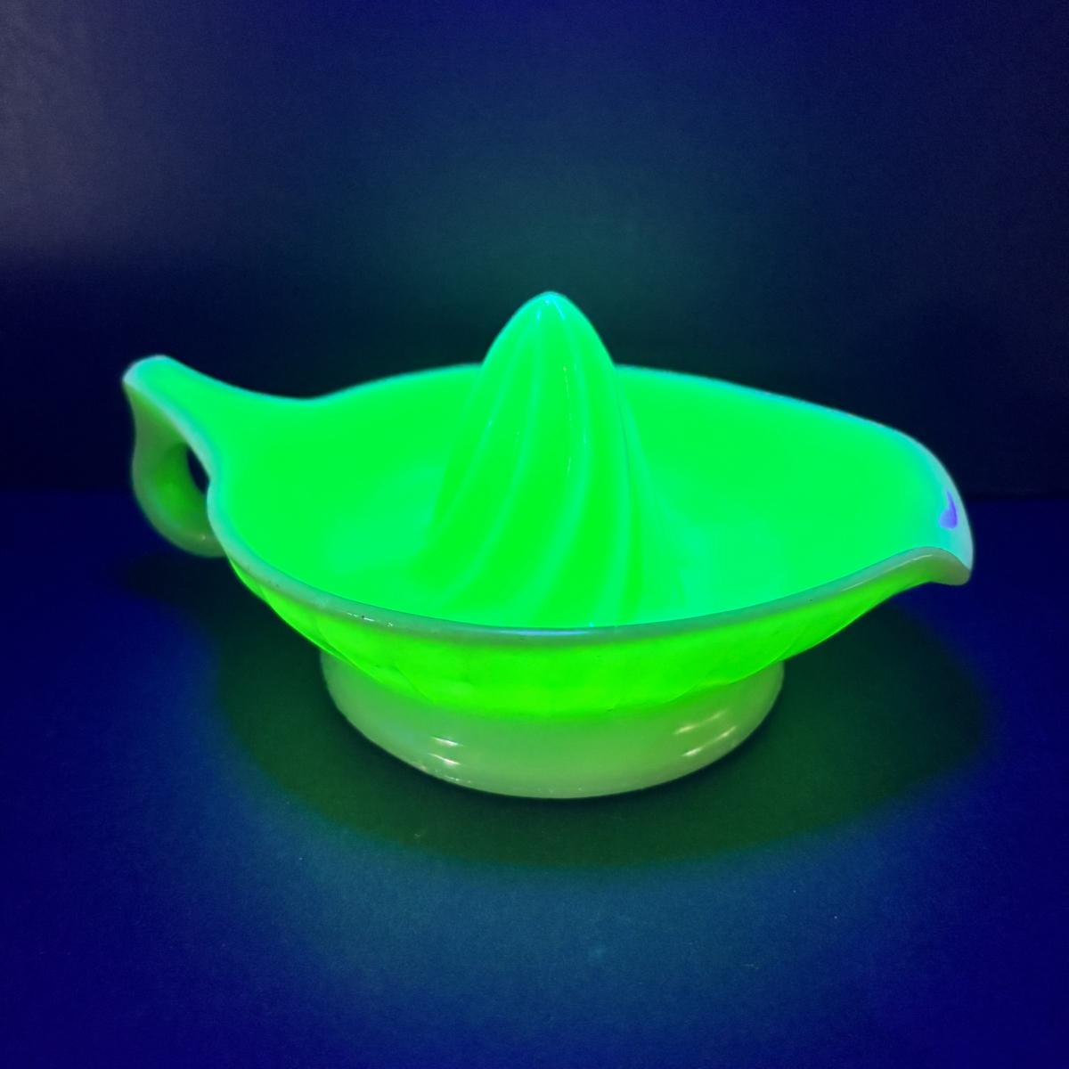 LOT 124: Jadeite/Uranium Glass Citrus Reamer/Juicer, 2-Measuring Cups & 2-Kraft Swanky Swig Juice Glasses