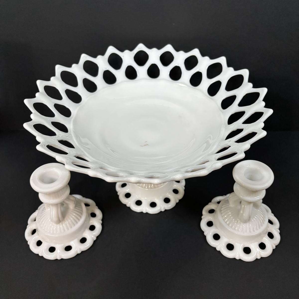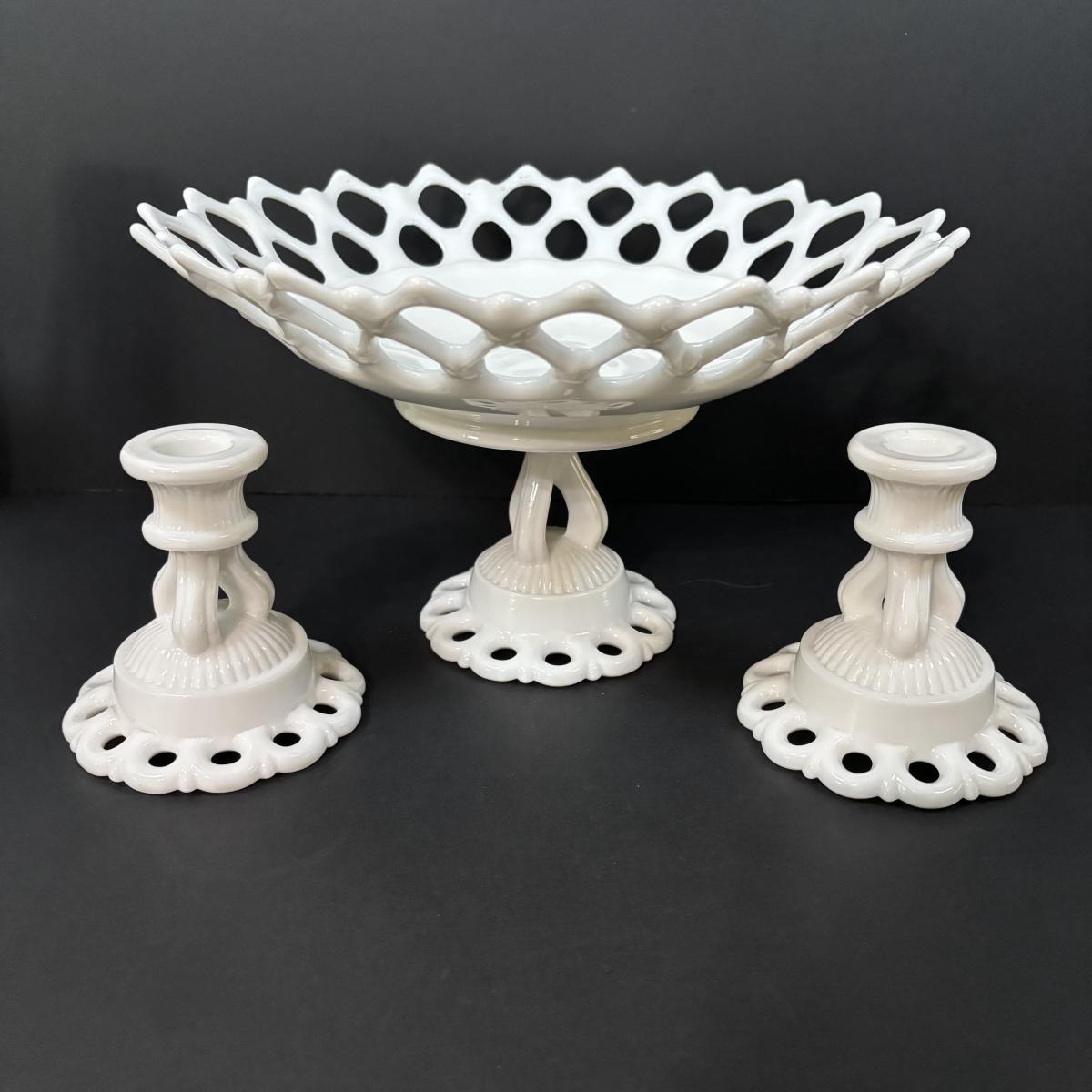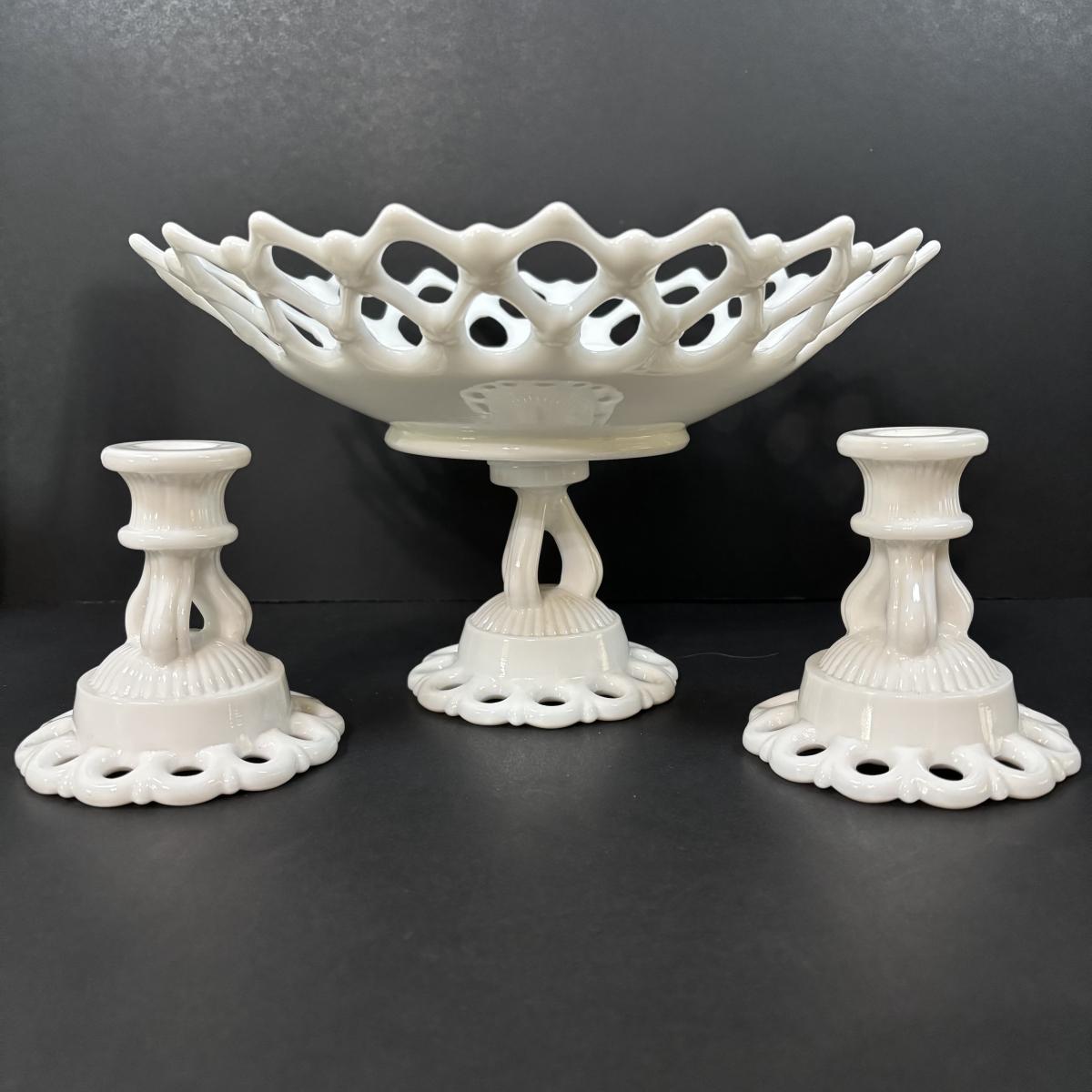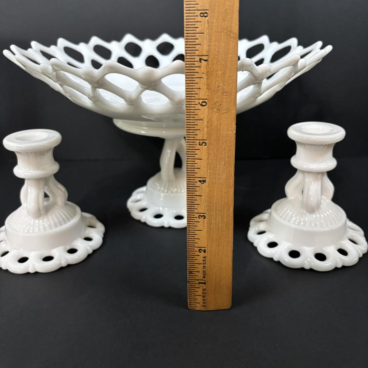 LOT 125: Westmorland Milk Glass Lace Pedestal Fruit Bowl w/Matching Candle Sticks
