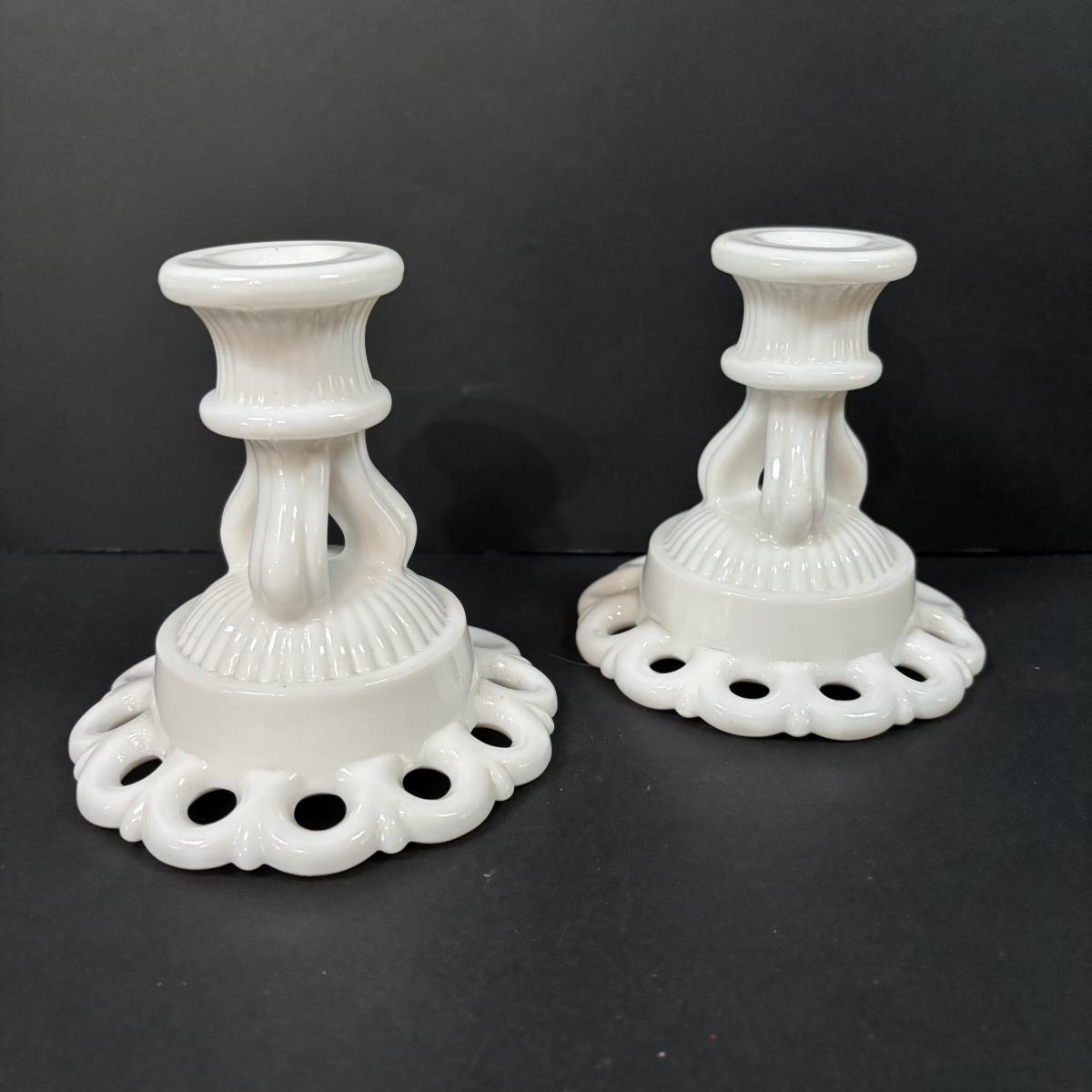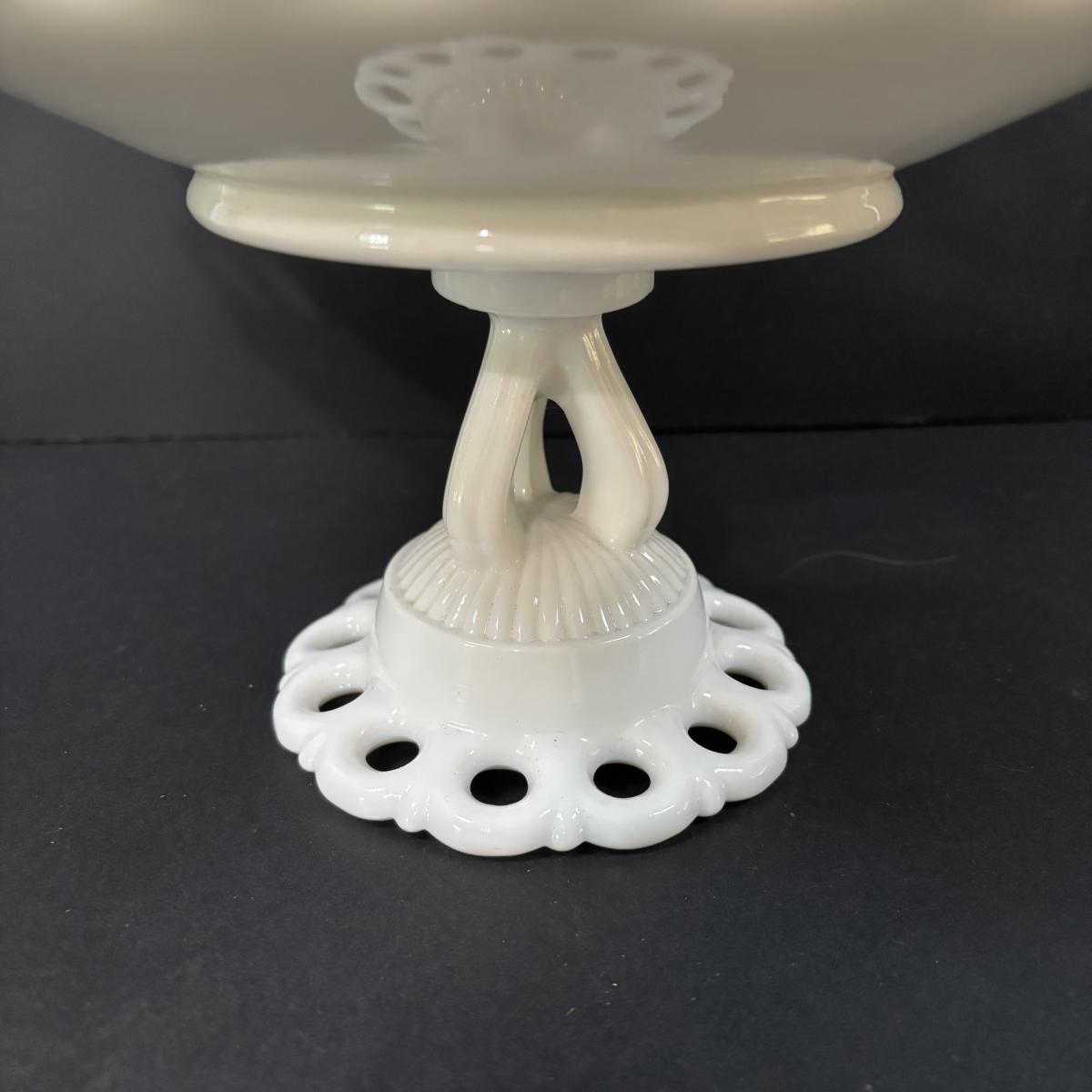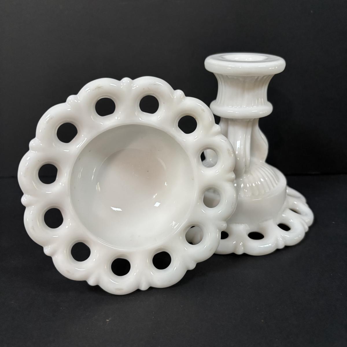 LOT 125: Westmorland Milk Glass Lace Pedestal Fruit Bowl w/Matching Candle Sticks