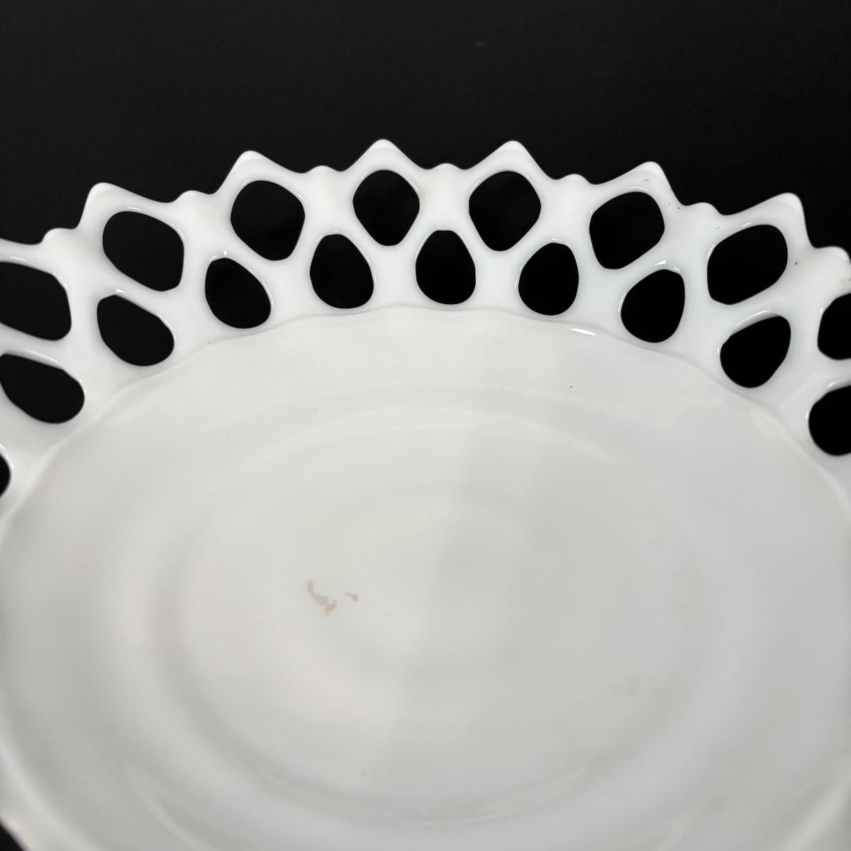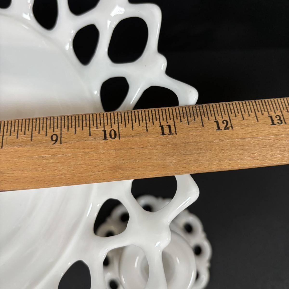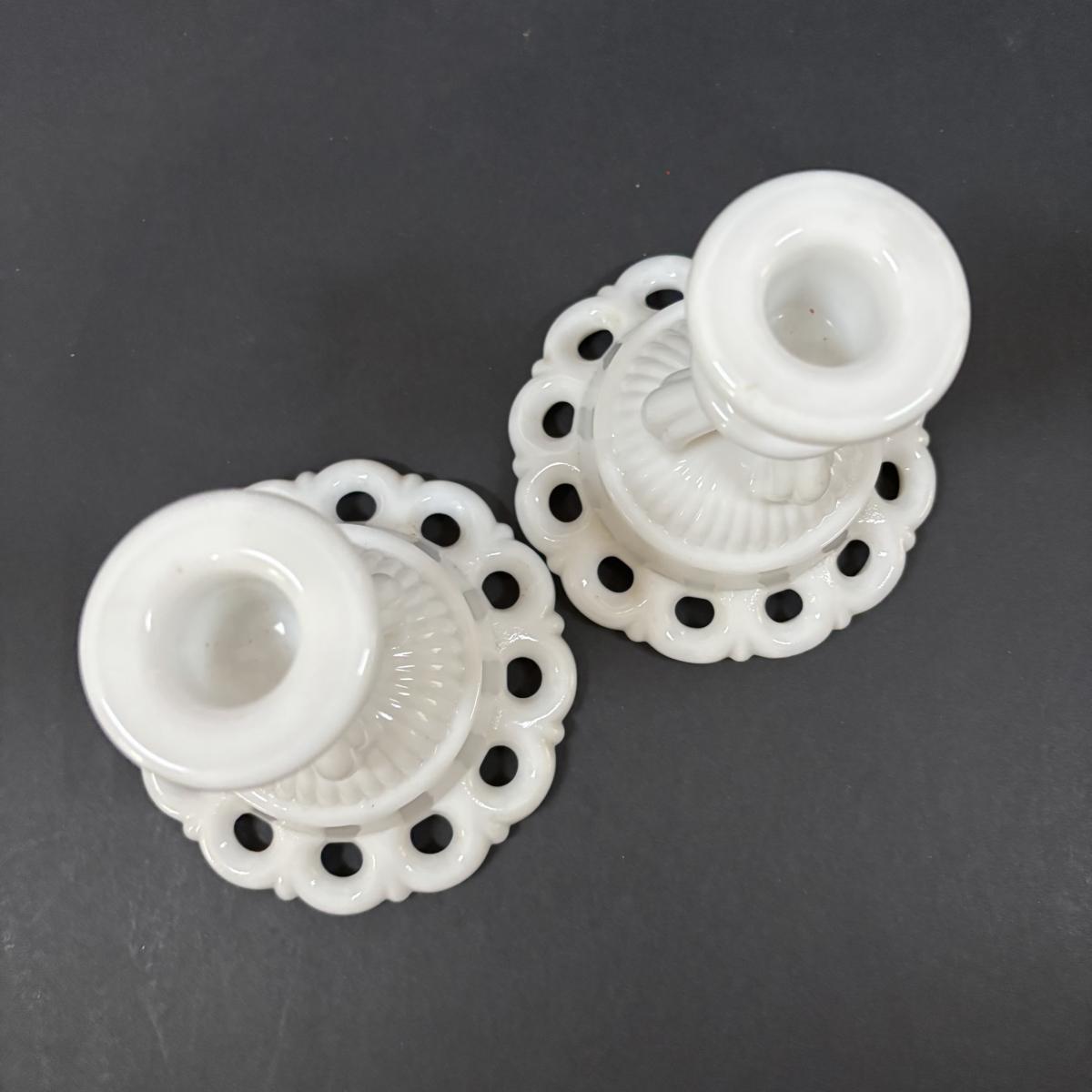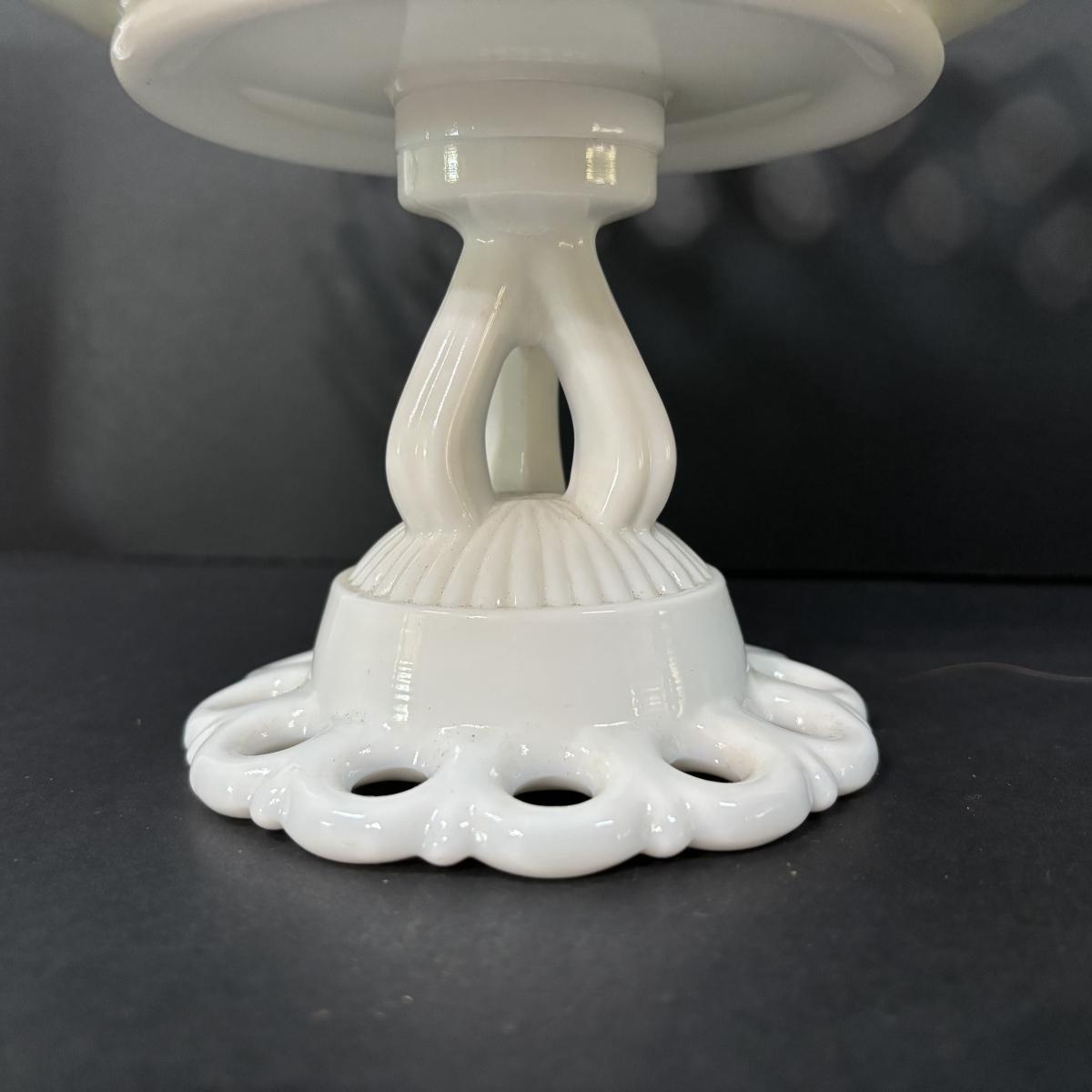 LOT 125: Westmorland Milk Glass Lace Pedestal Fruit Bowl w/Matching Candle Sticks