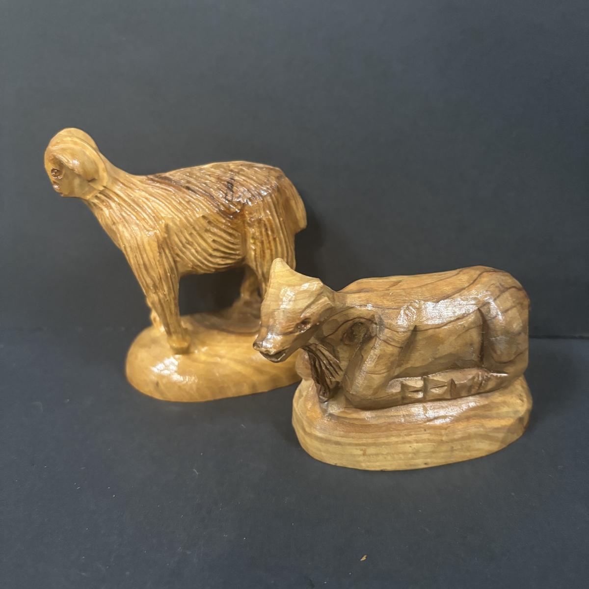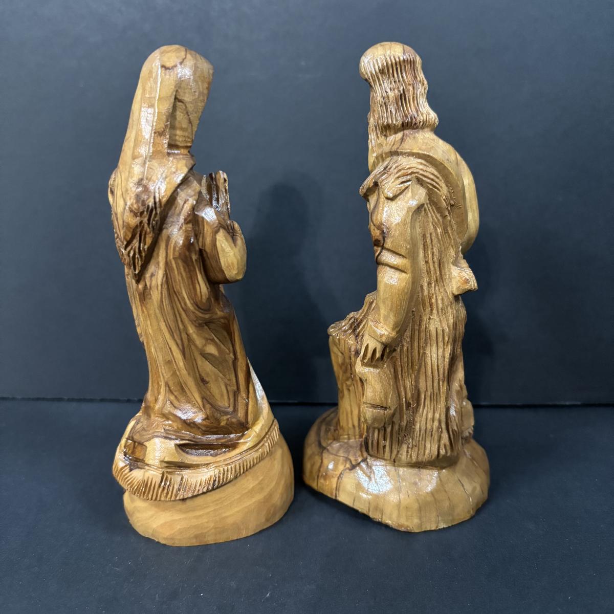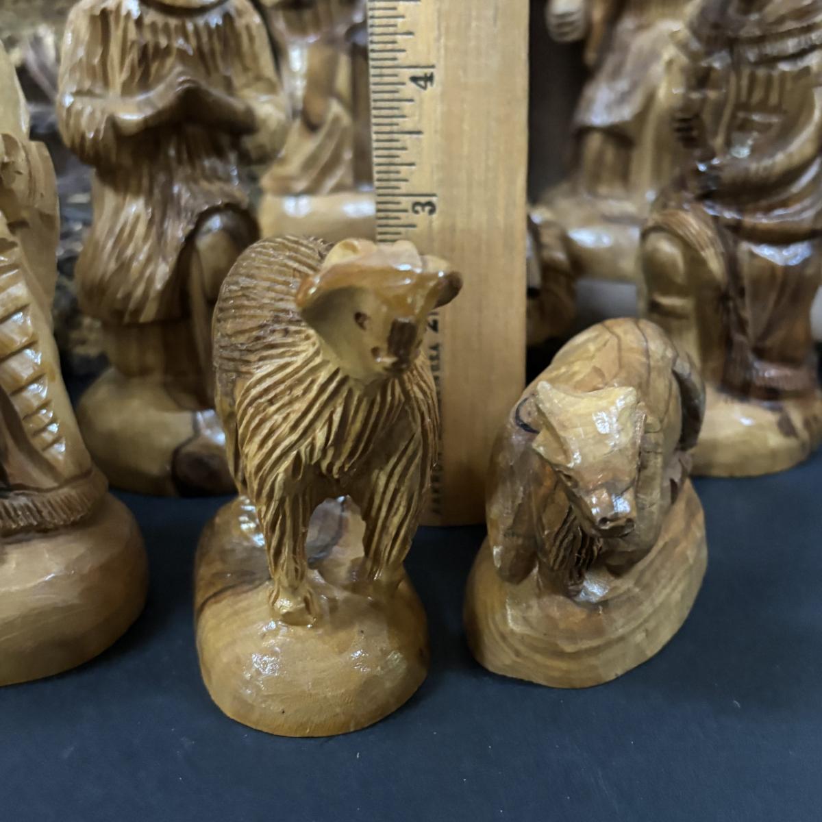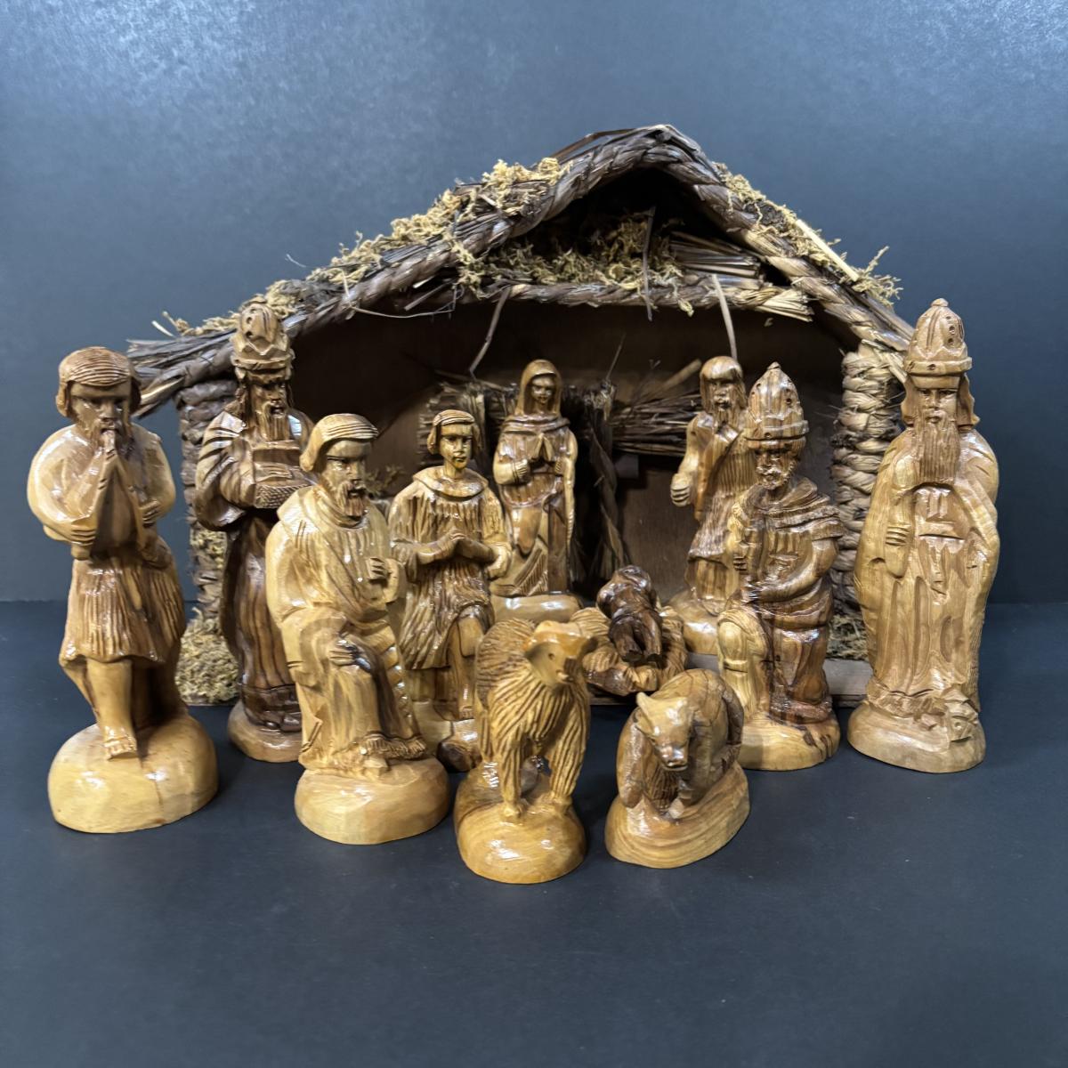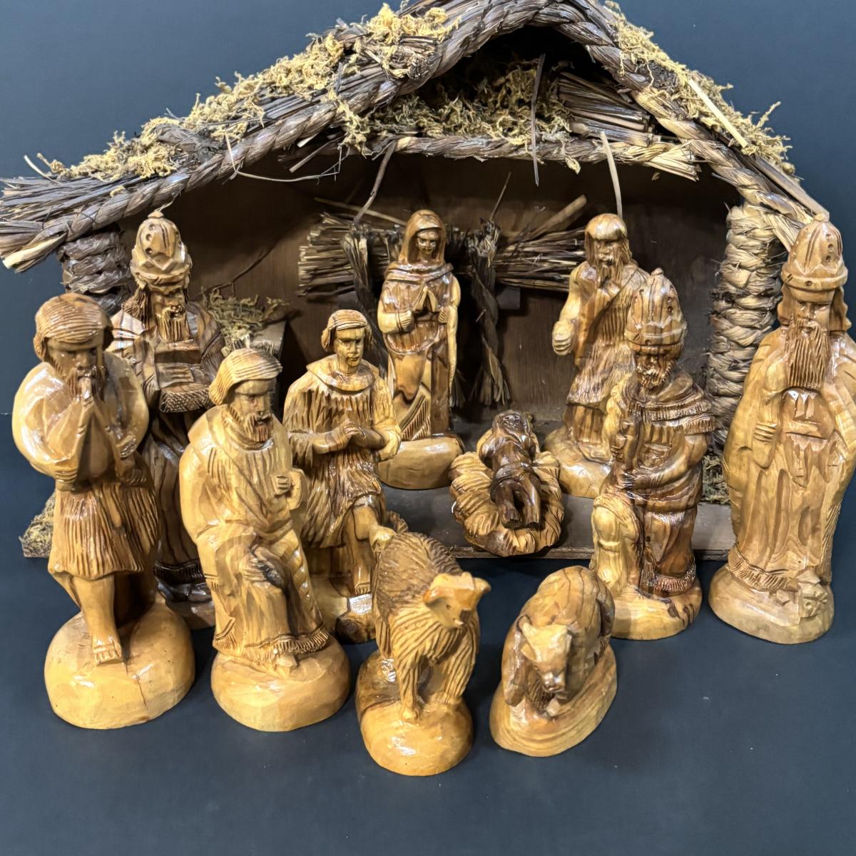 LOT 128: Beautiful 12pc Jerusalem Hand Carved Olive Wood Nativity along with the Creche