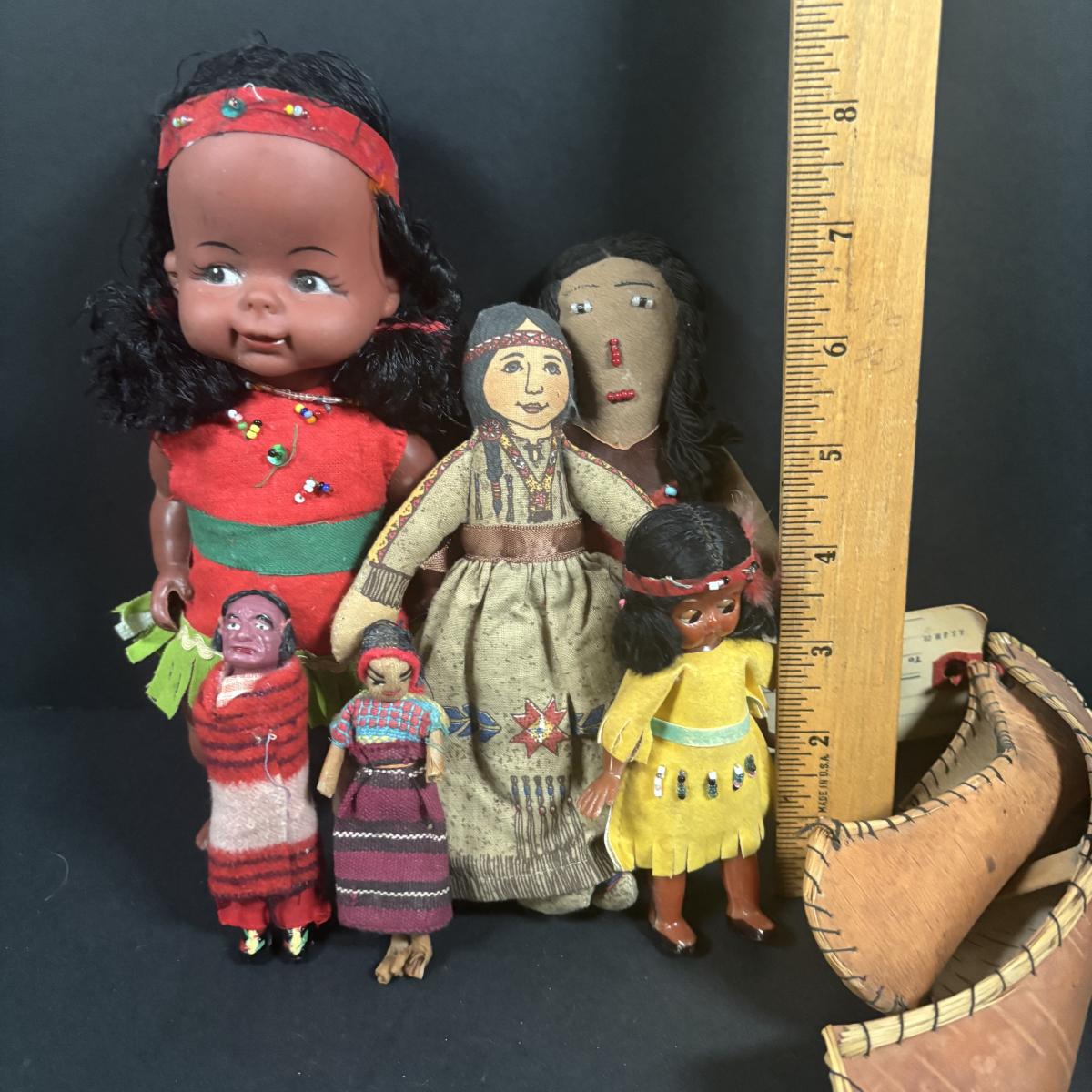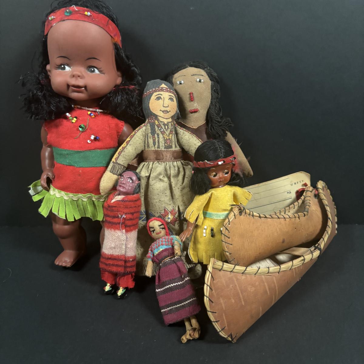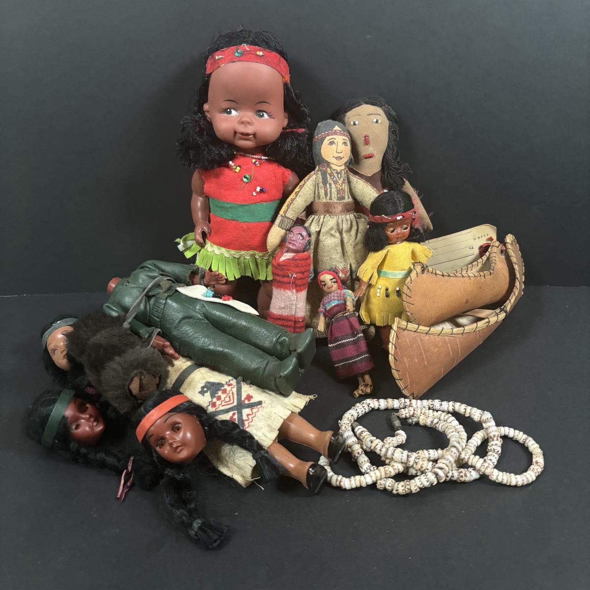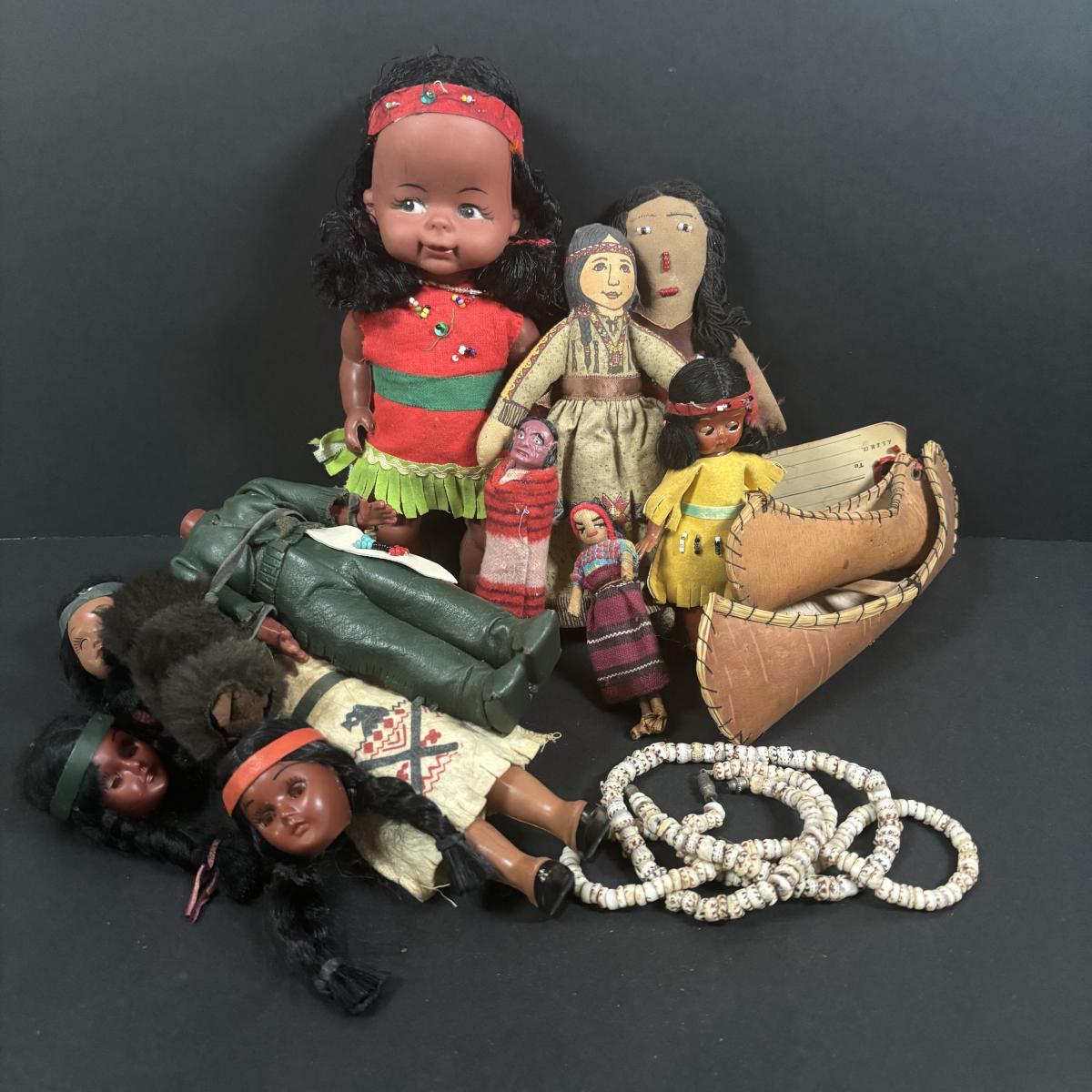 LOT 135: Vintage Native American Indian Dolls, Dolls for Repair, Skookum Doll, Handcrafted Replica Birch Canoes & Beaded Necklaces