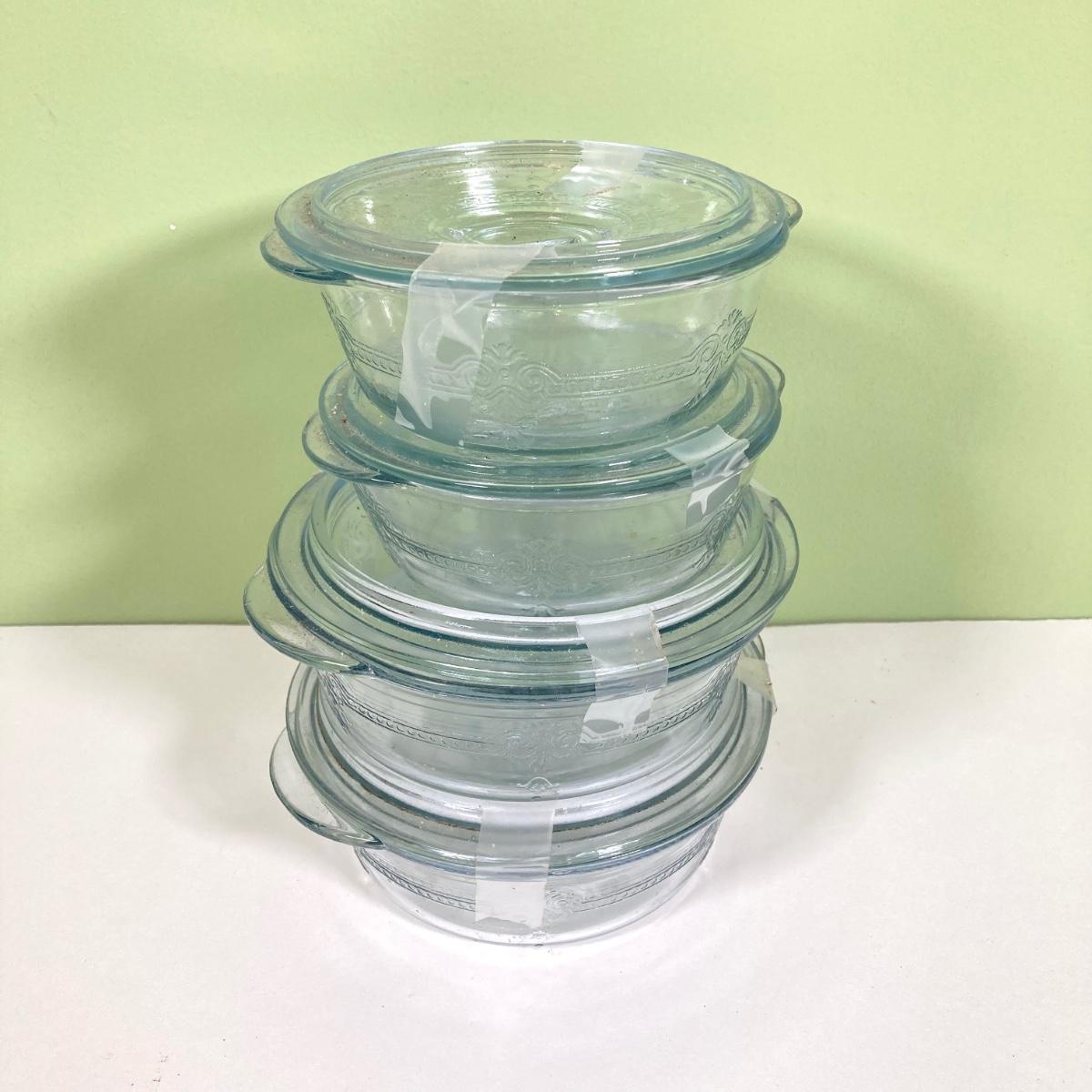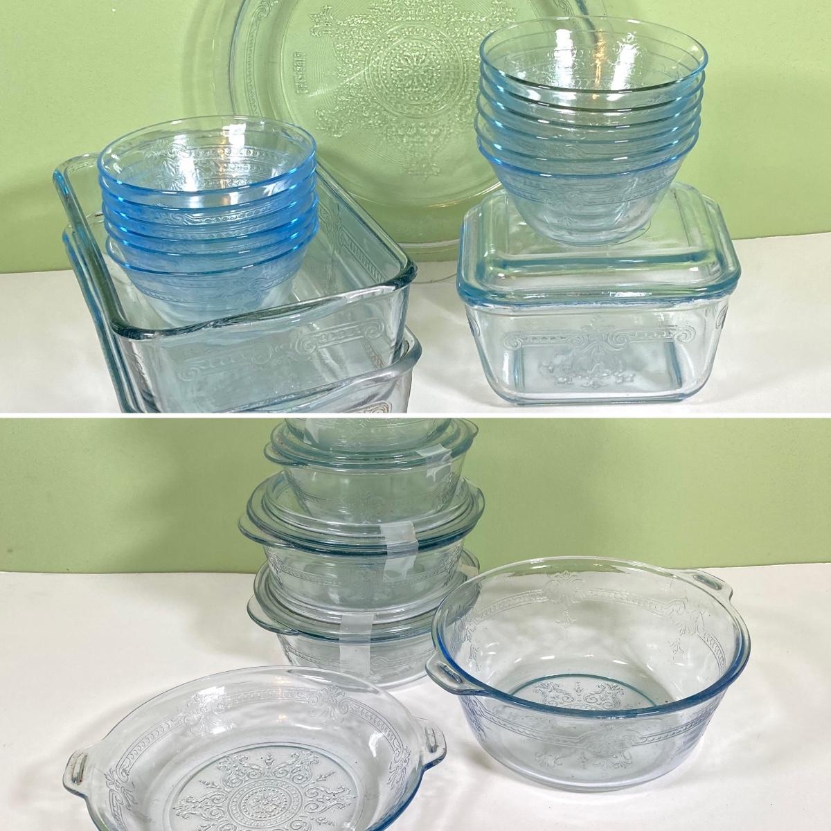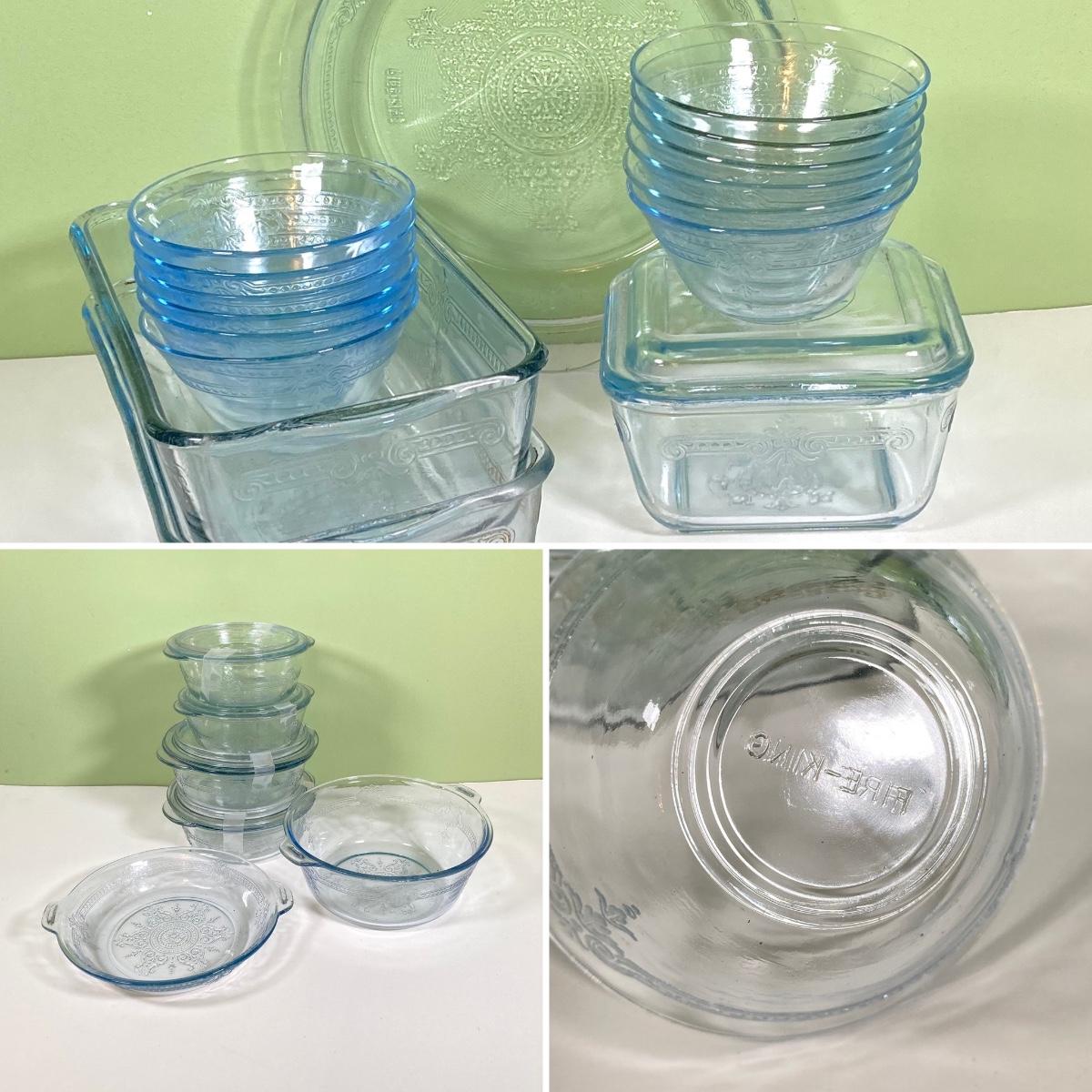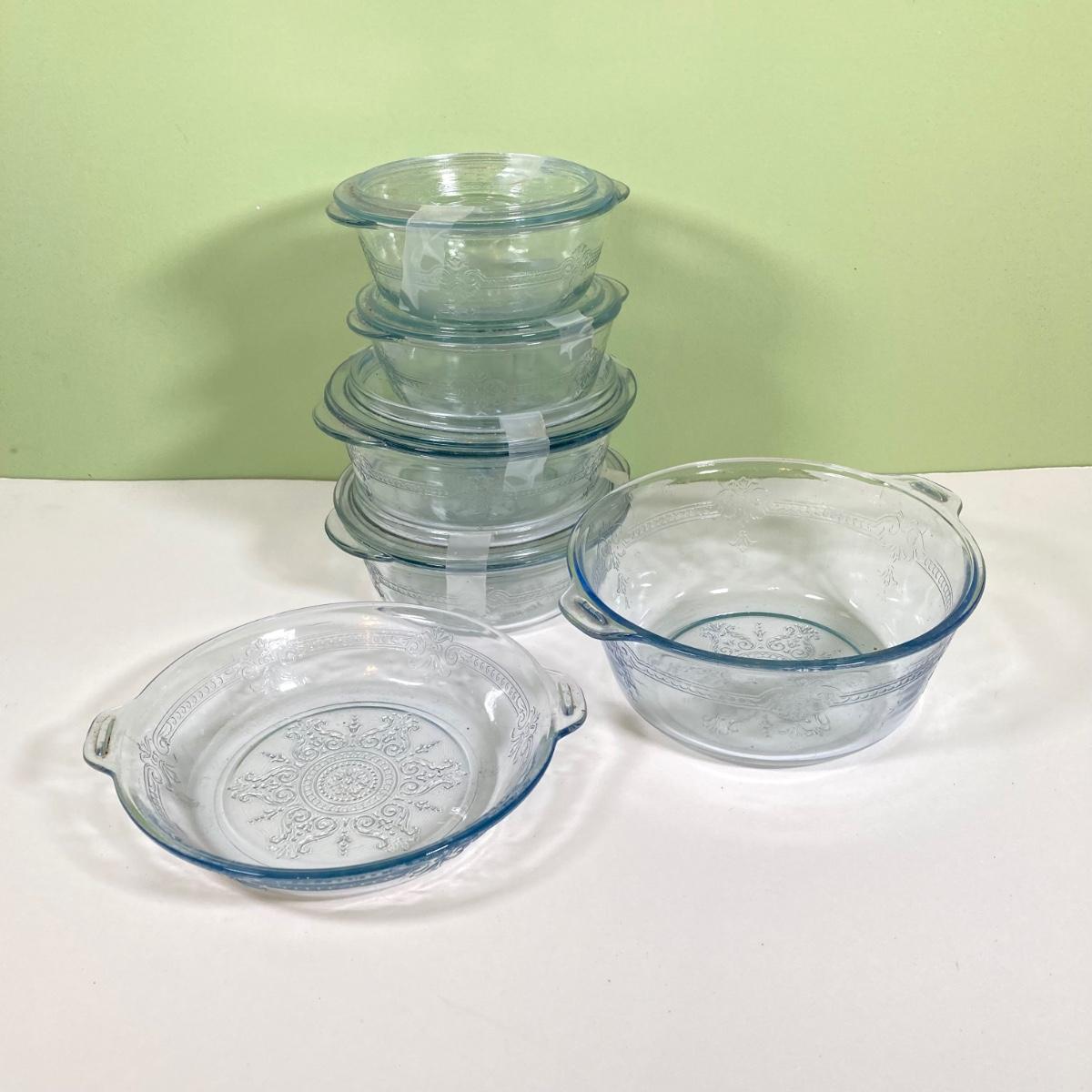 LOT 180: Fire King Oven Glass Collection - 2 Rectangular Casserole Dishes, Small Lidded Rectangular Refrigerator Dish, Plate, Bowl, Custard Cups, Lidded Casserole Dishes and 2 Lids