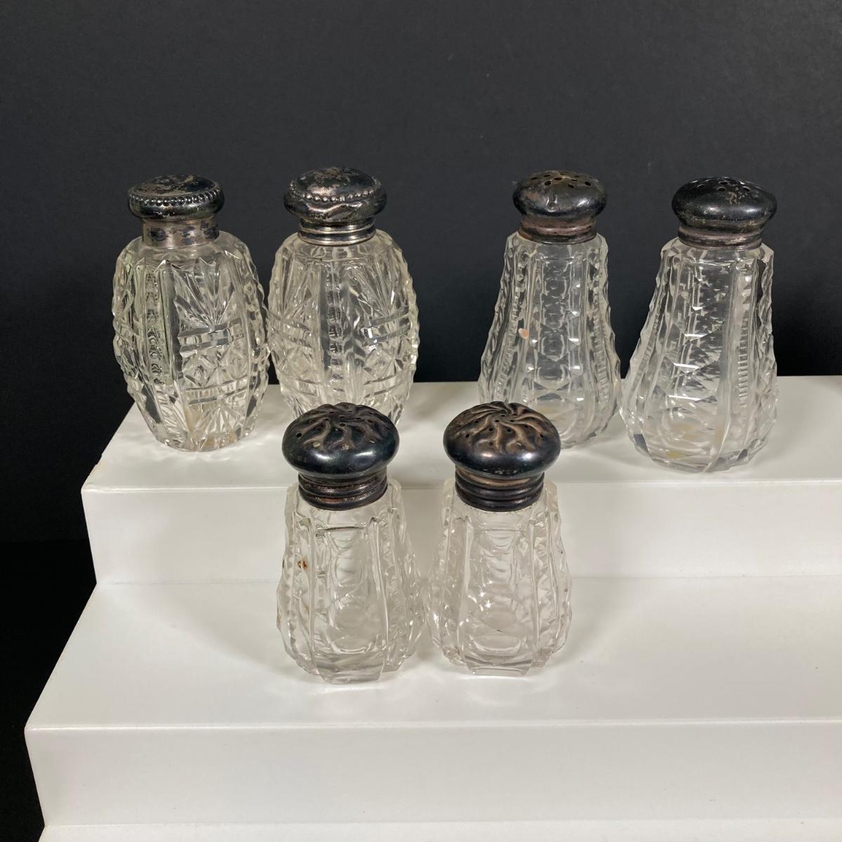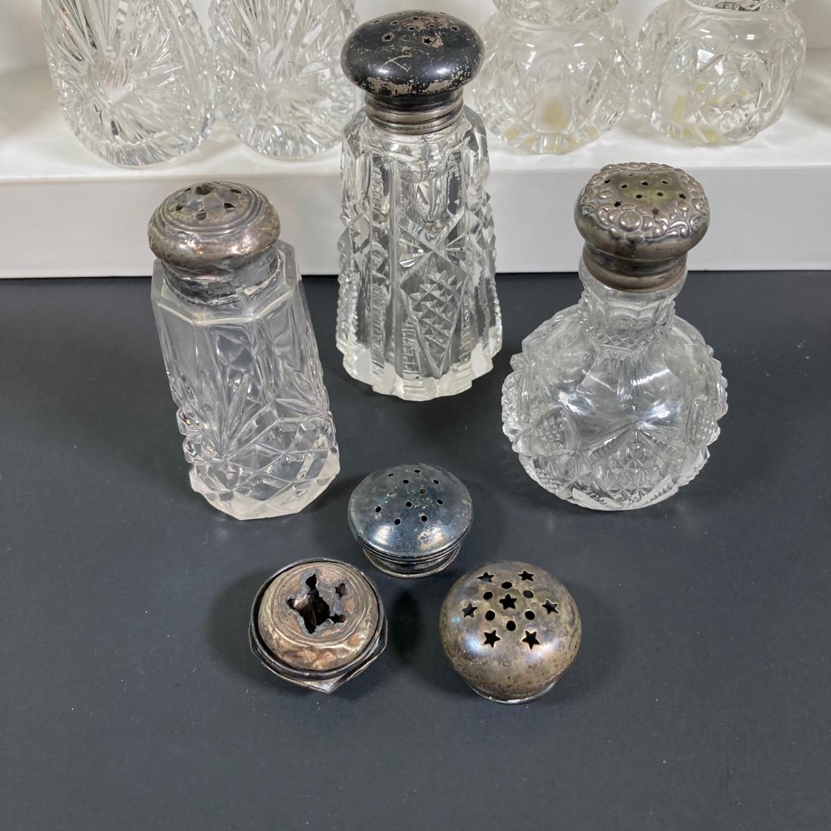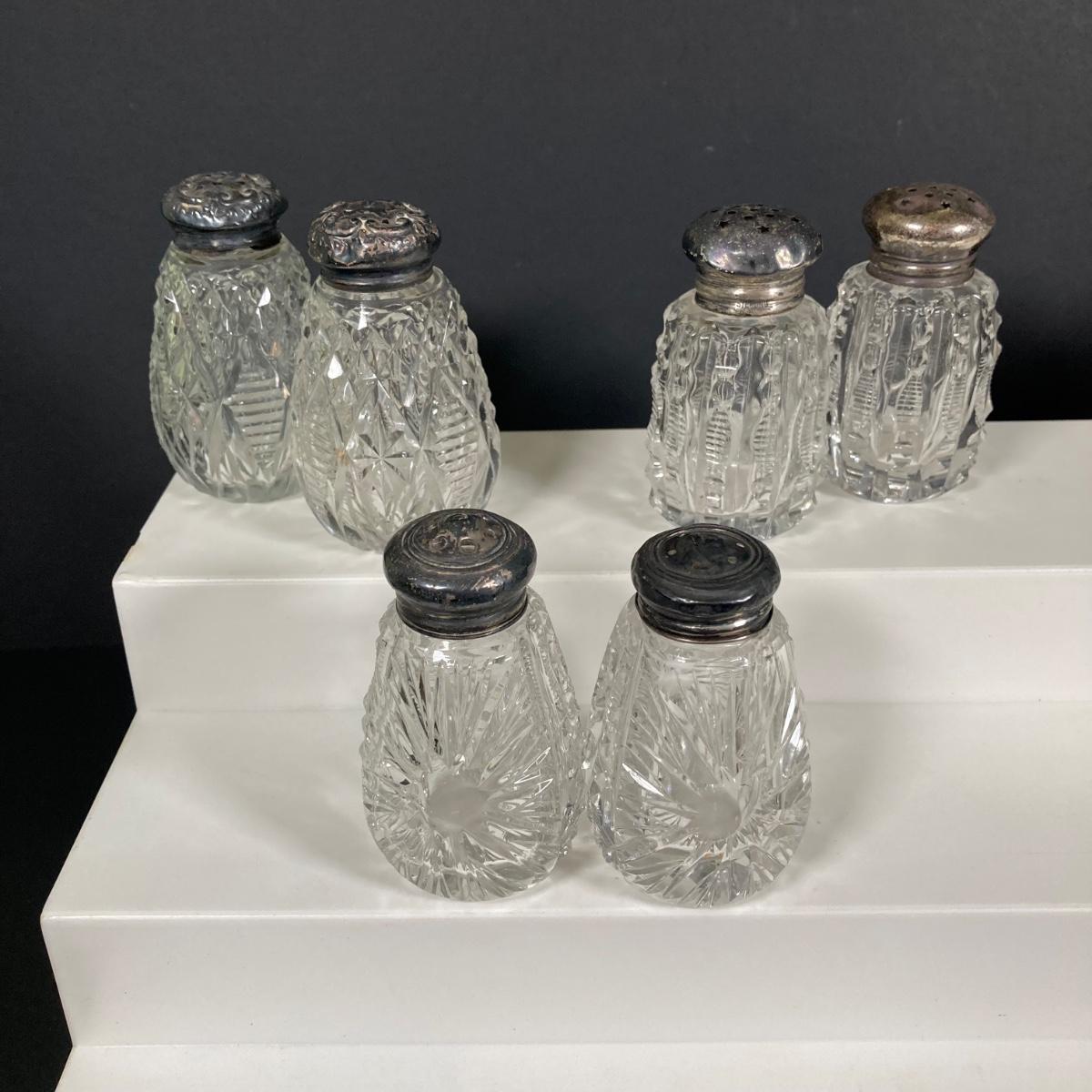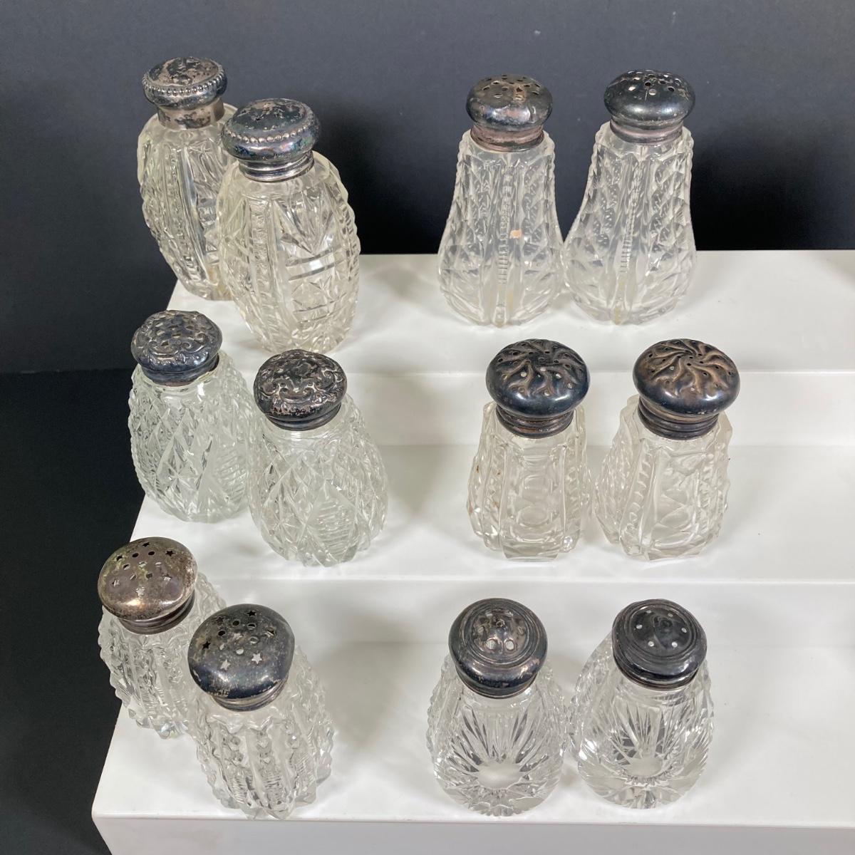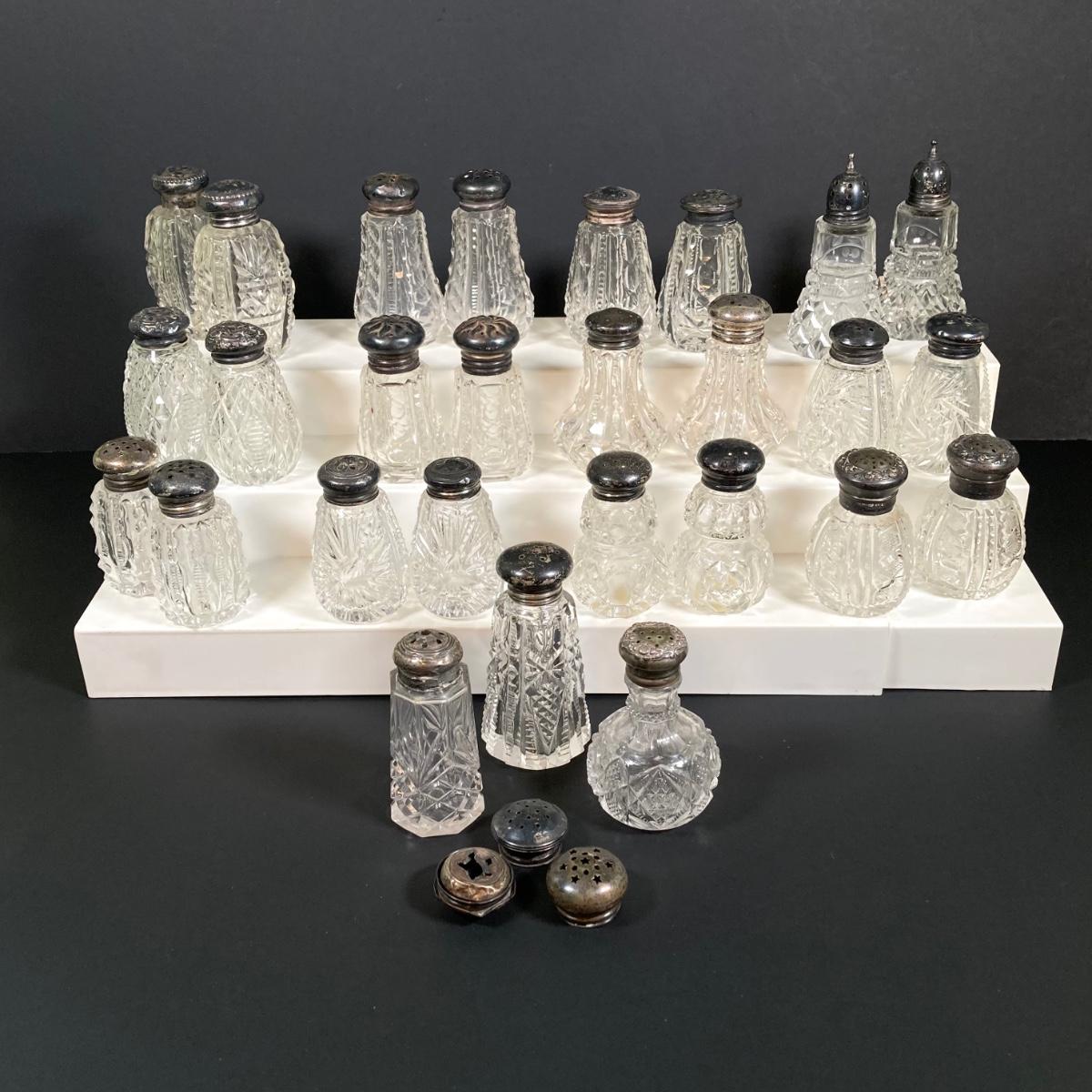 LOT 183: Large Collection of Glass Salt and Pepper Shakers with Sterling Silver Tops