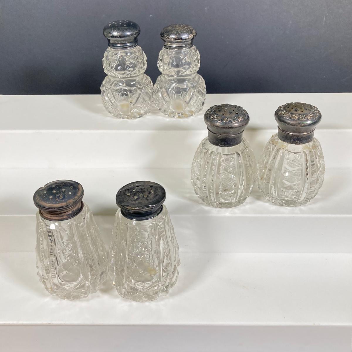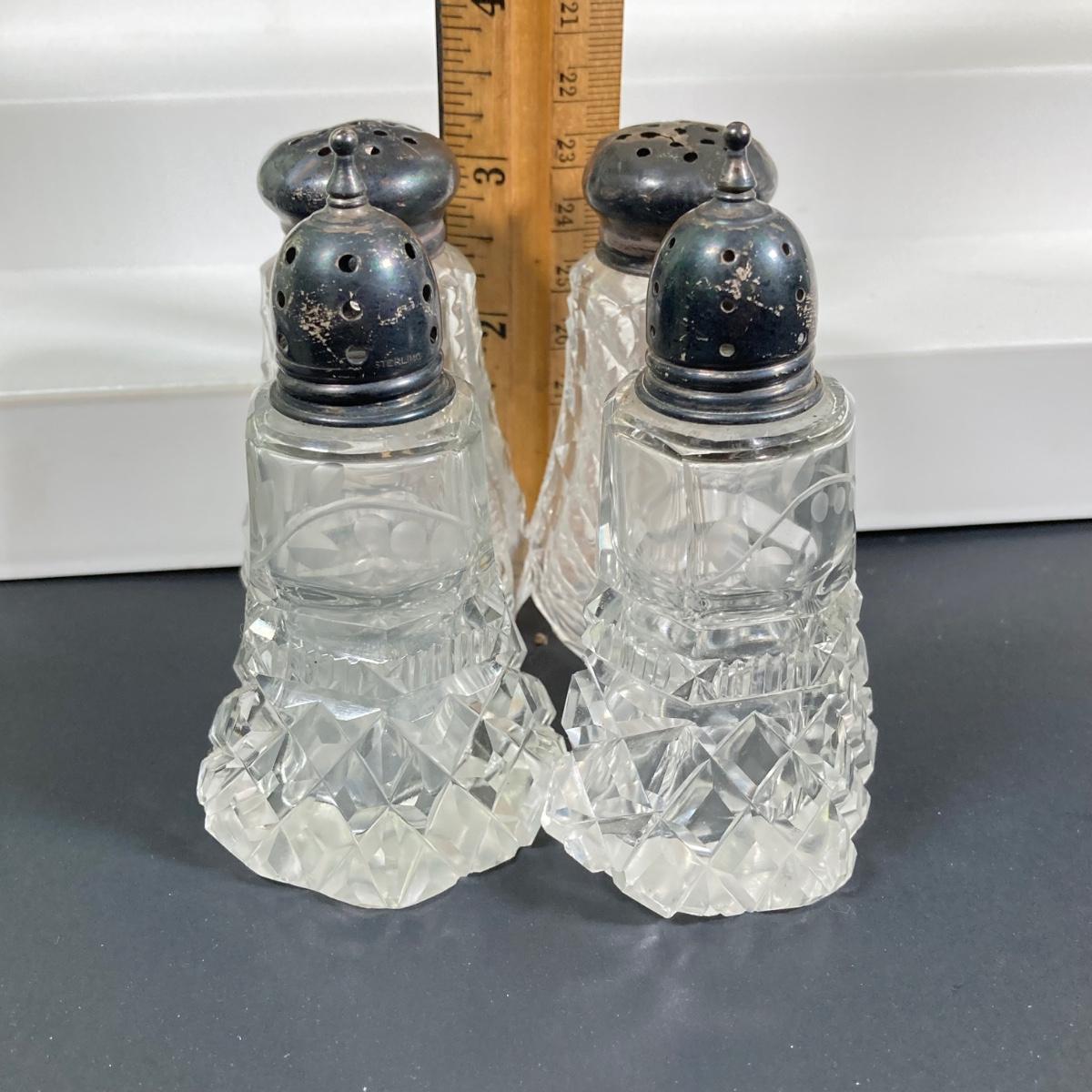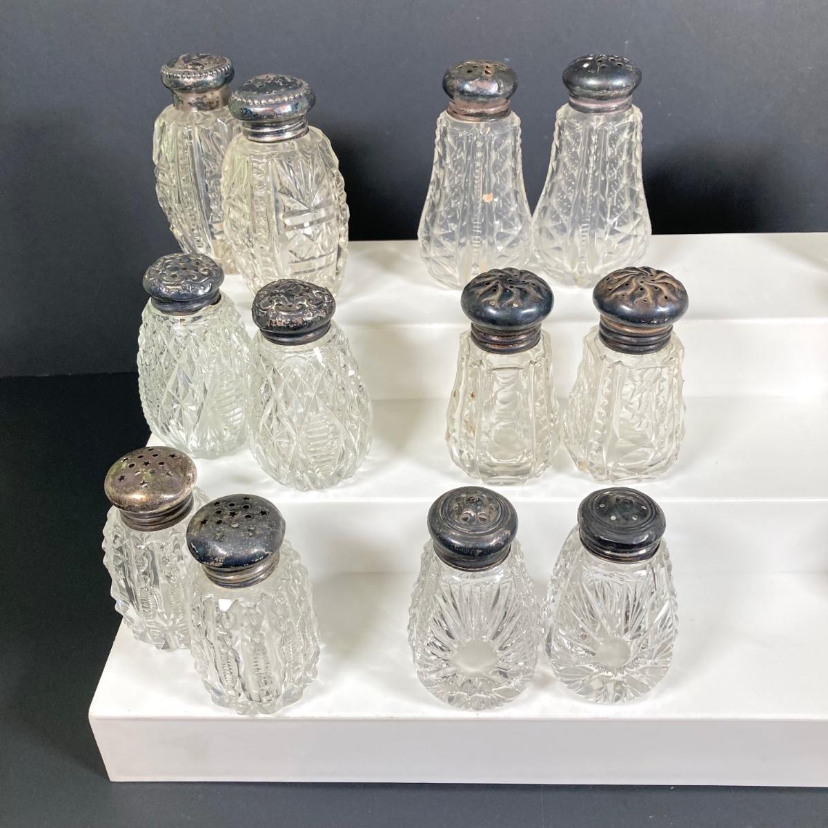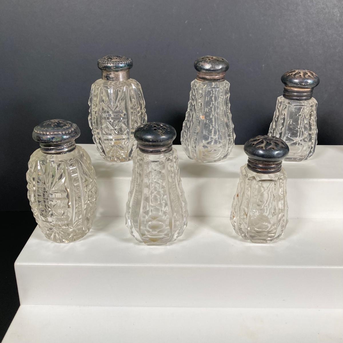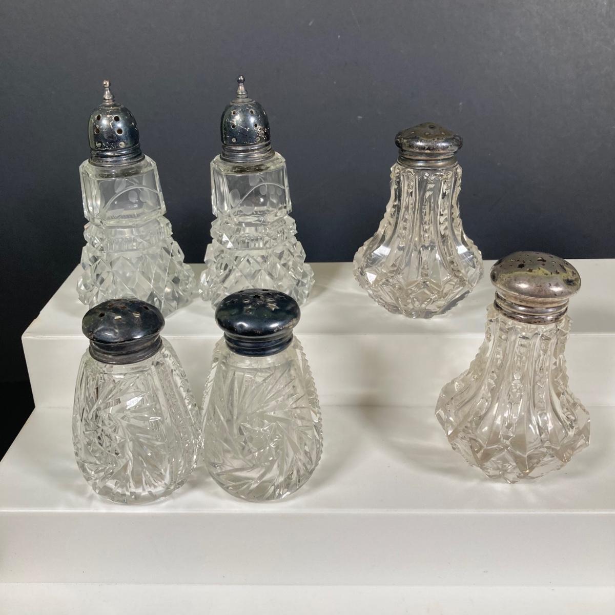 LOT 183: Large Collection of Glass Salt and Pepper Shakers with Sterling Silver Tops
