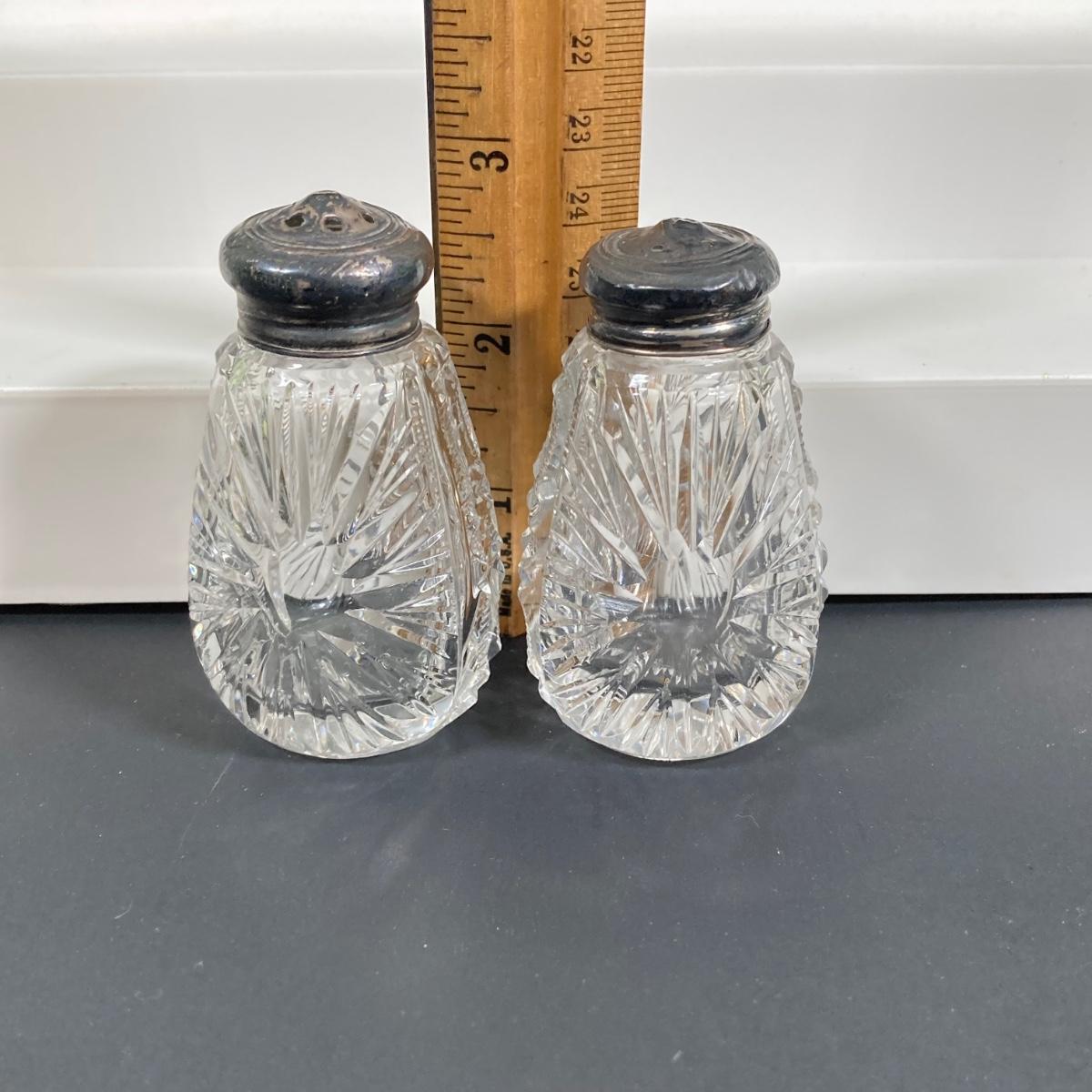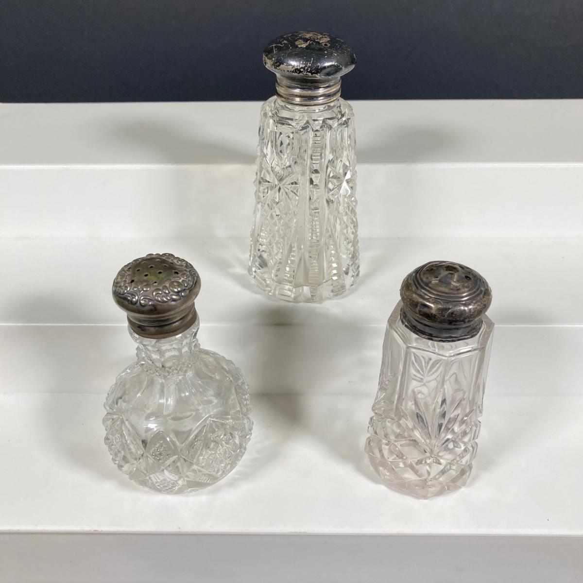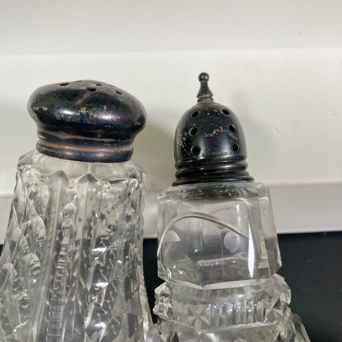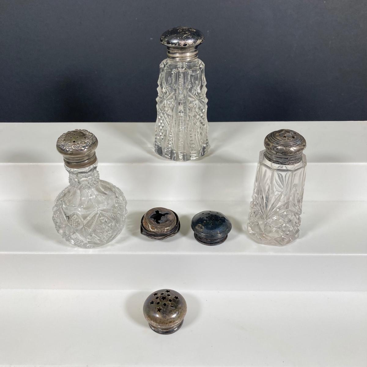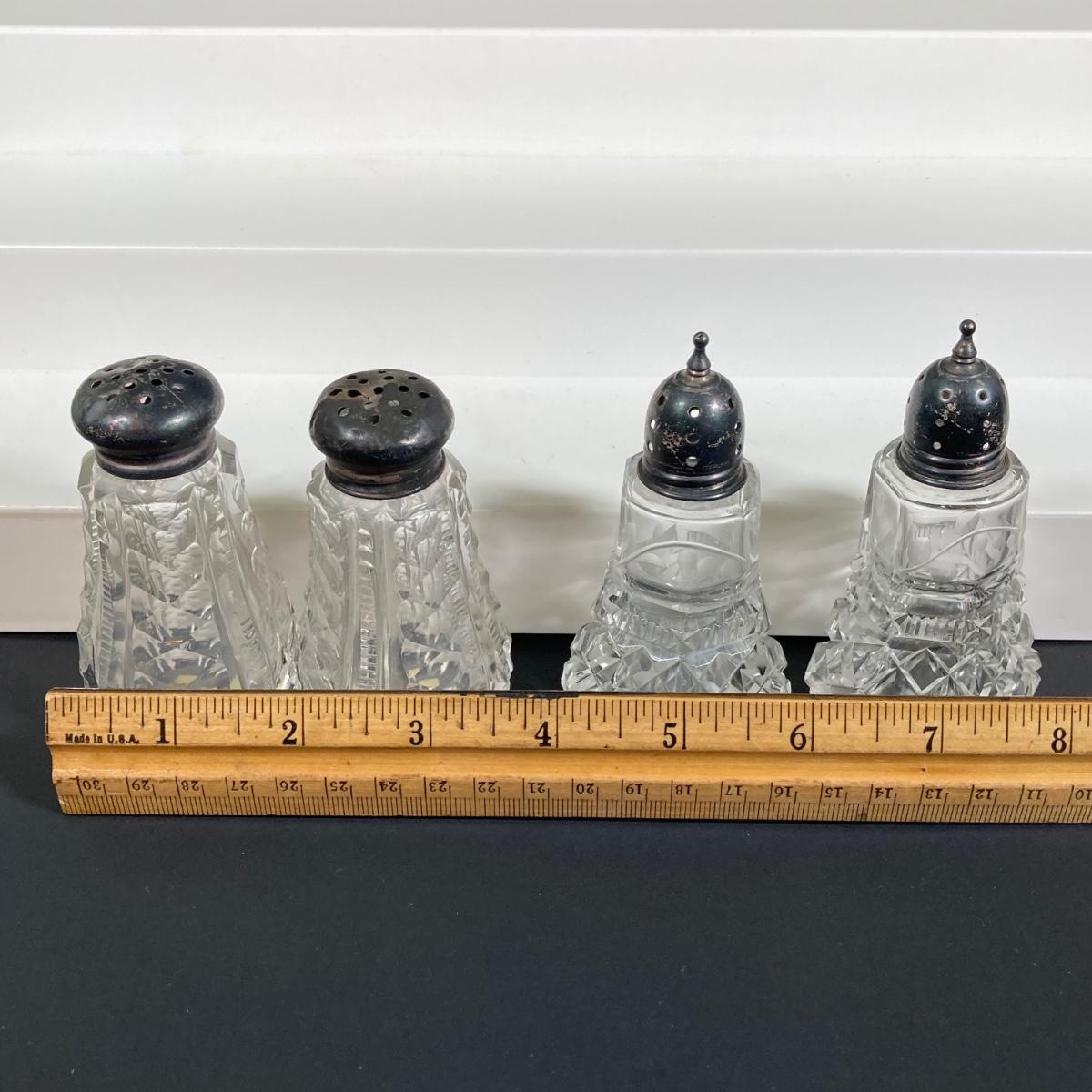 LOT 183: Large Collection of Glass Salt and Pepper Shakers with Sterling Silver Tops