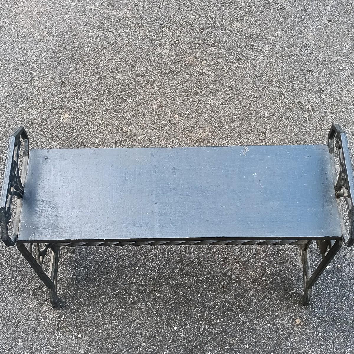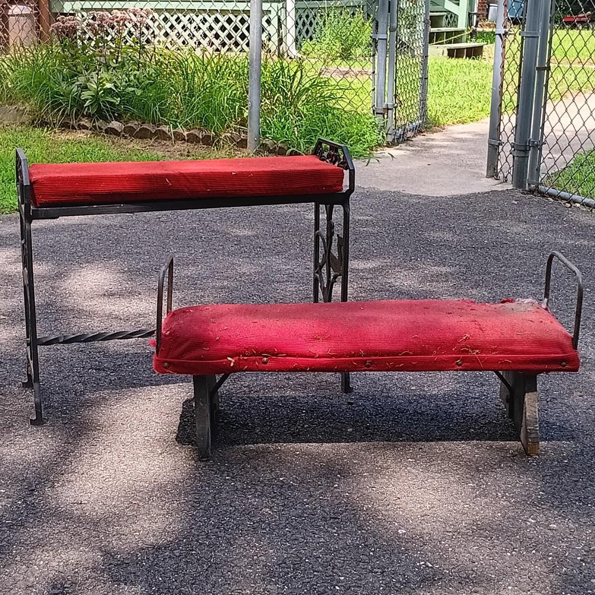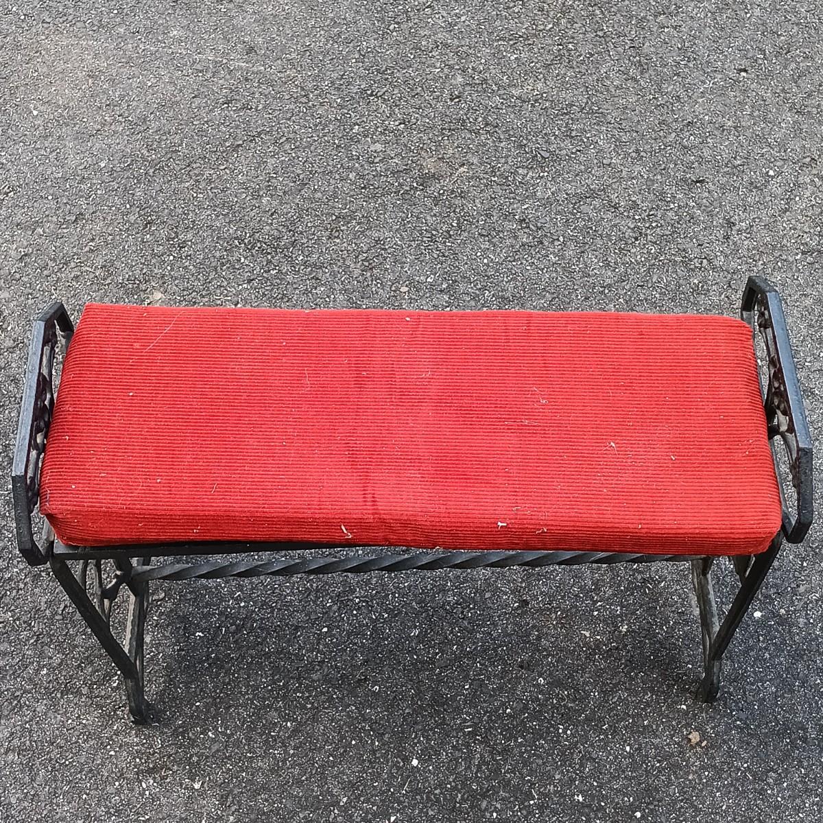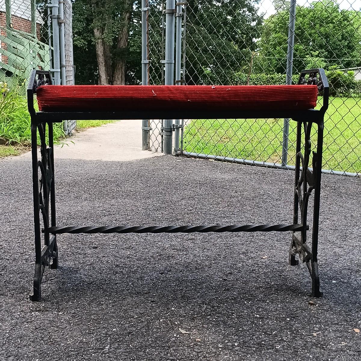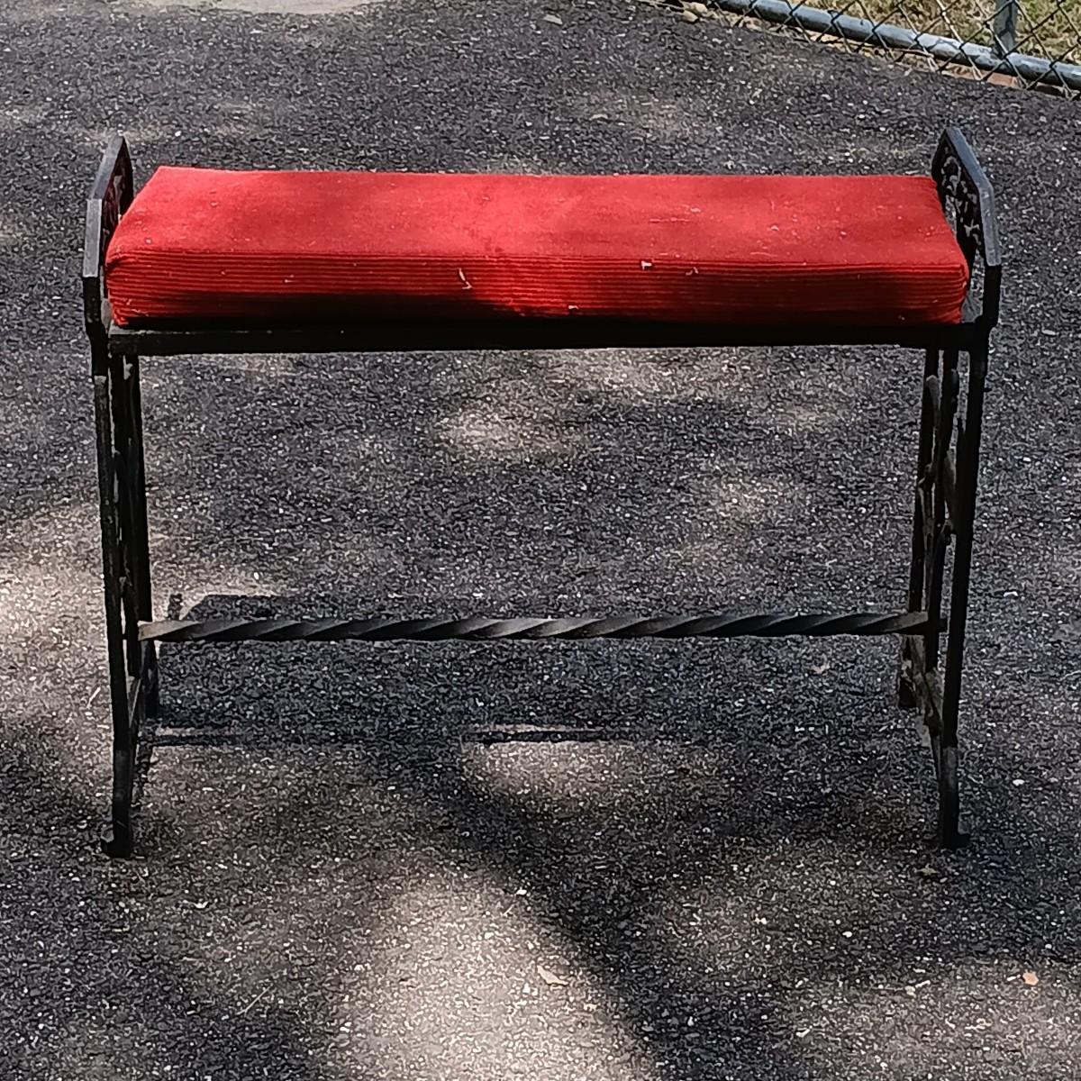 LOT 195: Antique Wrought Iron and Wood Bench with Metal and Wood Upholstered Stool