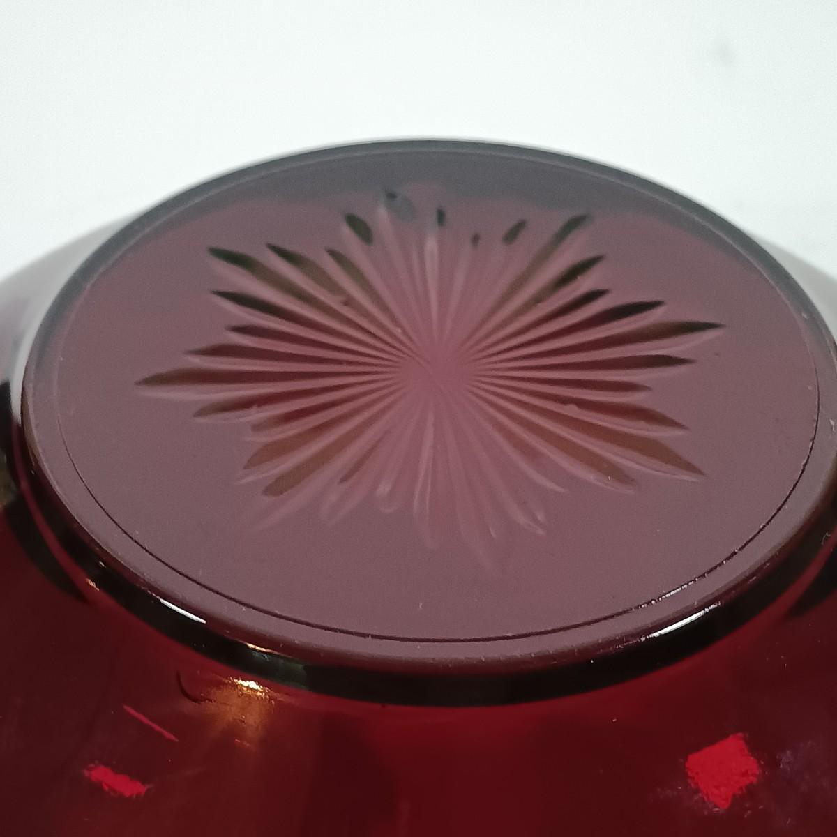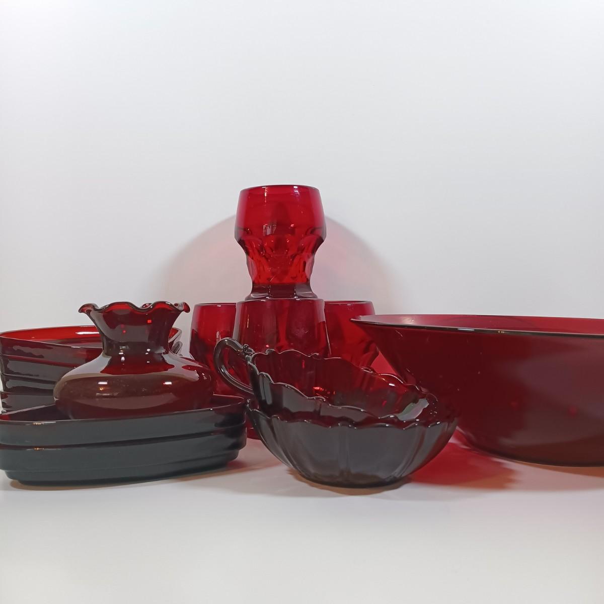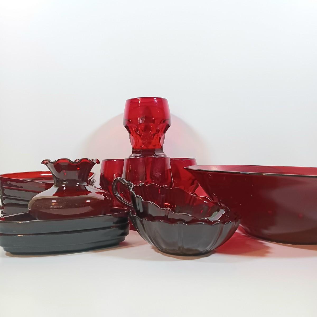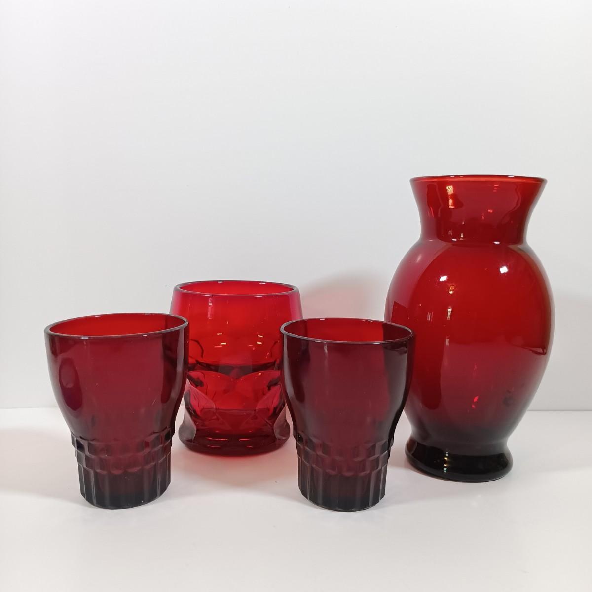 LOT 196: Ruby Red Glass Lazy Susan Inserts, Handled Serving Saucers, Bowl, Vases & Tumblers