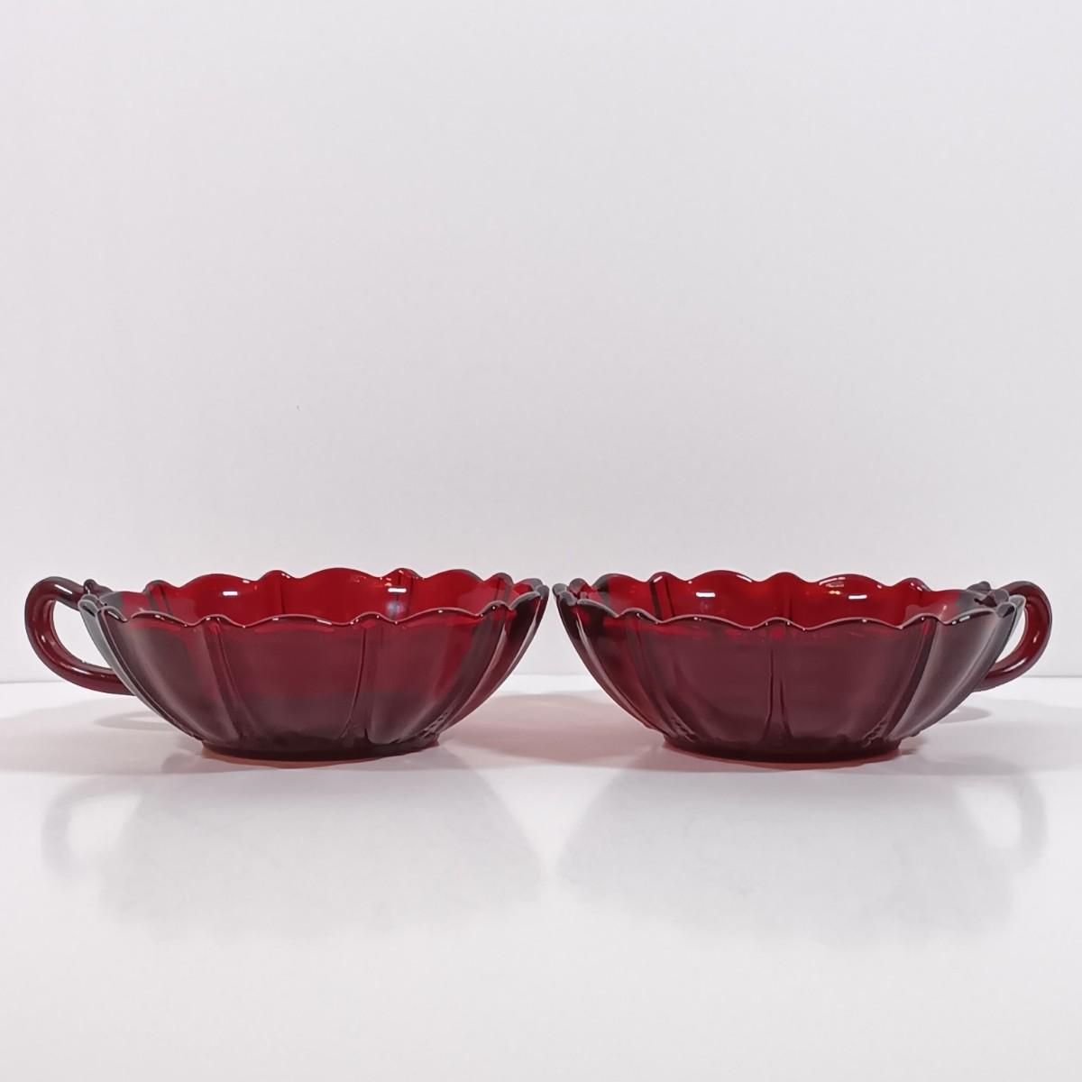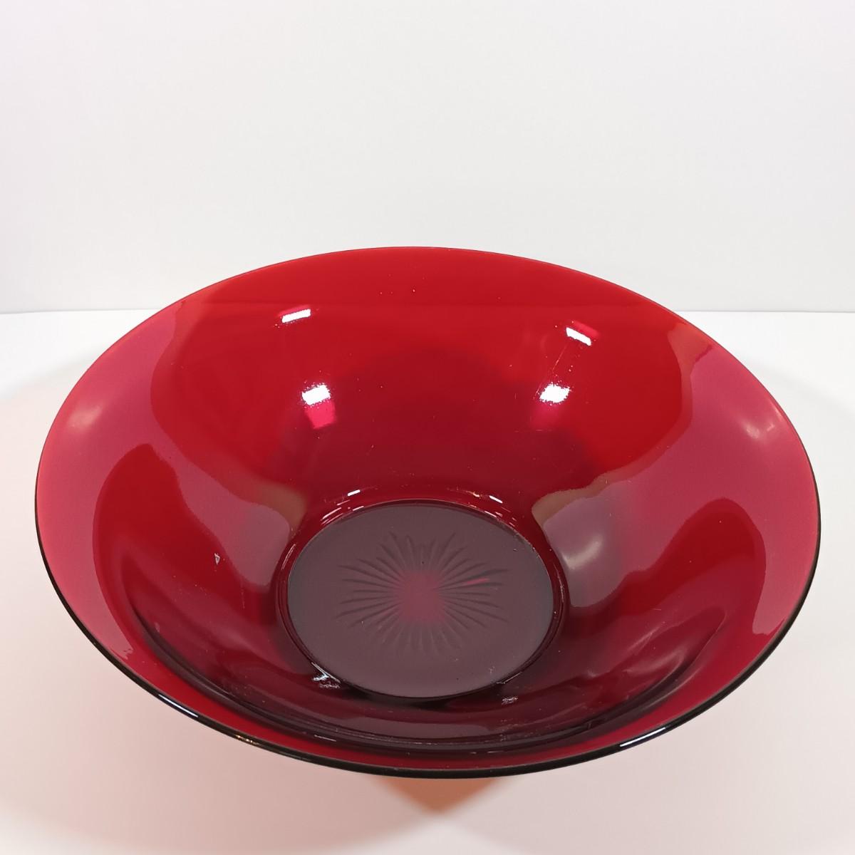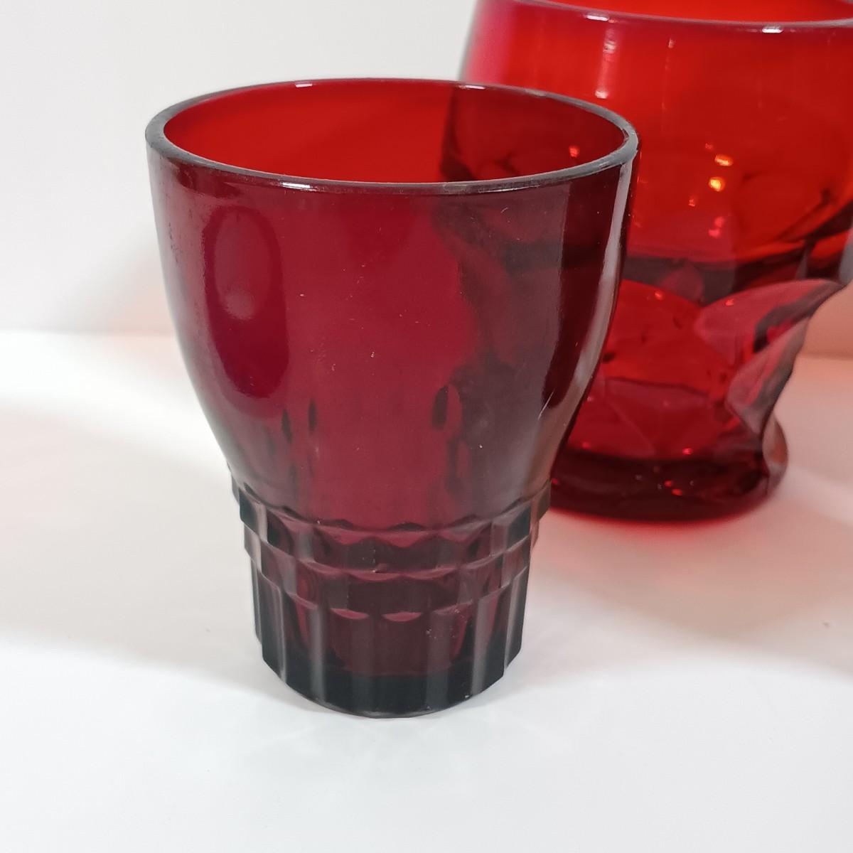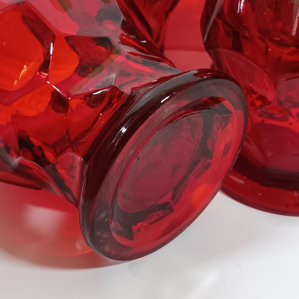 LOT 196: Ruby Red Glass Lazy Susan Inserts, Handled Serving Saucers, Bowl, Vases & Tumblers
