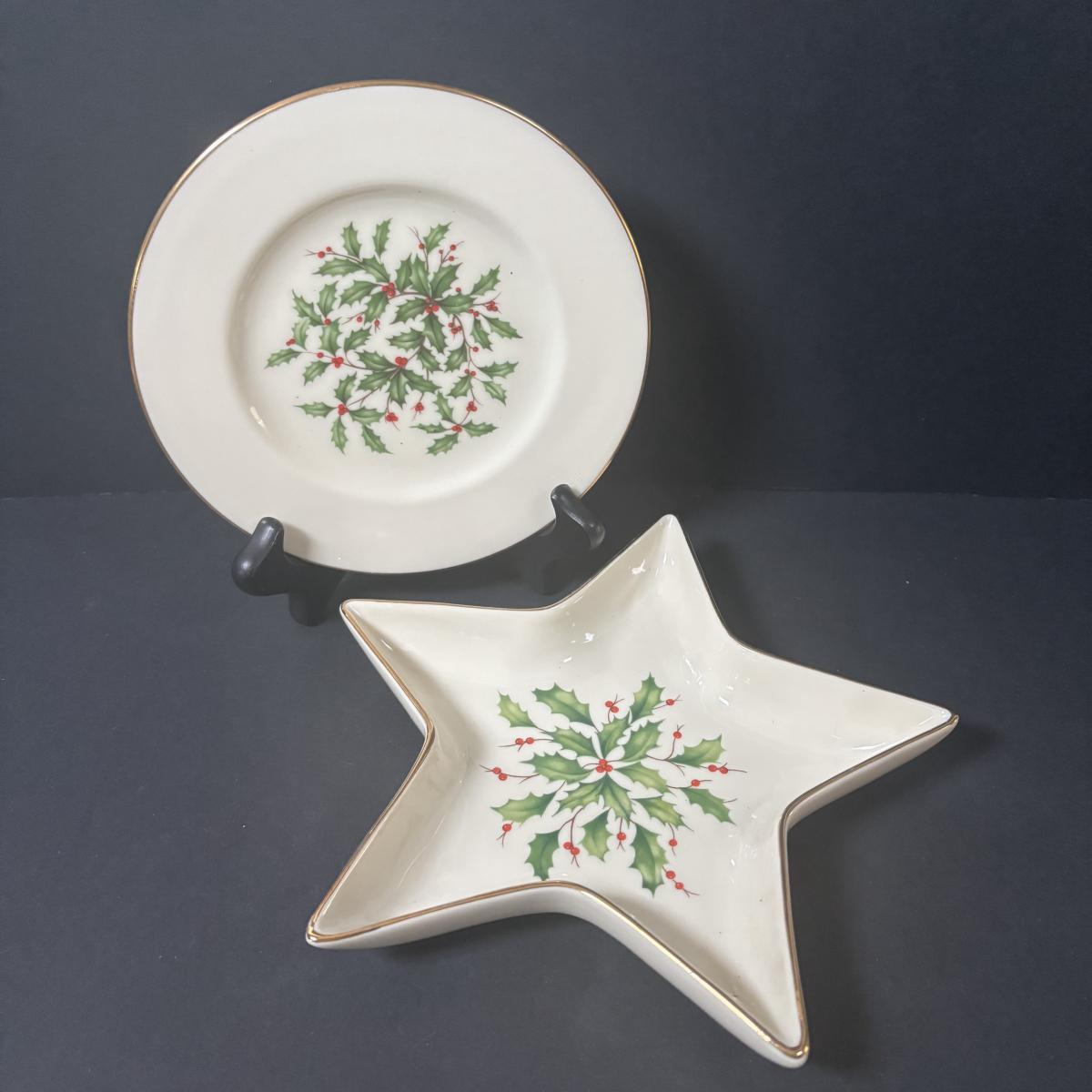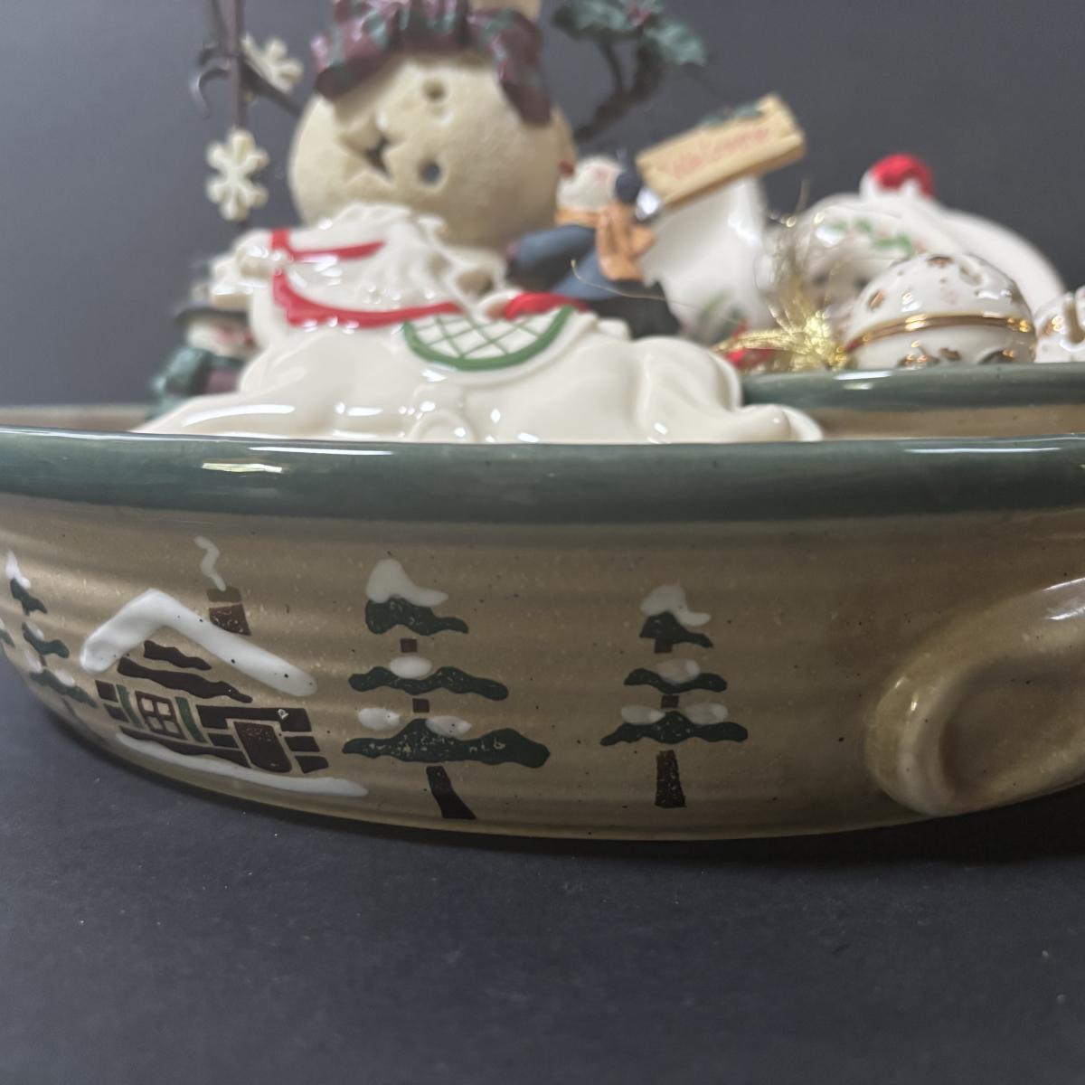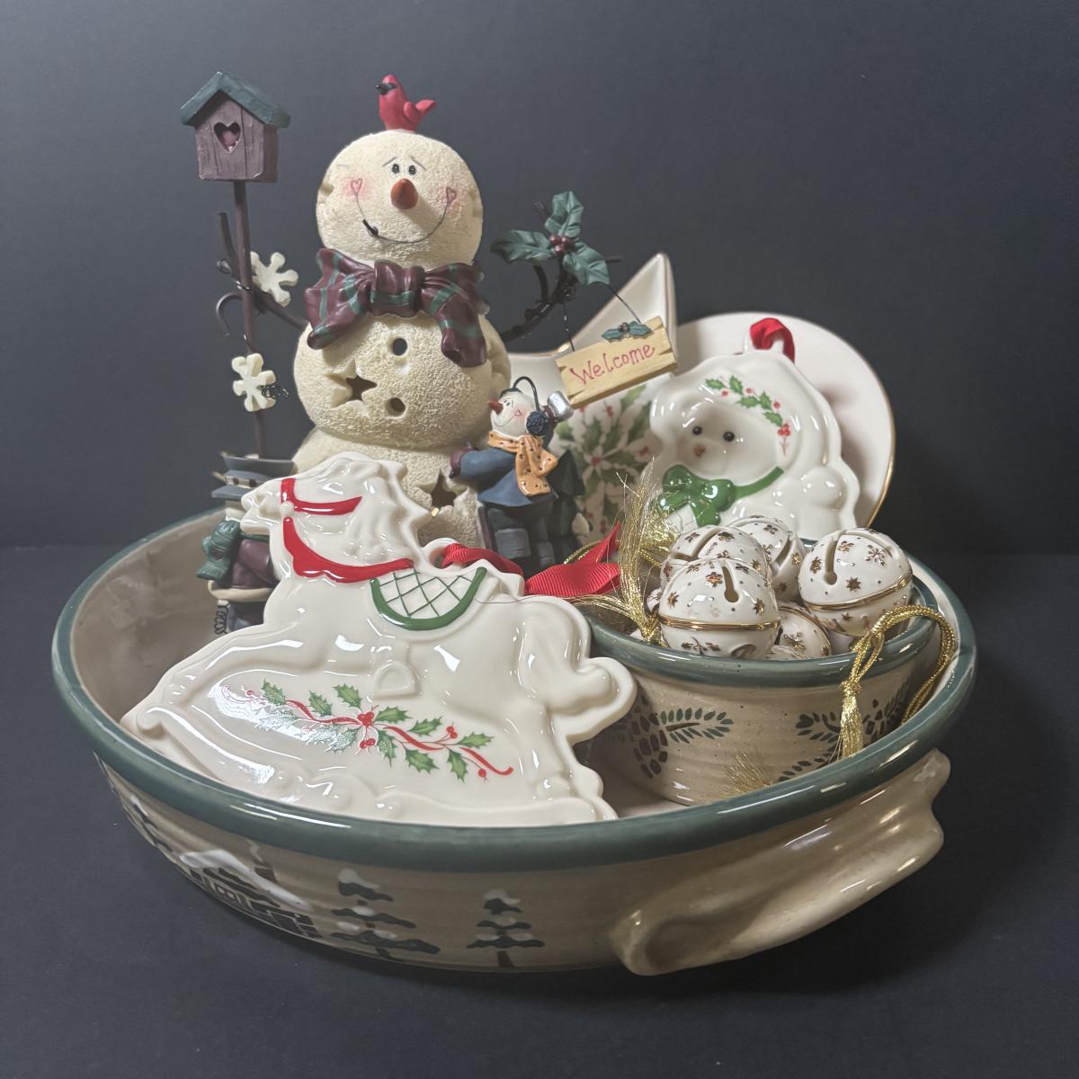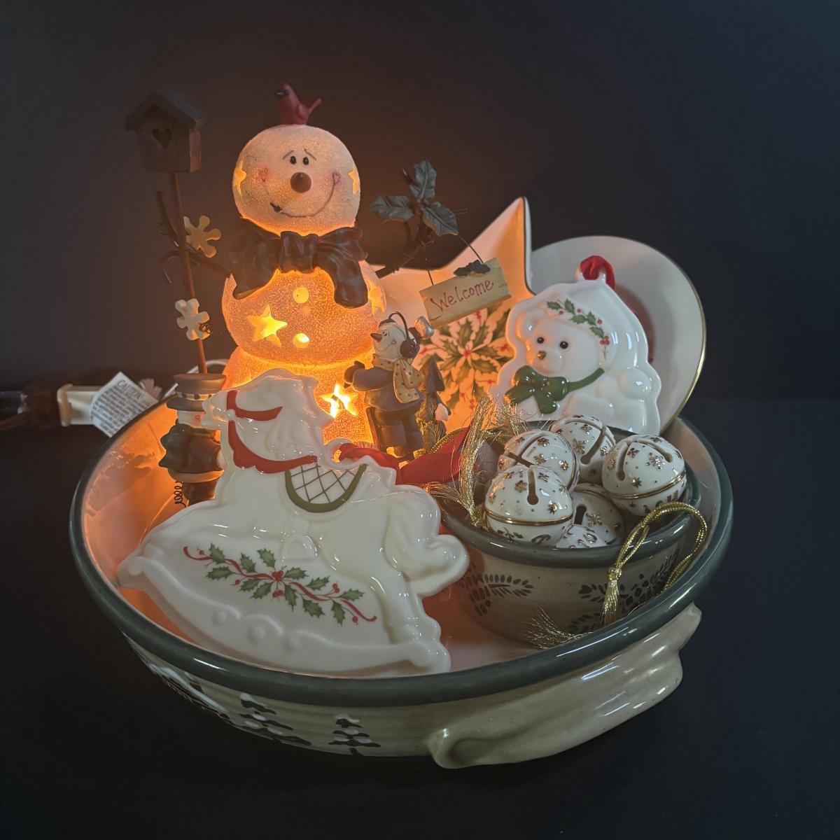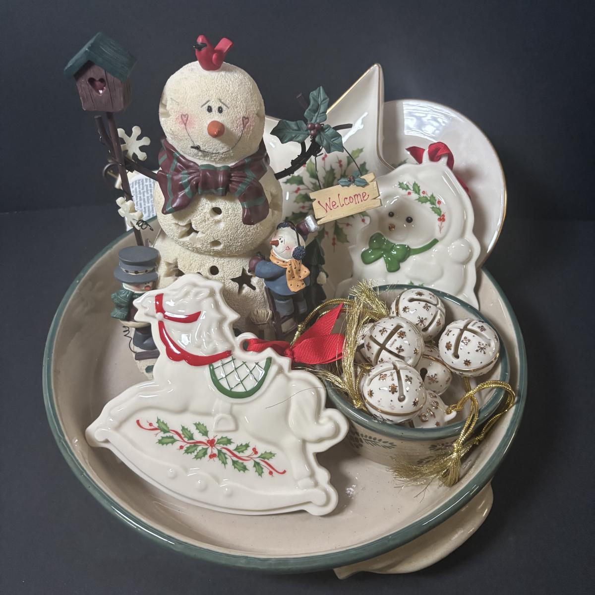 LOT 221: Lenox Jingle Bell Ornaments, Rustic Sonoma Lodge Chip n Dip Set, Light-up Welcome Snowman, Lenox Holly & Berries Star Dish along with More.