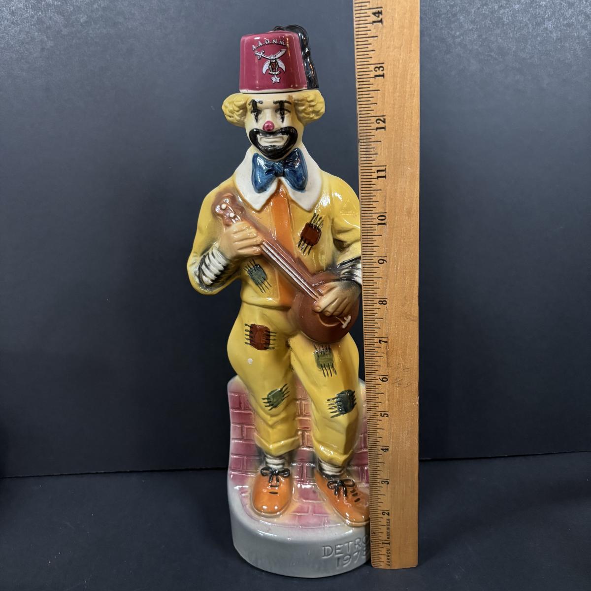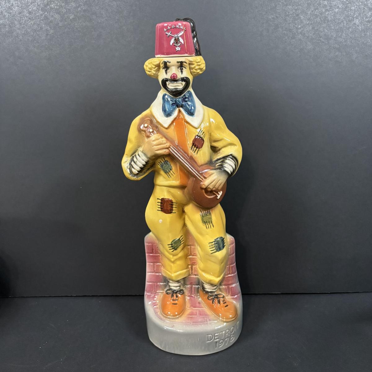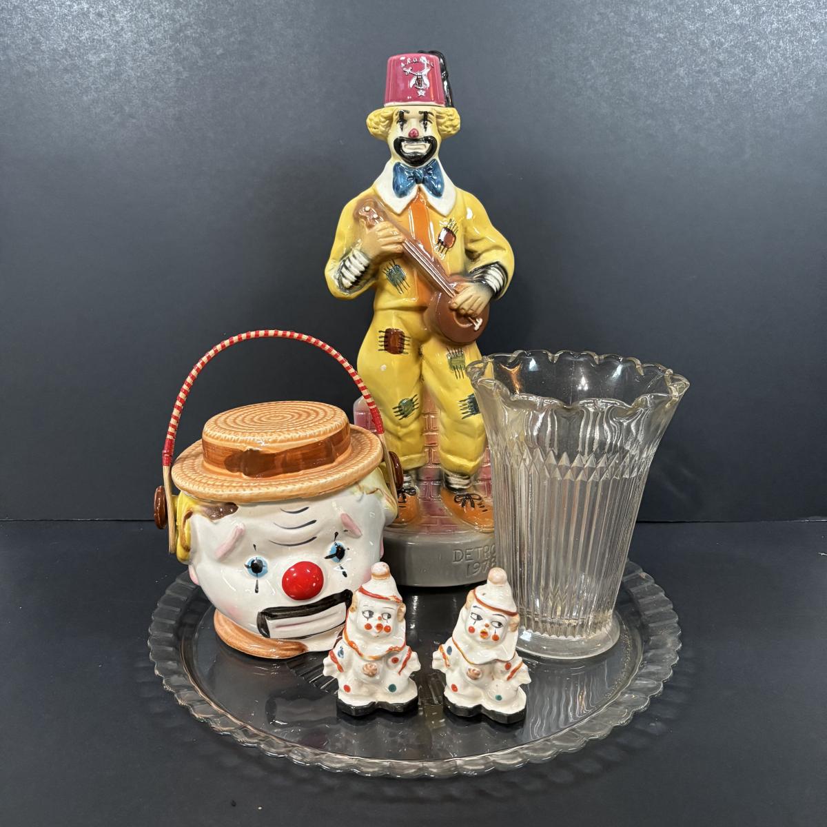 LOT 230: Ezra Brooks Shriner Clown Decanter, Sad Clown Biscuit Jar, Salt /Pepper Clowns and More