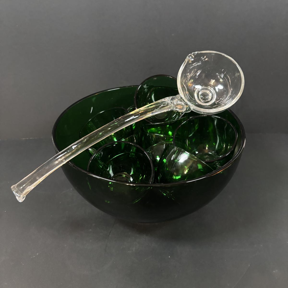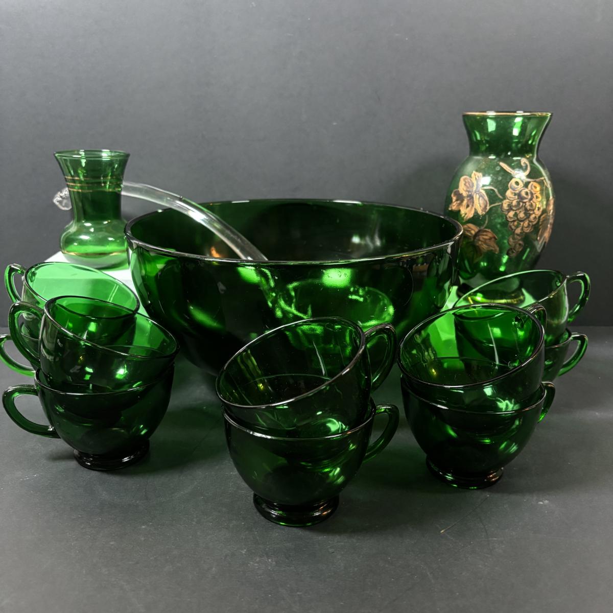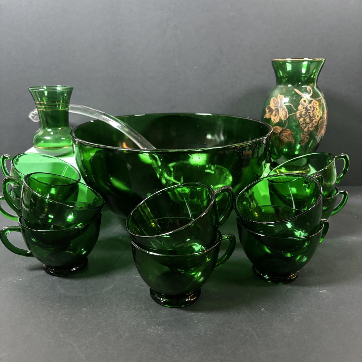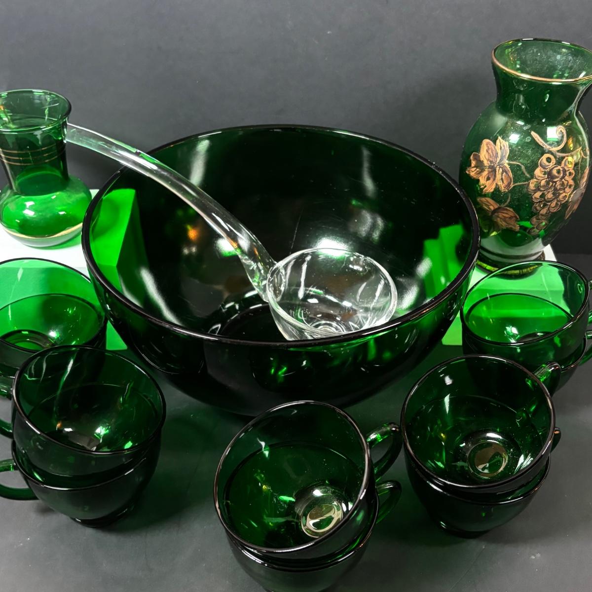 LOT 233: Forest Green Punch Bowl Set w/Glass Ladle along with Emerald Green Vases