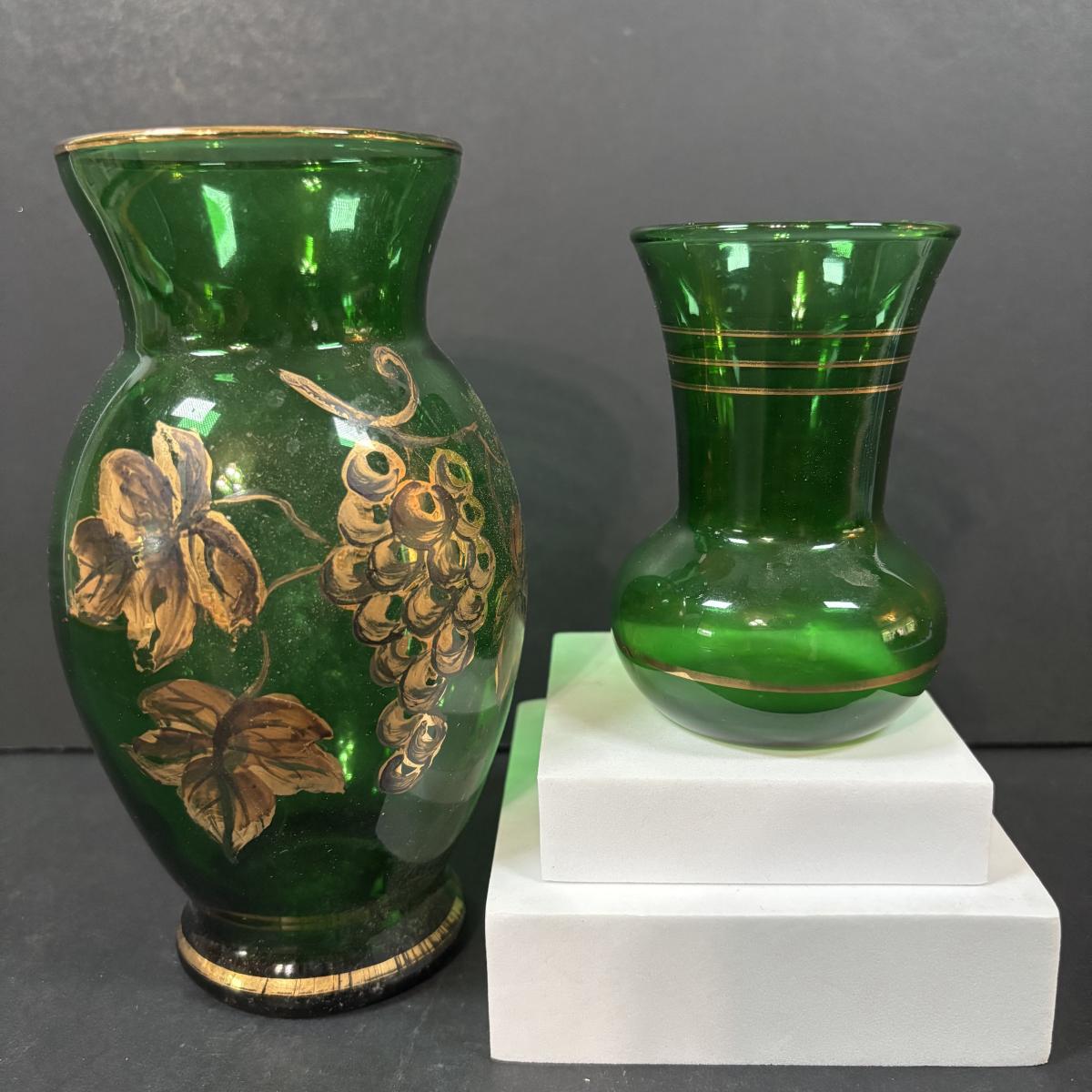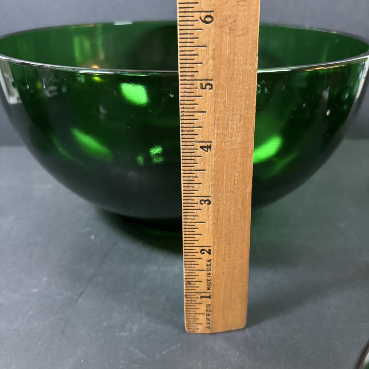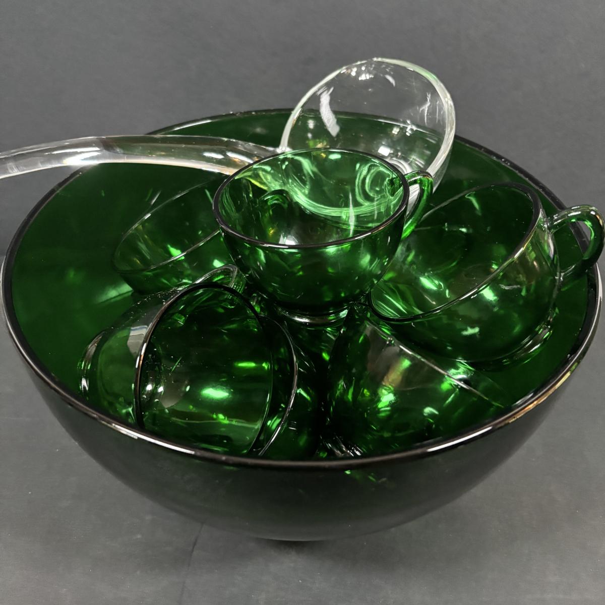 LOT 233: Forest Green Punch Bowl Set w/Glass Ladle along with Emerald Green Vases