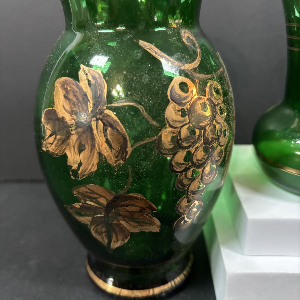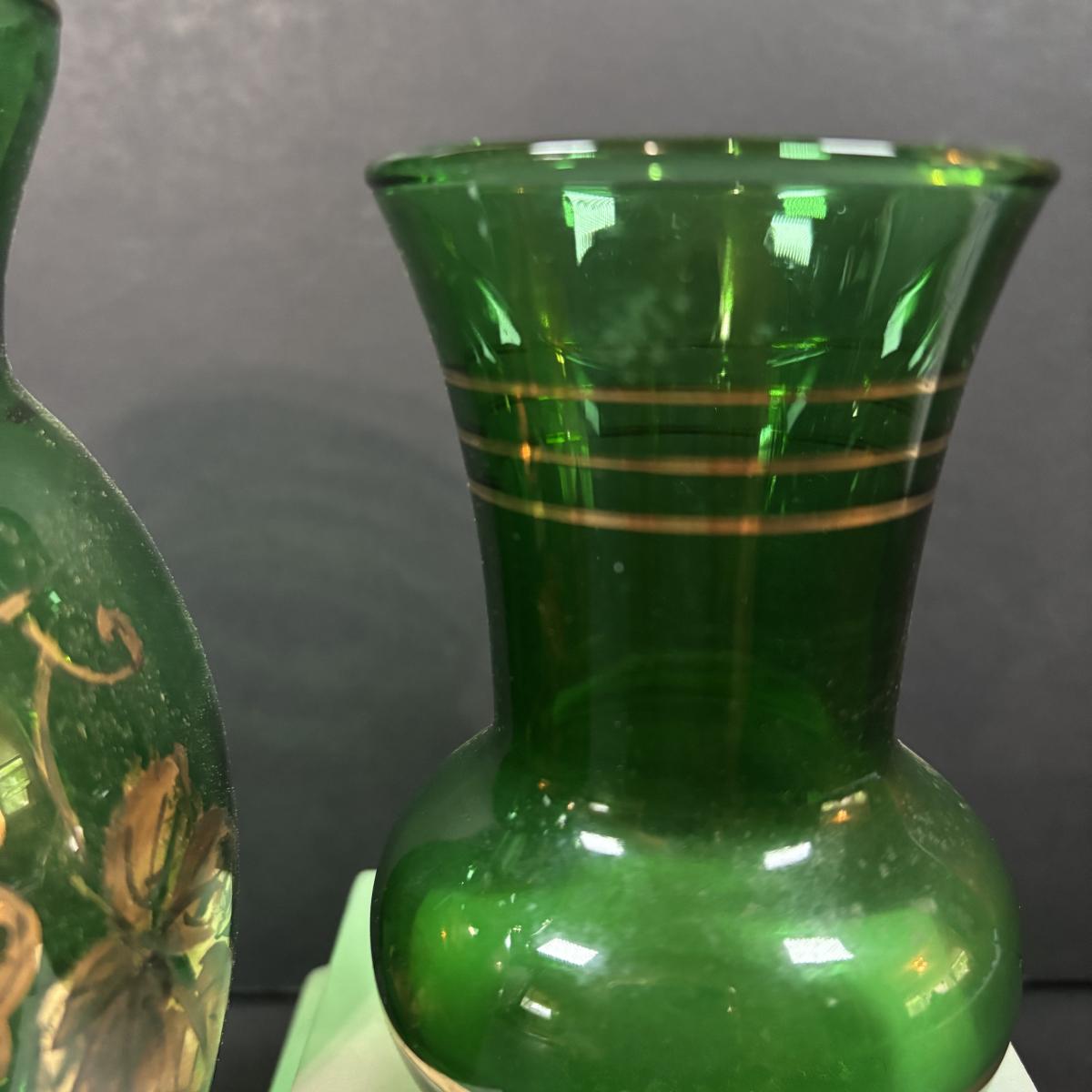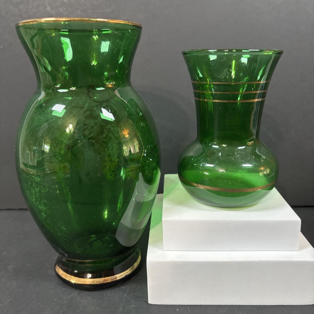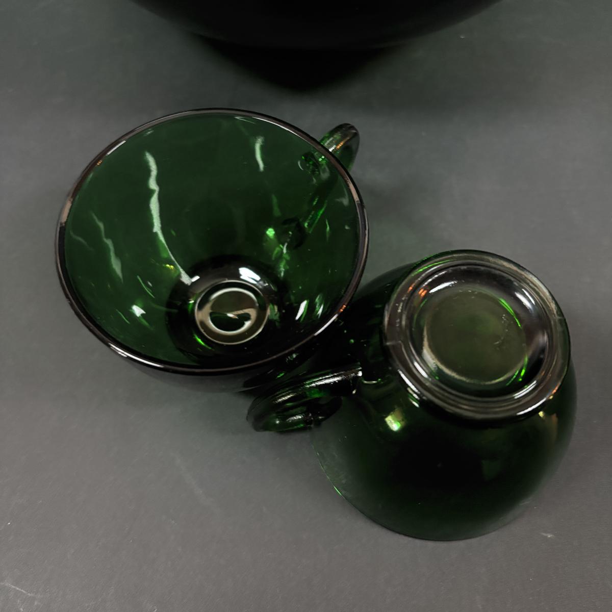 LOT 233: Forest Green Punch Bowl Set w/Glass Ladle along with Emerald Green Vases