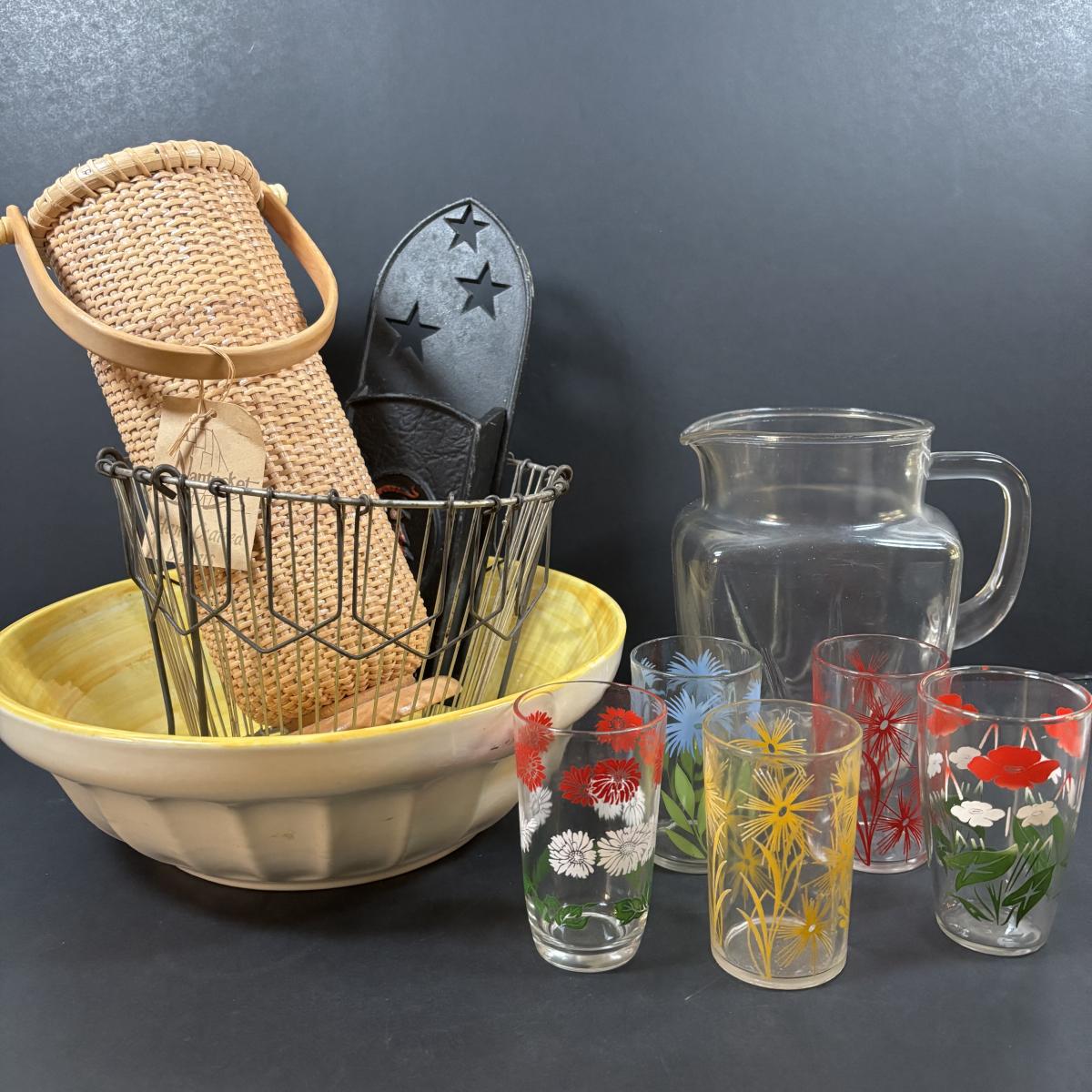 LOT 241: Yellow Swirl Bowl USA, Nantucket Hand Crafted Basket, Swanky Swig Kraft Juice Glasses & More