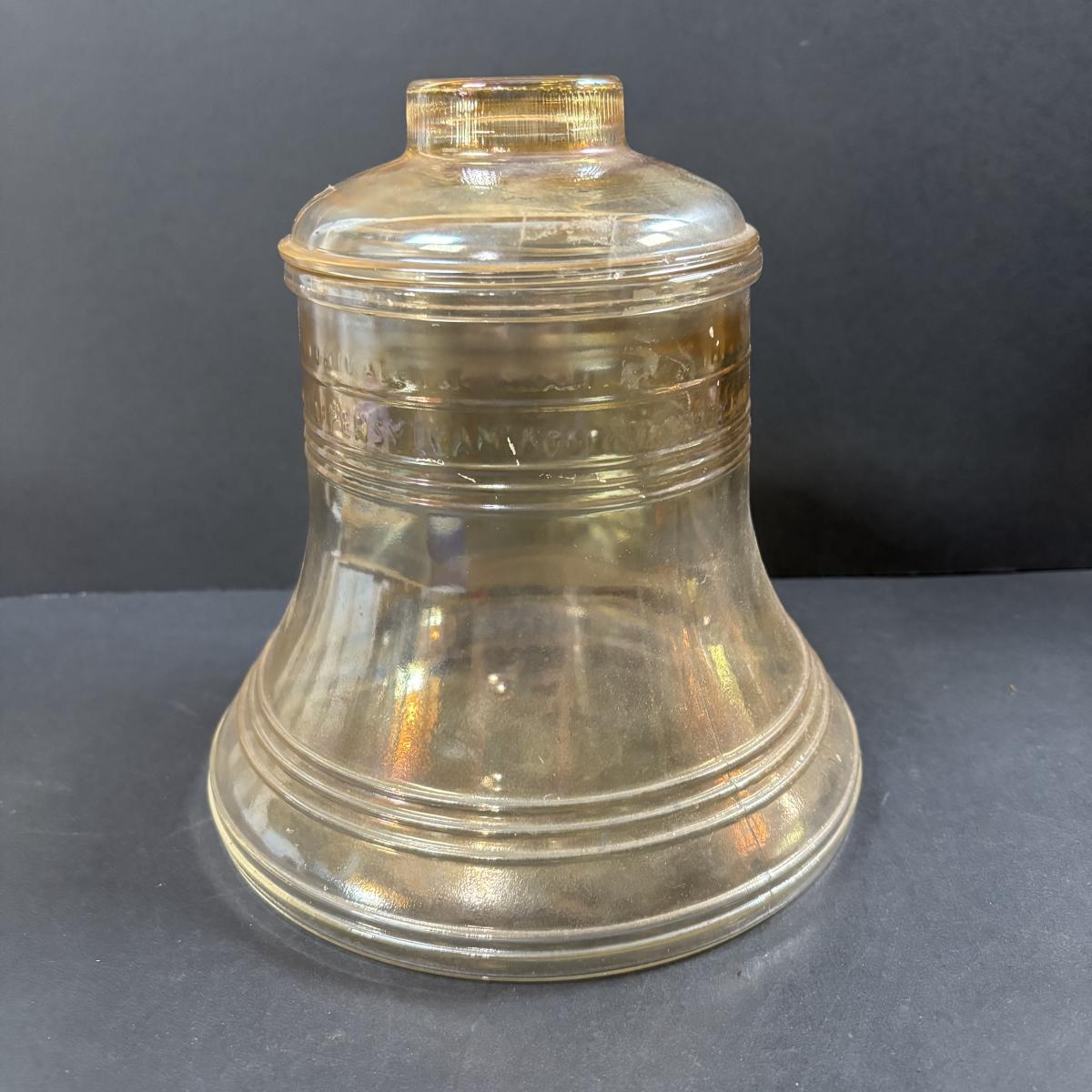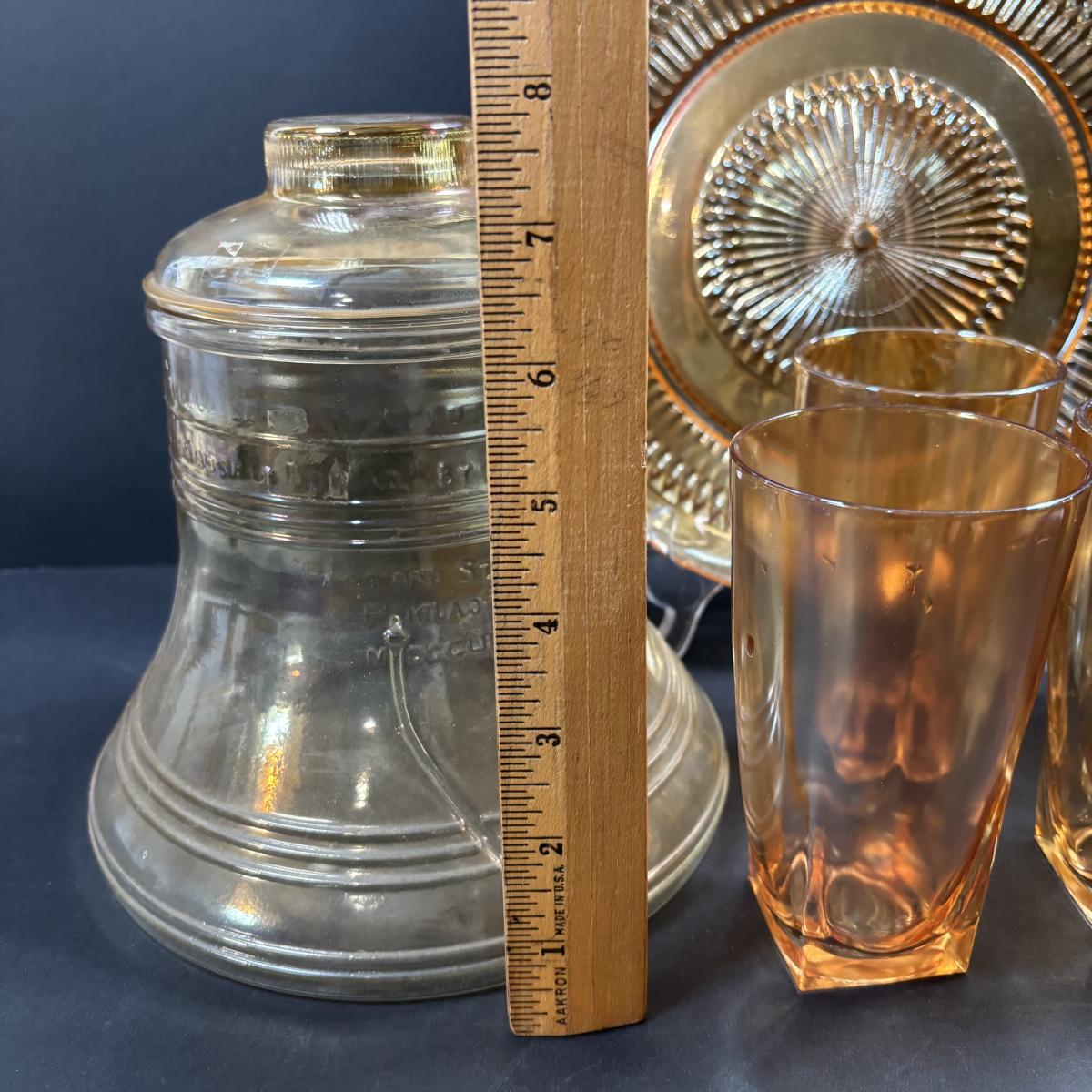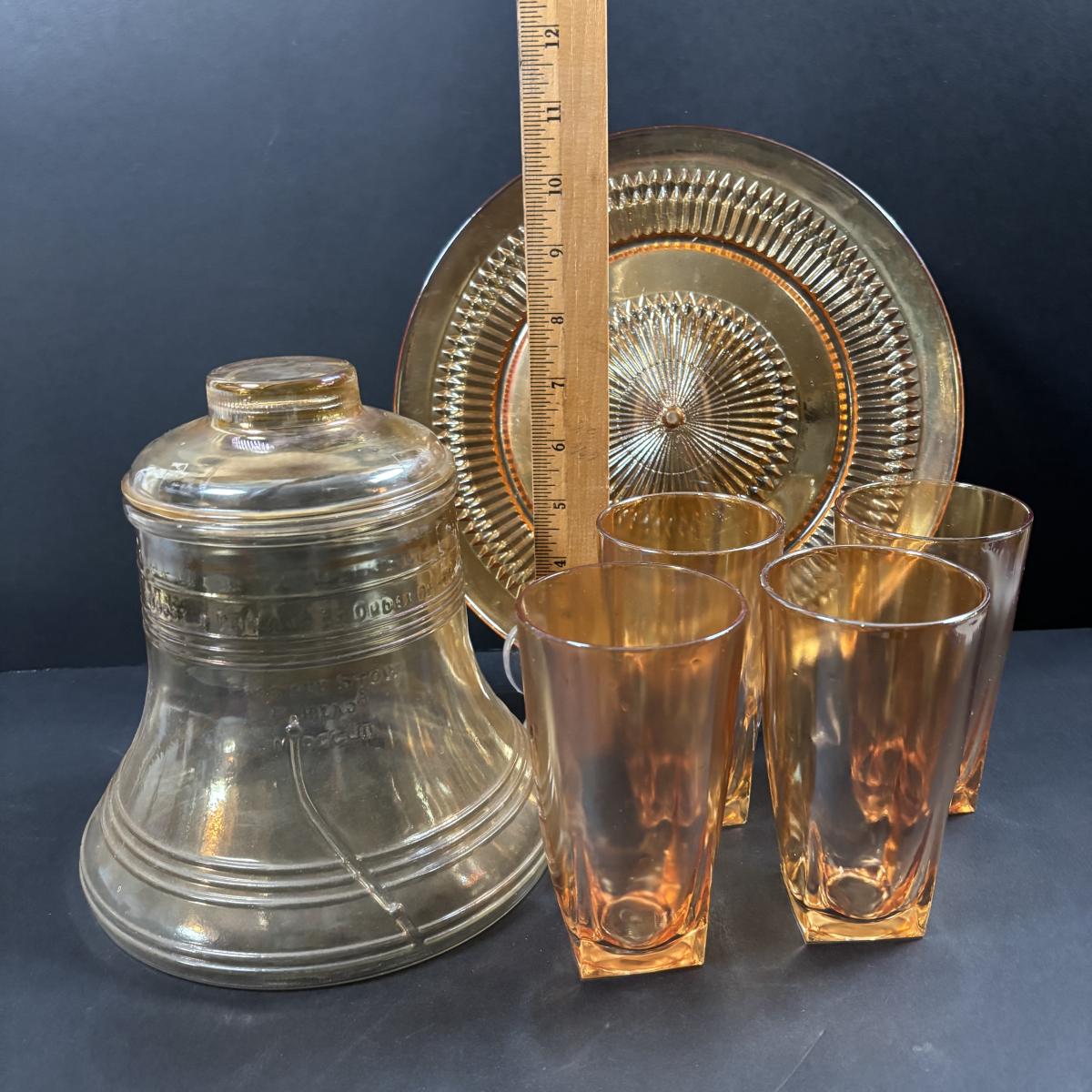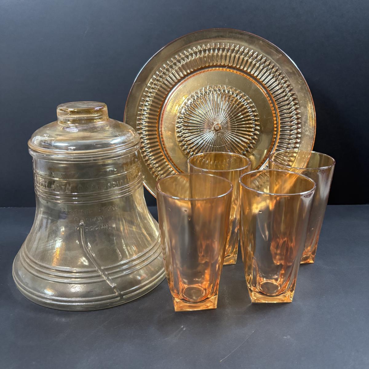LOT 244: Bicentennial Amber Glass Liberty Bell Cookie Jar, Iridescent Marigold Tumblers & Serving Plate
